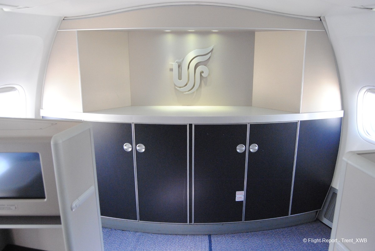 The large first class cabin, consisting of 12 Zodiac Aerospace Venus suites, arranged in 1-2-1 layout in 3 rows (rows 1 to 3), is located in front of 2L/R doors. As was said before, these suites are designed for installing into the widest part of B747 or B777 fuselages and thus don't fit into the tapered nose of B747. Comparing to China Eastern B77W first class suites, I'd say that MU's product is definitely superior, but CA's product also looks very solid.