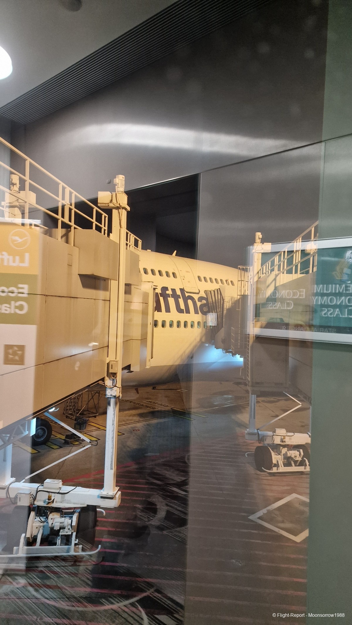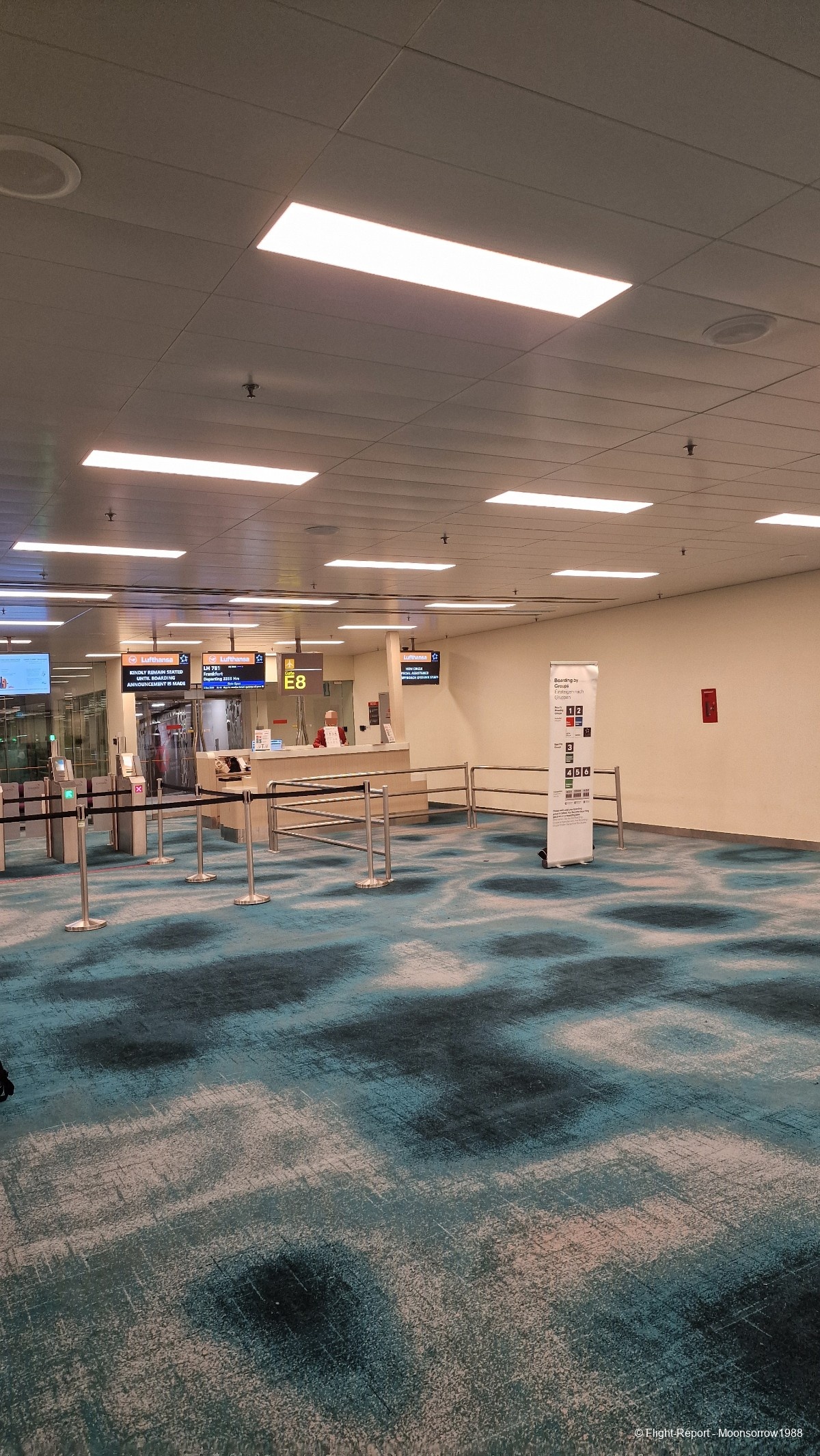 Since Lufthansa's Boing 747-400 is easily recognizable, I didn't even needed to look at the gate number. I simply spotted the aircraft taxiing and went where it gated! In Singapore, the security checks are done shortly before boarding, at the gate. I found this process interesting, but in this case annoying, as the 747 is quite a big airplane Security personal wasn't very friendly either.