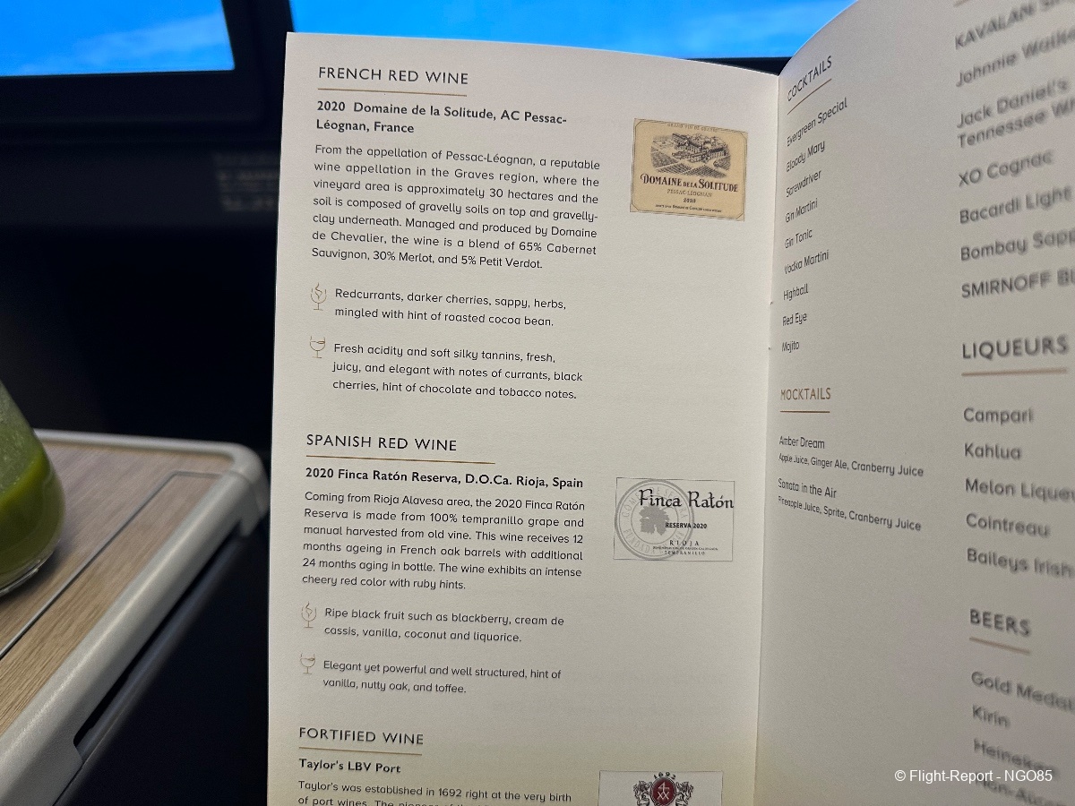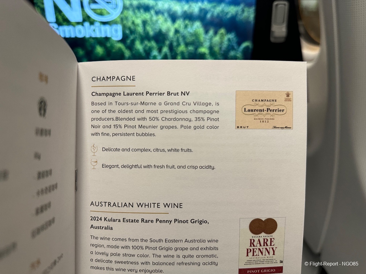The tray is laid down, which contains all meal elements. Wines were then poured at the seat by a second FA.
