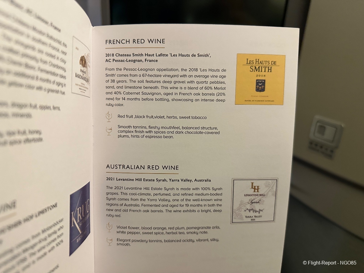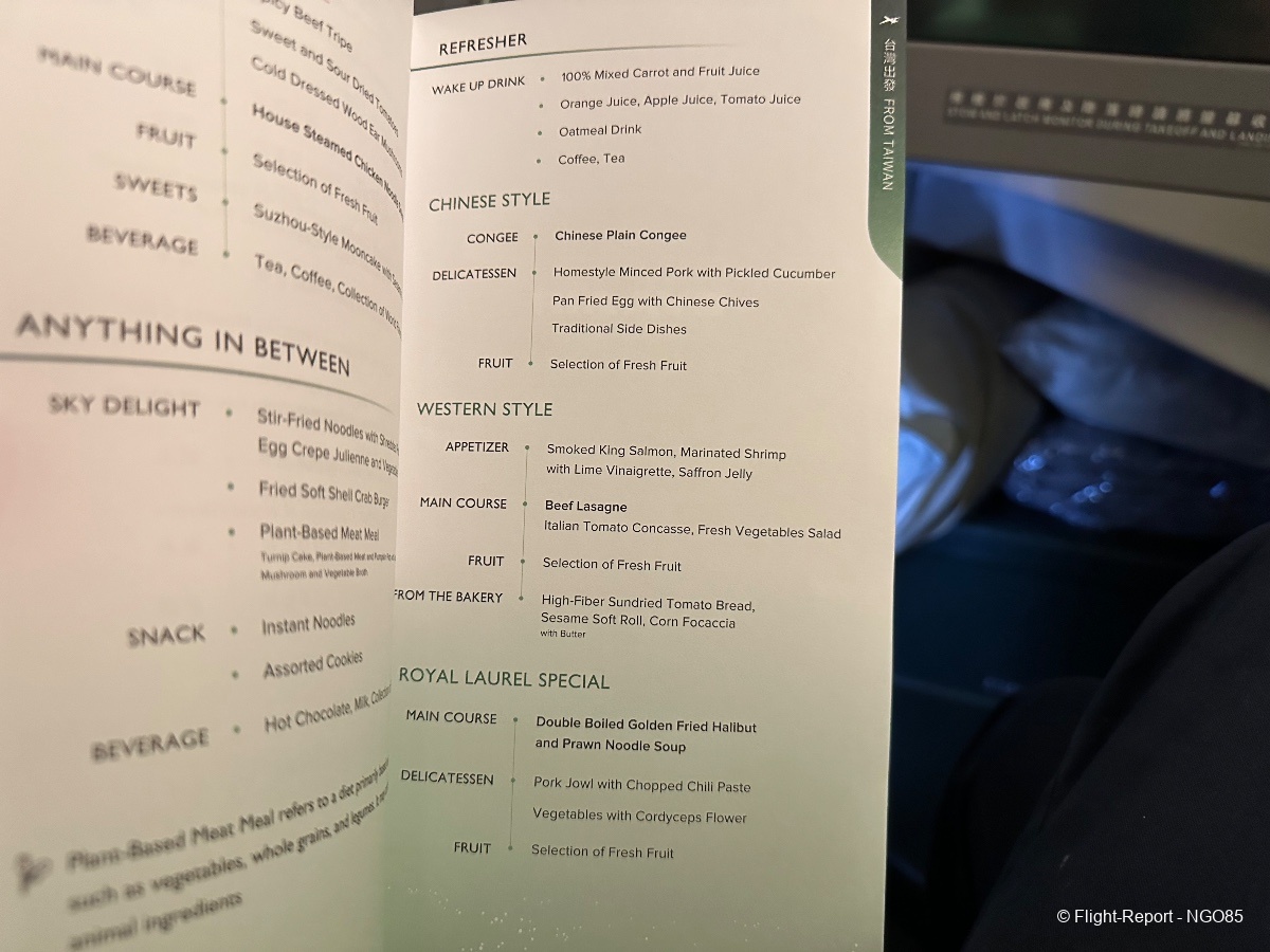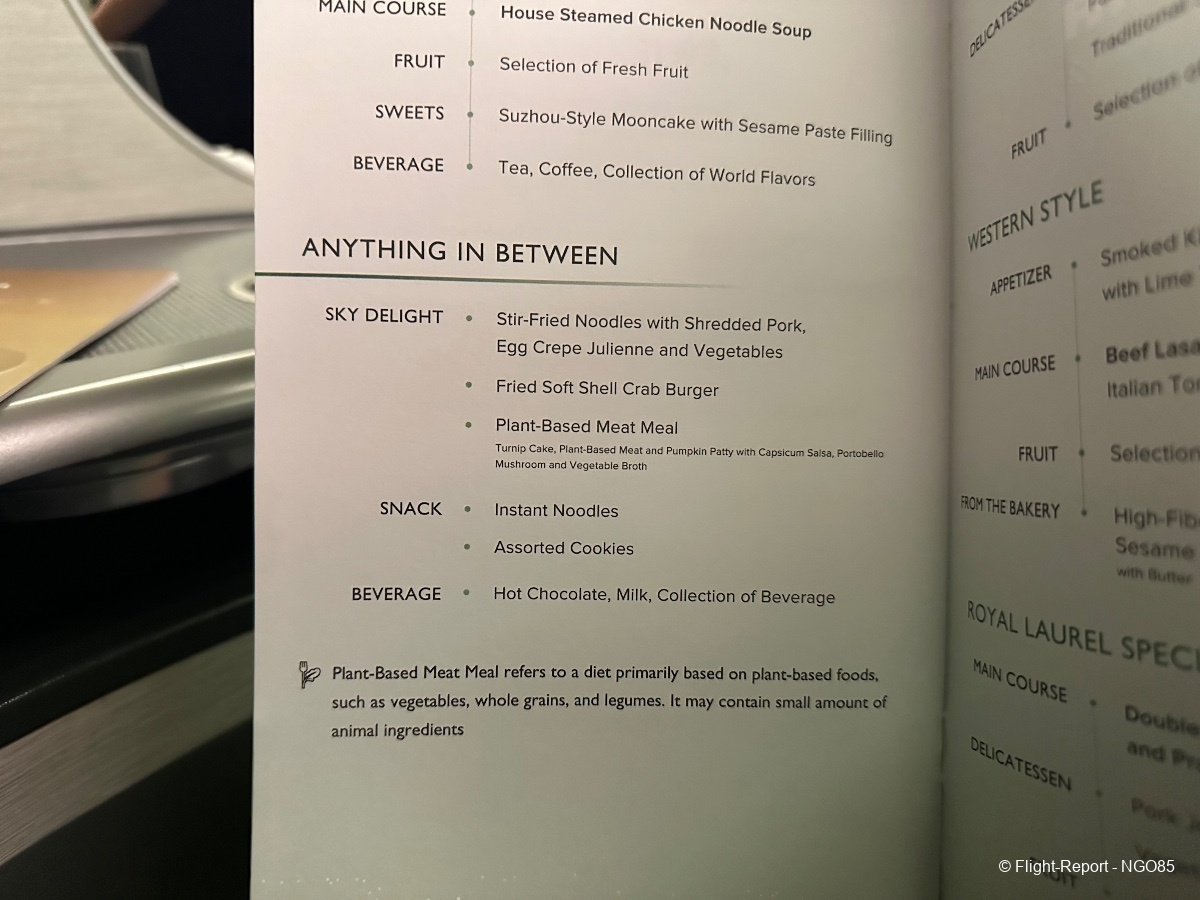 Since this flight departs around midnight, we do not get the full meal service and get an abbreviated dinner (no amuse bouche, soup, salad, or cheese courses). There are mid-flight snacks and meals available to order. Before arrival, we have the standard breakfast/lunch offering with giving you the range from a lighter Chinese breakfast or soup to a heavier beef lasagna.