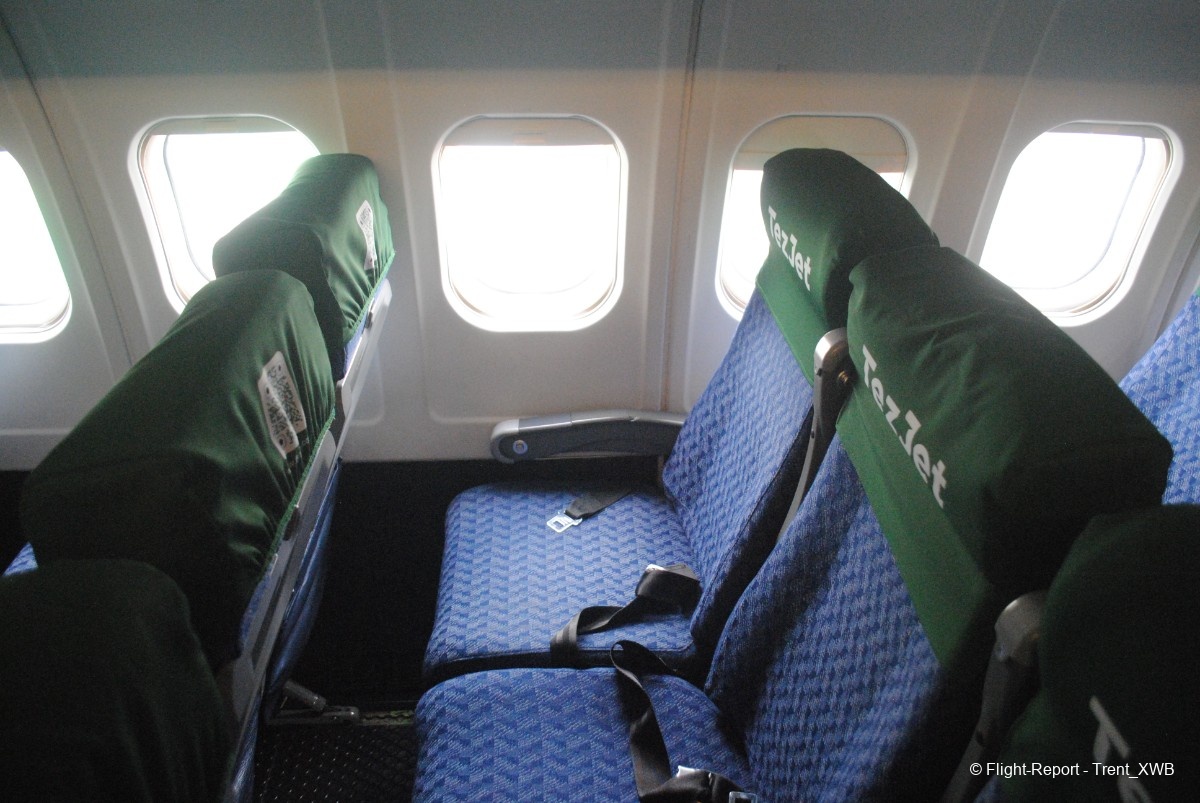 The seat has green fabric cover (instead of antimacassar), tray table and "leather" seat pocket. The row pitch is more than OK for this short flight - two heads above the abysmal row pitch in RJ85.