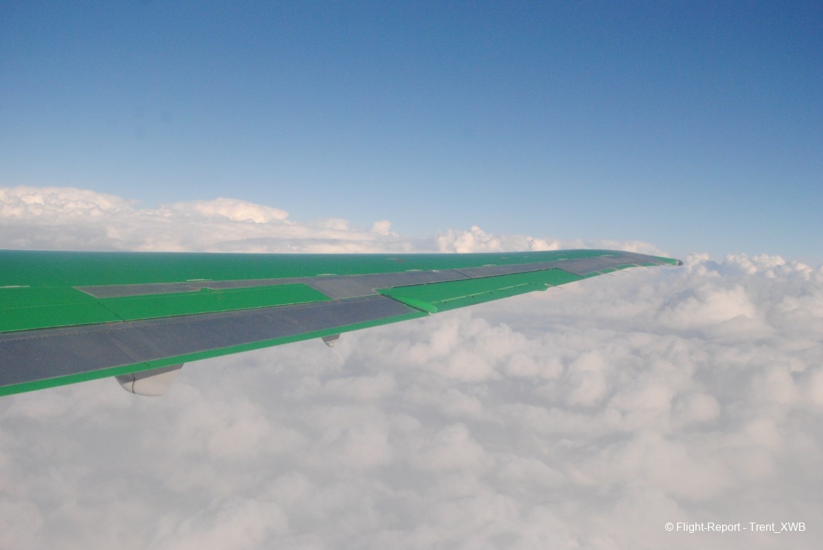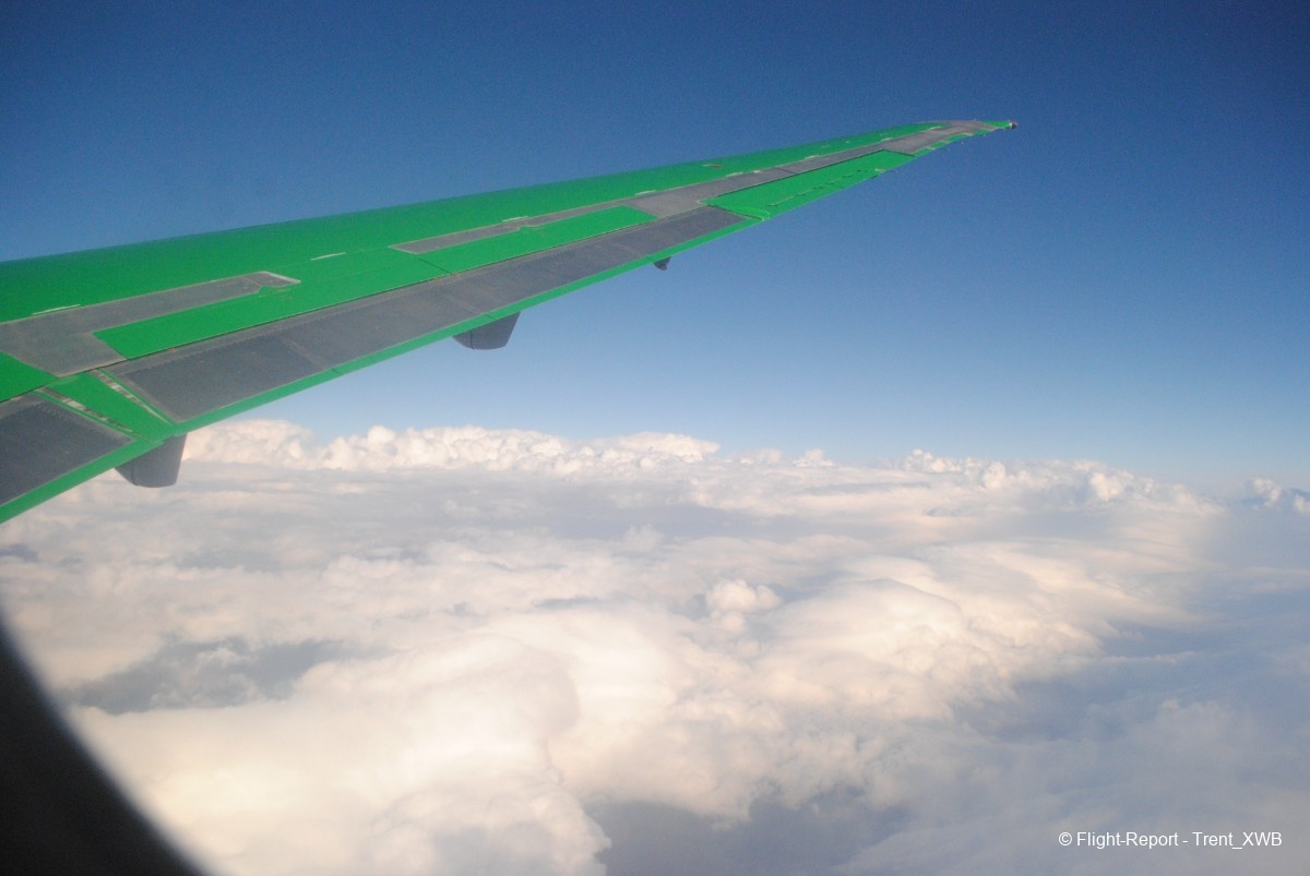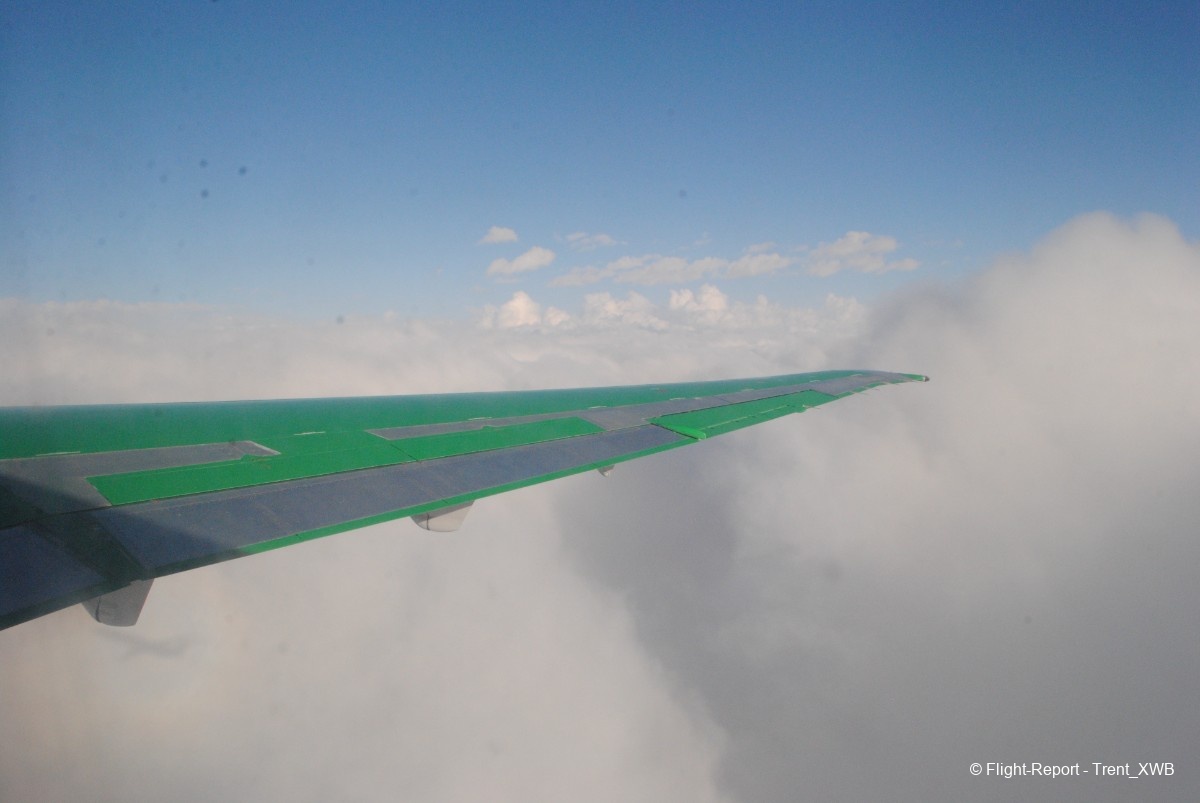 The last bit of the blue sky before diving into the clouds as we're starting our descent.