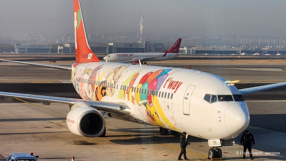 Some of the GMP departures waiting at the gate. There were some interesting traffic, like the endangered Air Busan A320, Jin air 737 in the old livery with eyebrows, T'way 737 with the Pokémon special livery HL8306, and the Korean Air A321neo. It hadn't been long since they debuted their A321neos, so it was pretty awkward seeing the NEO in the Korean Air colors. People have been giving their thoughts on the livery on the NEO and how awkward the silver cheat line is or how the tail logo is a bit misplaced, but I personally have no issue with them. I just would've loved the mask on the cockpit windows.