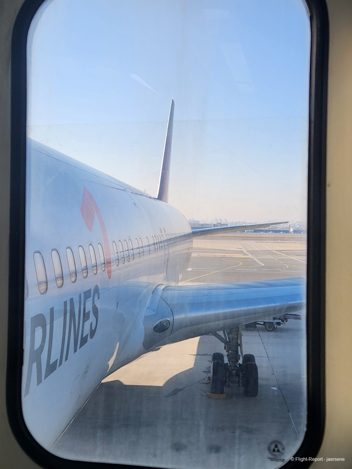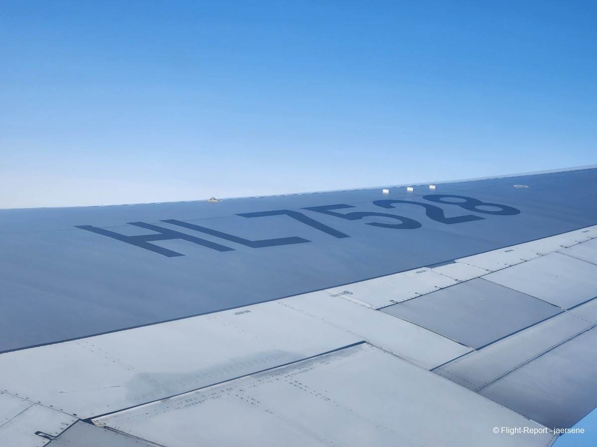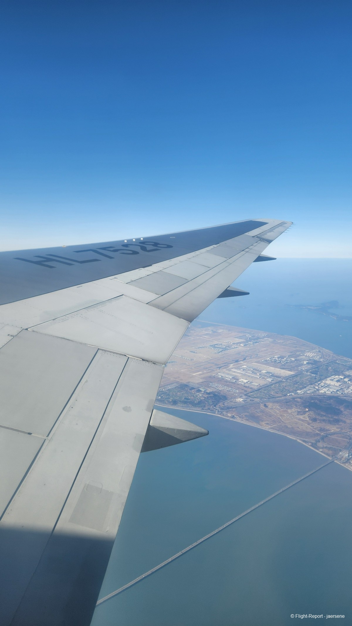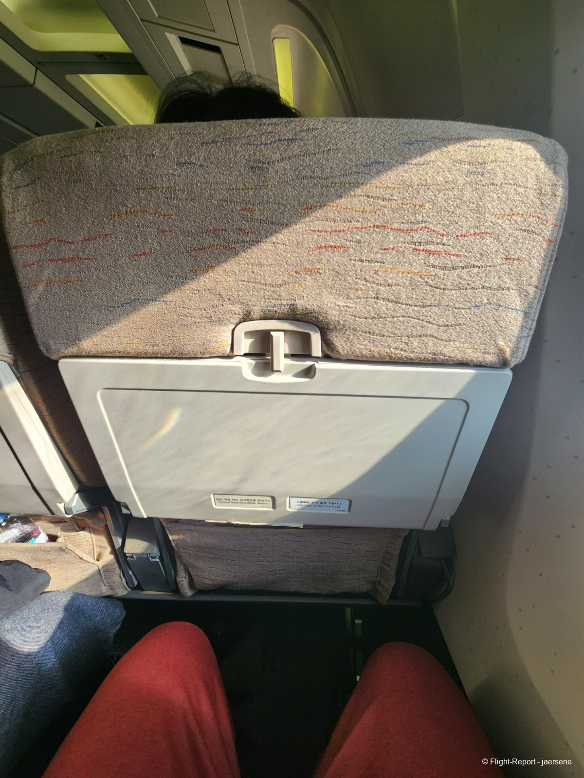 I boarded through the L1 door and found my way to seat 38K. I had carefully searched through the internet to find my ideal window seat, which came to be 38K. My ideal window seat is just aft of the wing, where I can see the land clearly and be able to see the aft of the wing, the workings of the flight control systems. Also, if you're on an aircraft registered in South Korea, you can see the registration on the right side wing. I like to sit on that side just to have the registration in the picture.