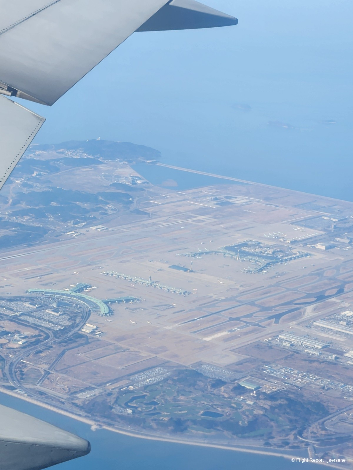 We took off from GMP on runway 32L and turned left to head south on our BULTI 2T departure. As you cans see from the picture, if you're lucky with good weather and visibility, you'd be able to see ICN from above. Also, if the wind is westerly, it seems to be an indication of good weather. When the winds were easterly, I found the weather to be bad. I was hoping to see actual planes takeoff or land, but my camera wasn't powerful enough. Maybe I didn't look hard enough.