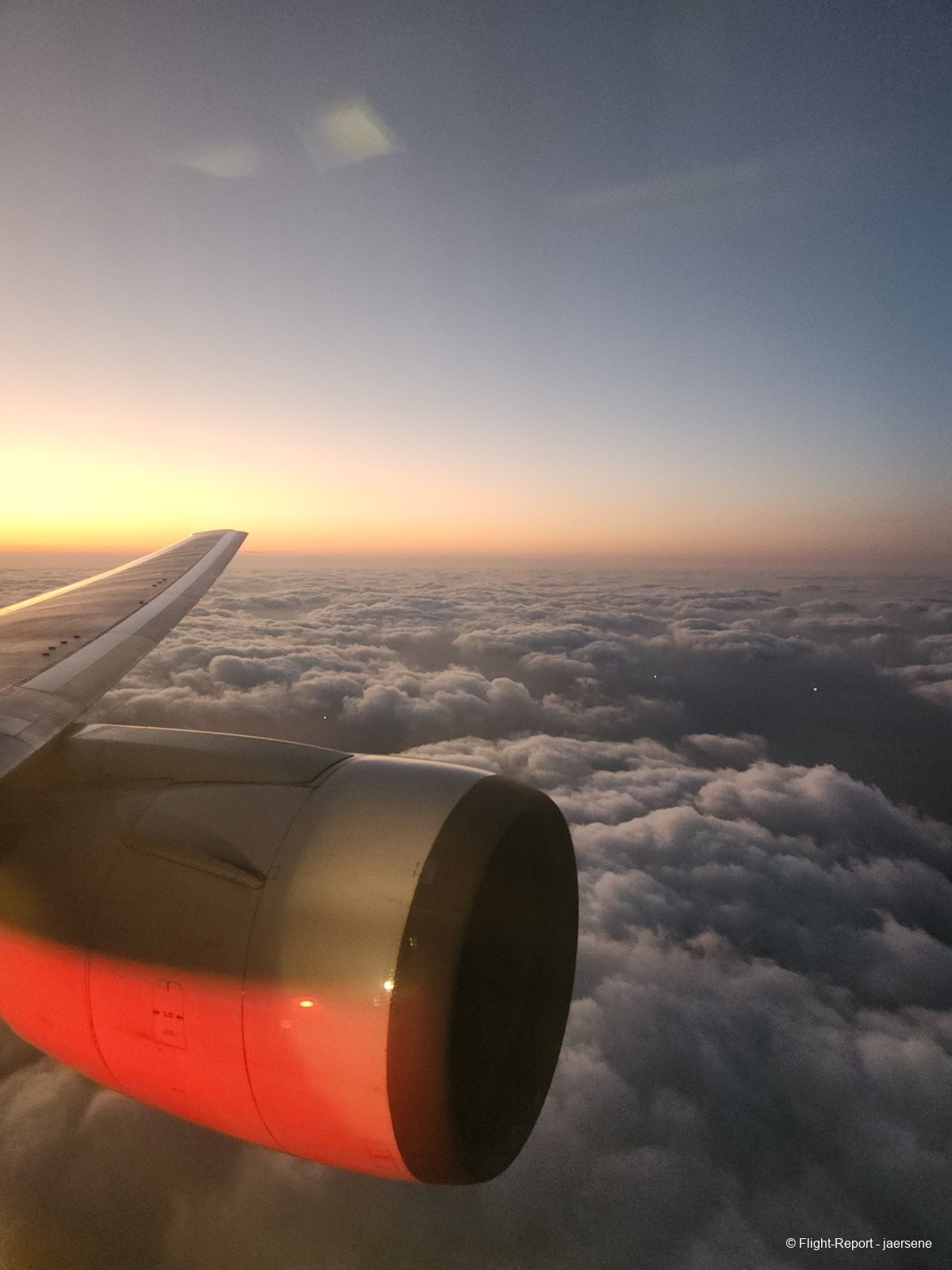 View form my seat, 22A. I carefully selected this seat for two reasons. First, I wanted to get an engine view, as on the outbound leg I was seated aft of the wing. Second, I wanted to be on the left side as I figured I would be flying during sunset, and I wanted to experience it fully. Unfortunately with this delay of an hour, the sunset seems to be in full effect already, but I still managed to get amazing views.