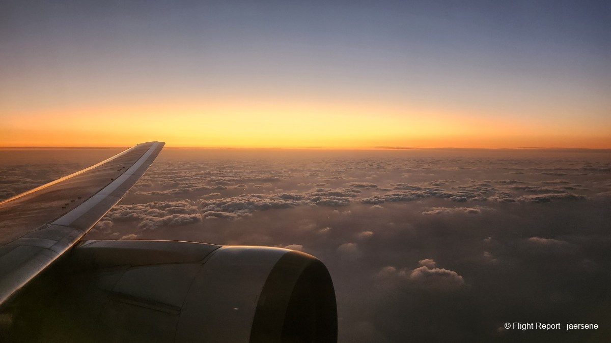 Like this! We took off from runway 07 on the IPDAS 4K procedure and after a bit of cloud surfing, we were greeted to this amazing sight. The redness of the skies with the sun almost set past the horizon mixed with the fluffy clouds covering the surface thanks to the overcast weather of the ground makes this my favorite picture taken from the sky to this date. I was so glad I could've gotten this picture on the 767 before it retired.
