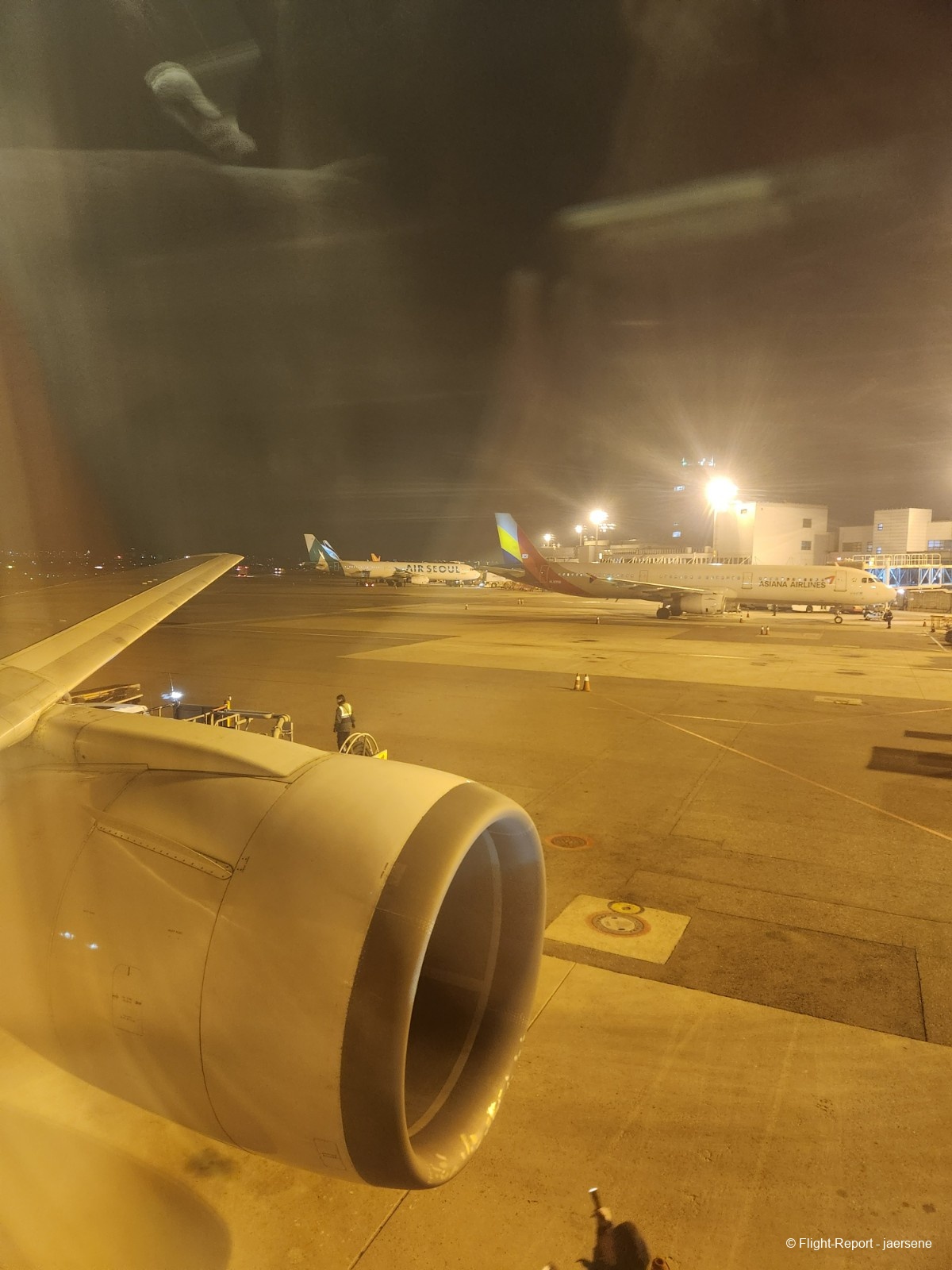 Landed in GMP on runway 32L. The yellow lighting makes things extra classic. I wish the crew would've turned off the lights next to the wall, as it would've made the views even better, but it wasn't to be. I wonder if it is up to the crew or there is a manual about that.