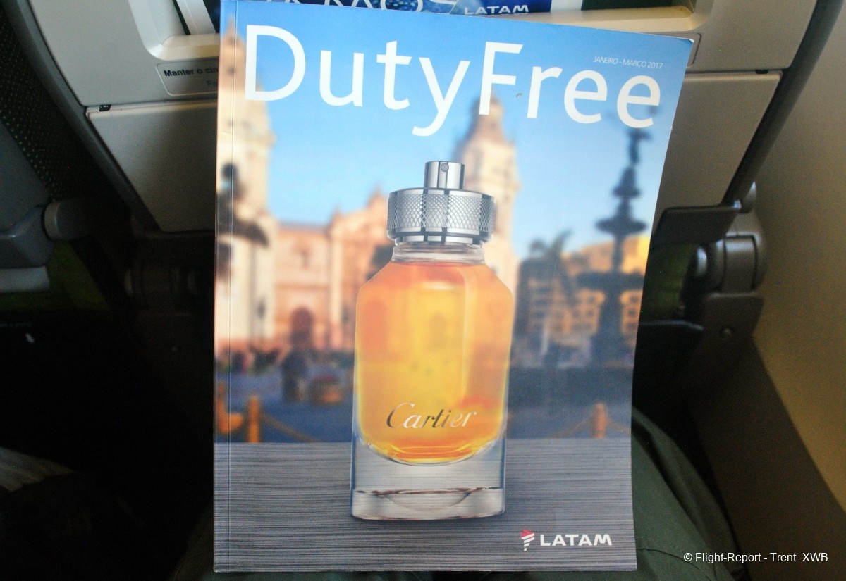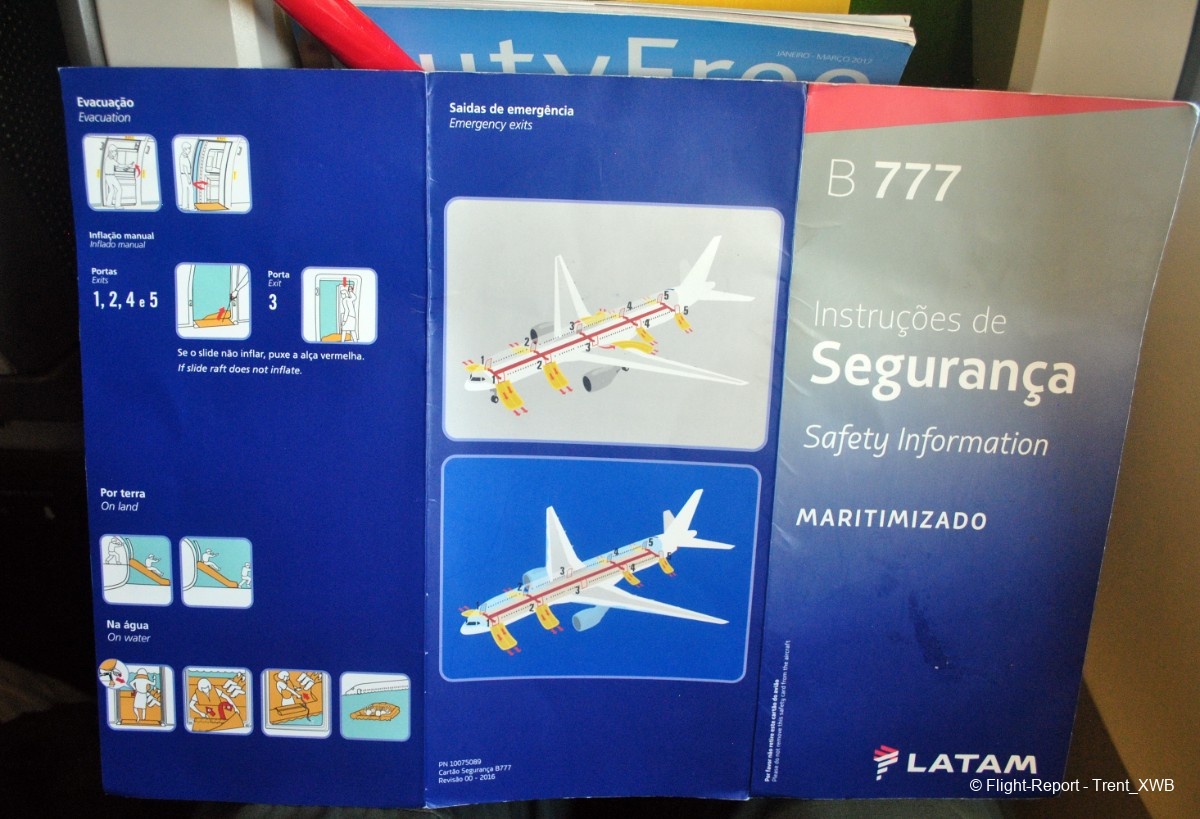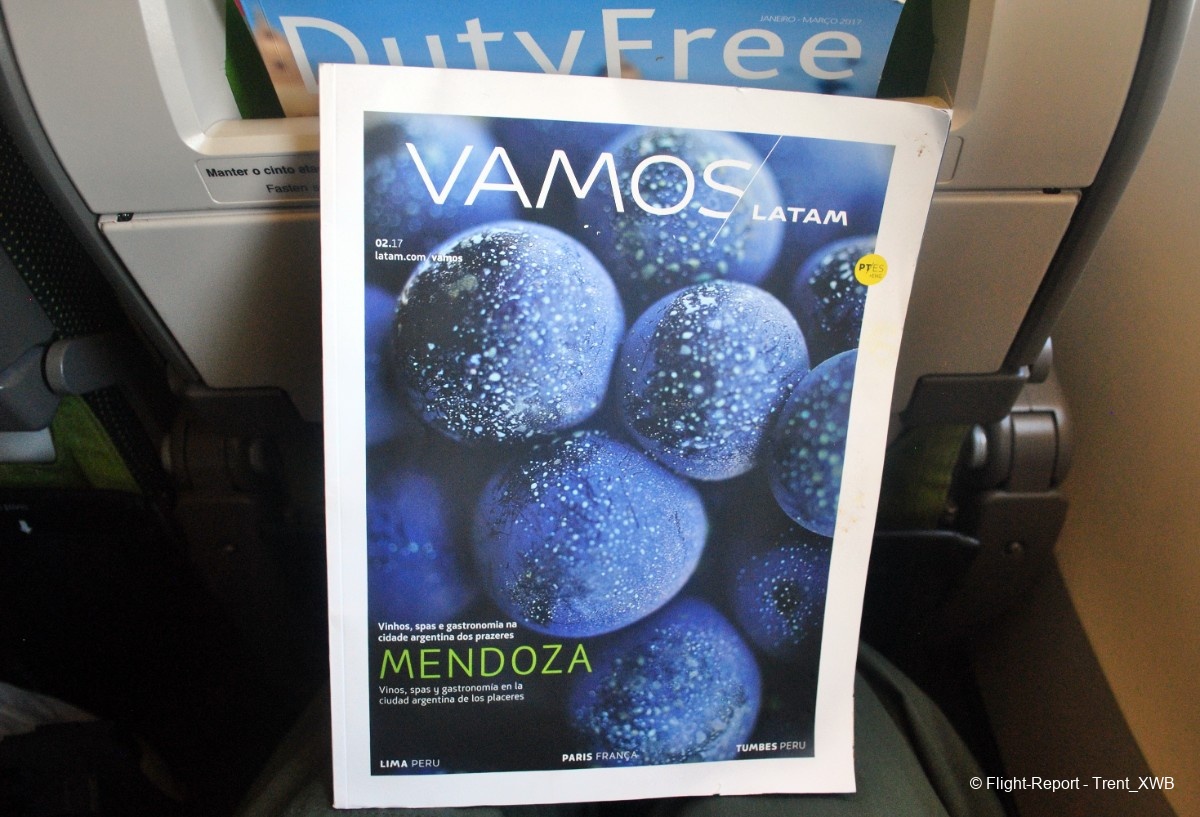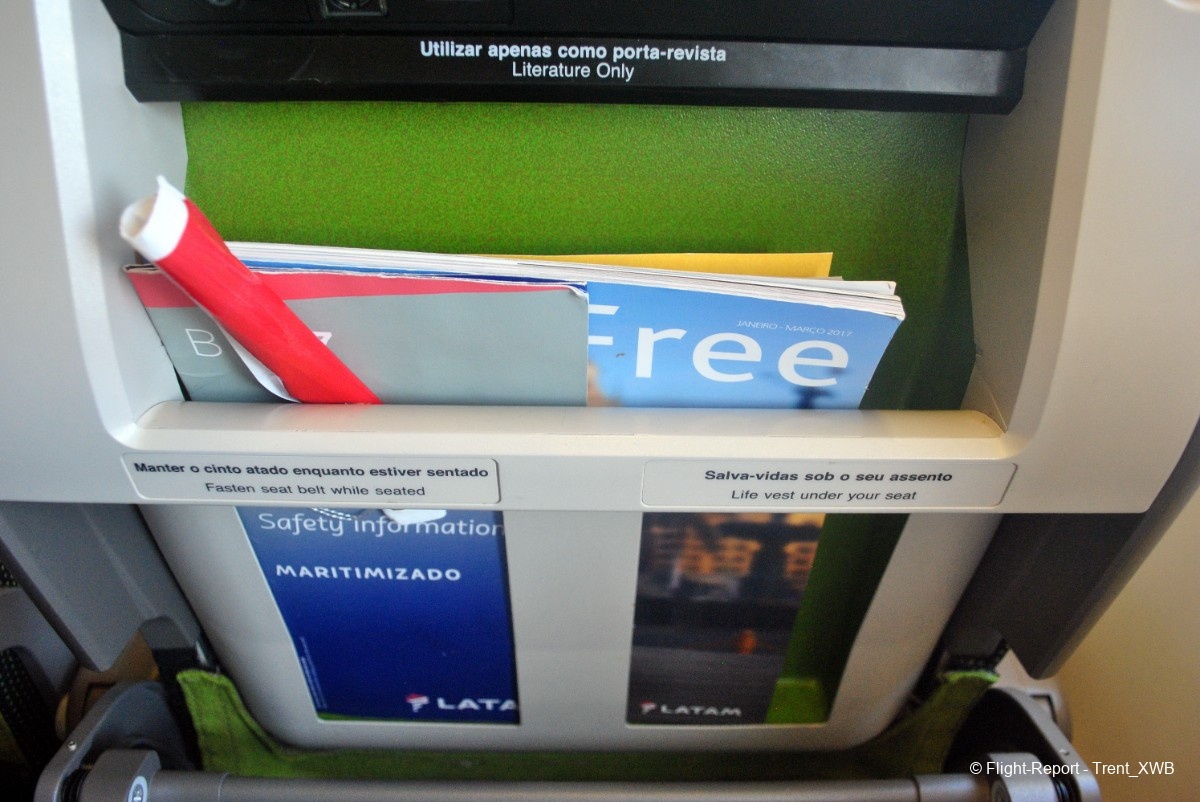 The seat pocket content: safety card, inflight magazine (with the photo of the then-current LATAM fleet page), duty-free magazine and waste bag.