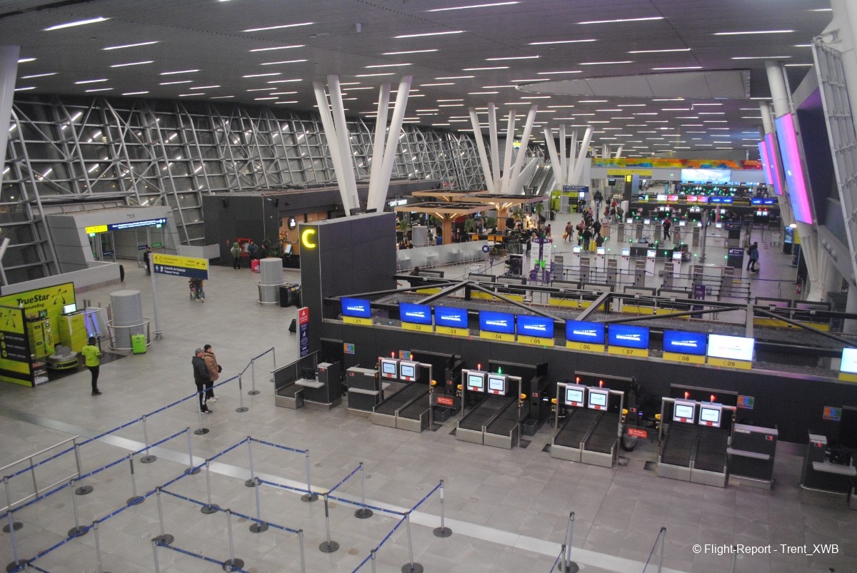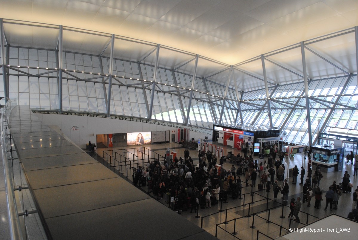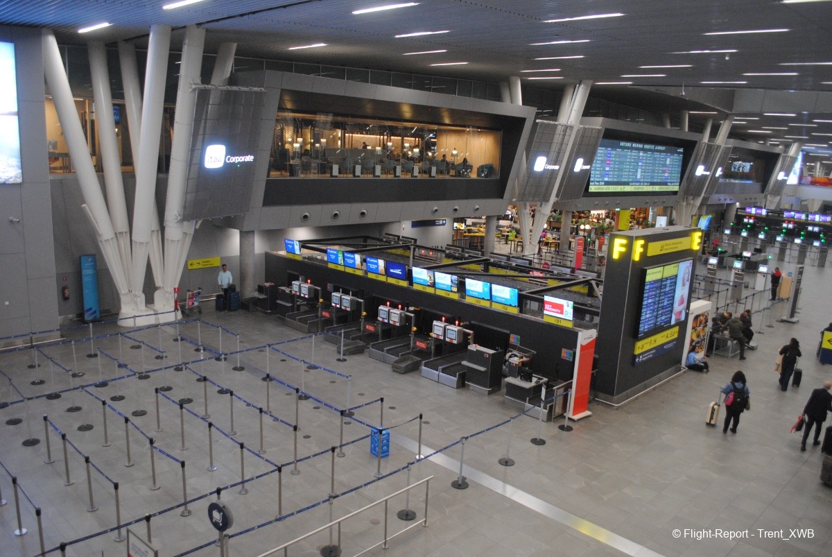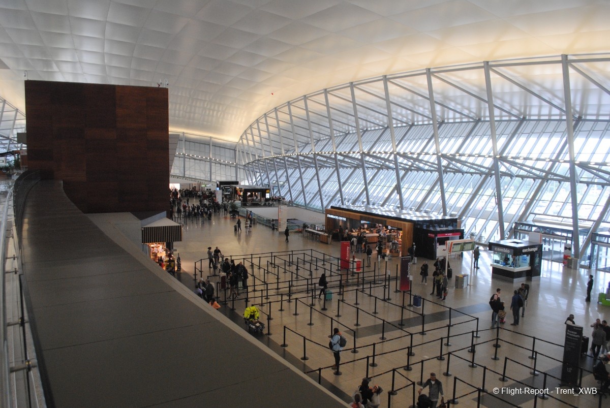 Views of the spacious check-in hall from the departures level.