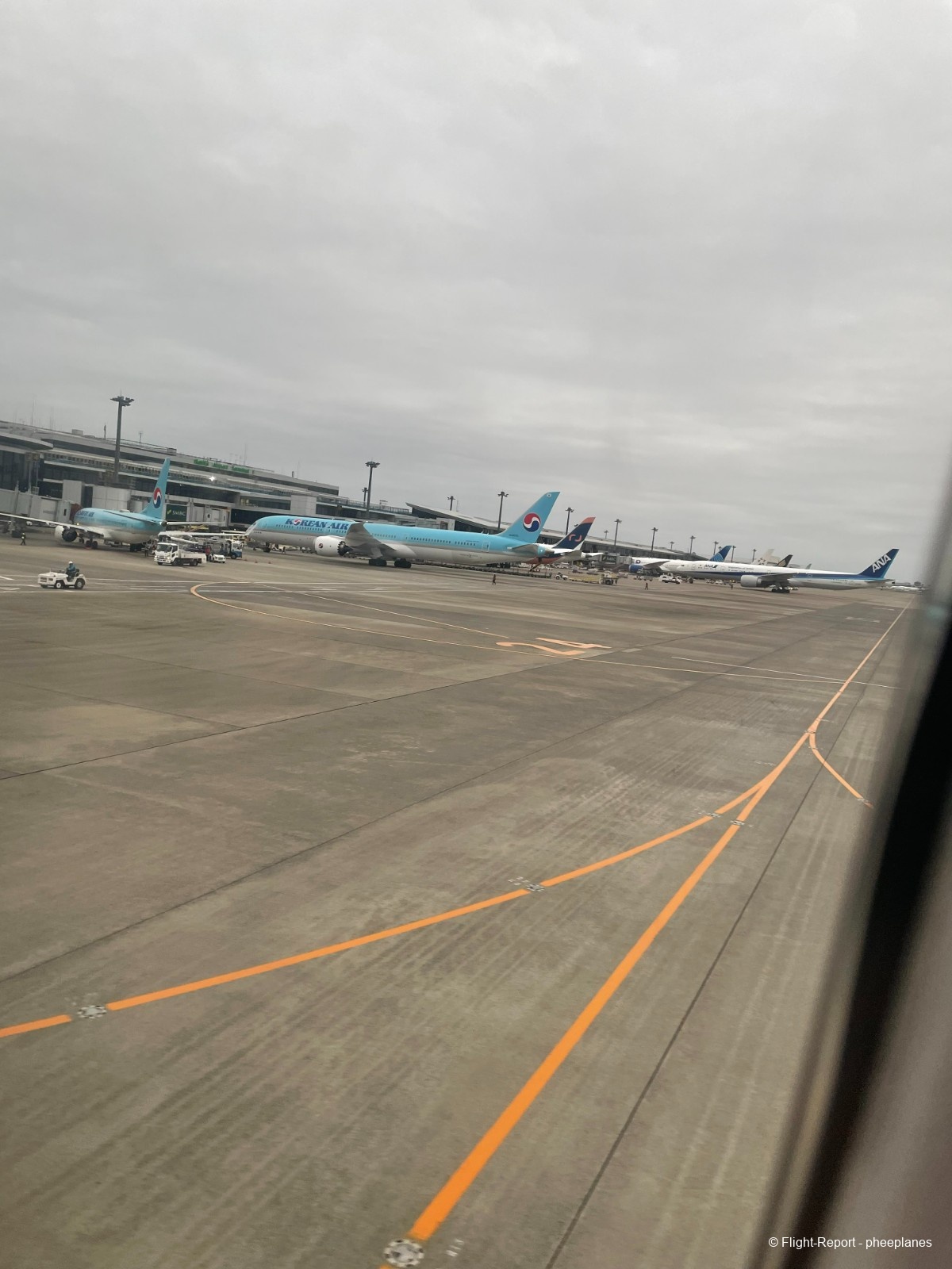 We were push back after the cabin door has closed and the manual safety demo was demostrated during pushback and starting up the Rolls royce engine and the ground crew wave us goodbye and taxi past numerous of aircraft like 2 korean air b737 max8 and b787-10 ,another airjapan b787-8 heading to bangkok and fleet of star alliance airlines including 2 singapore airlines b777 300 ER