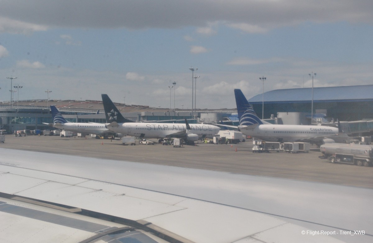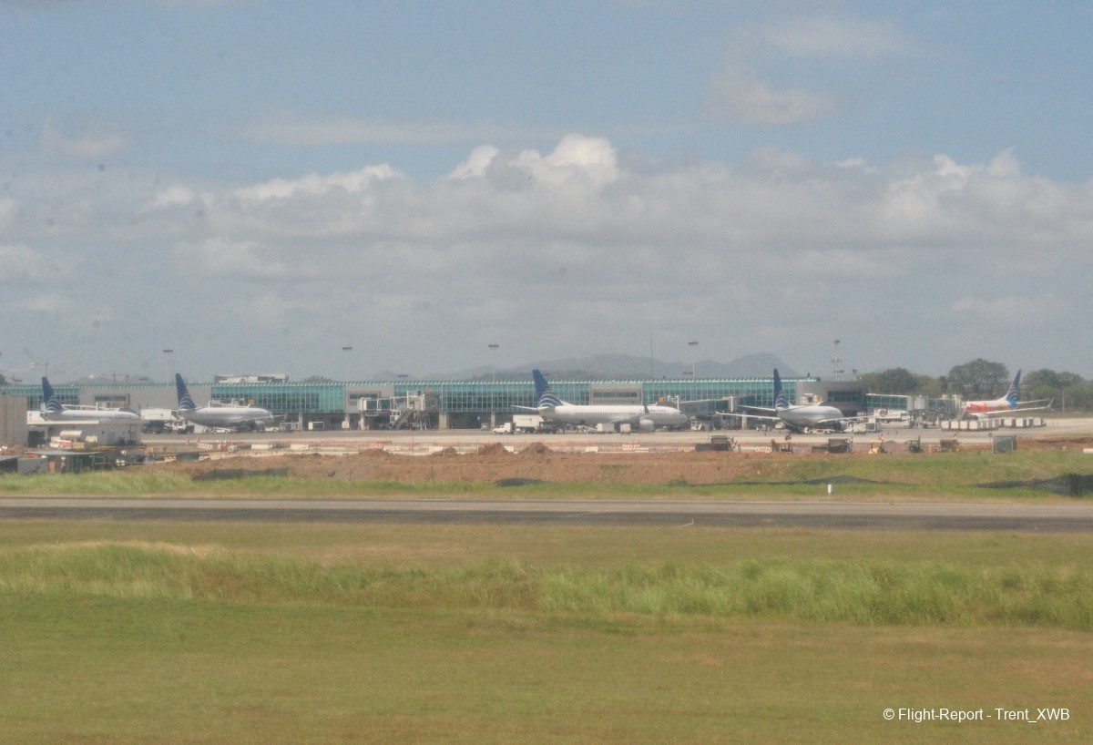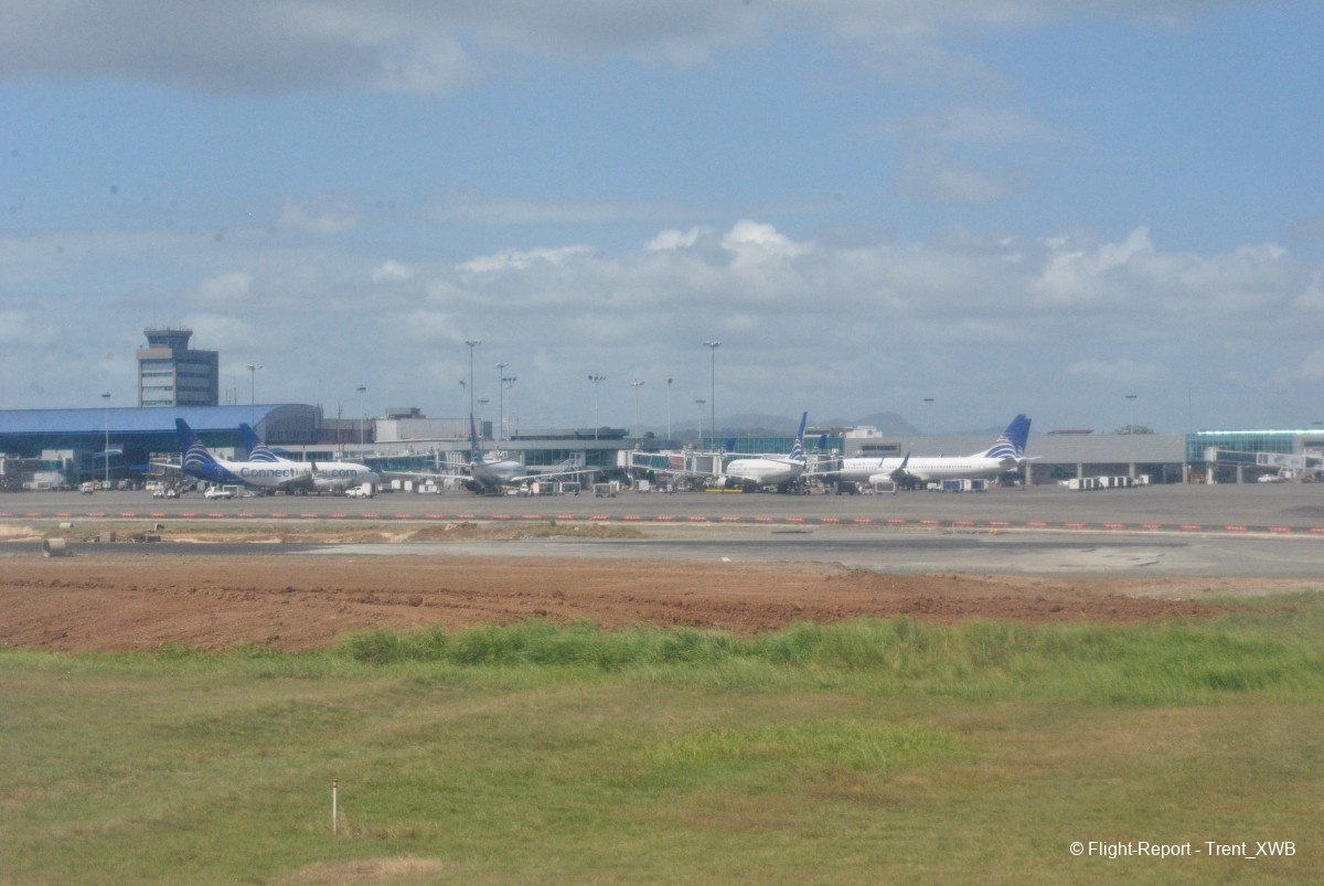 The ATC tower and the old Terminal 1 with multiple Copa narrowbodies.