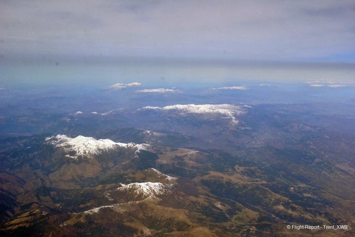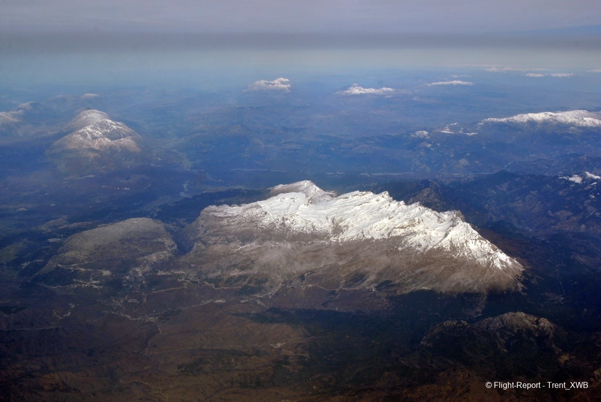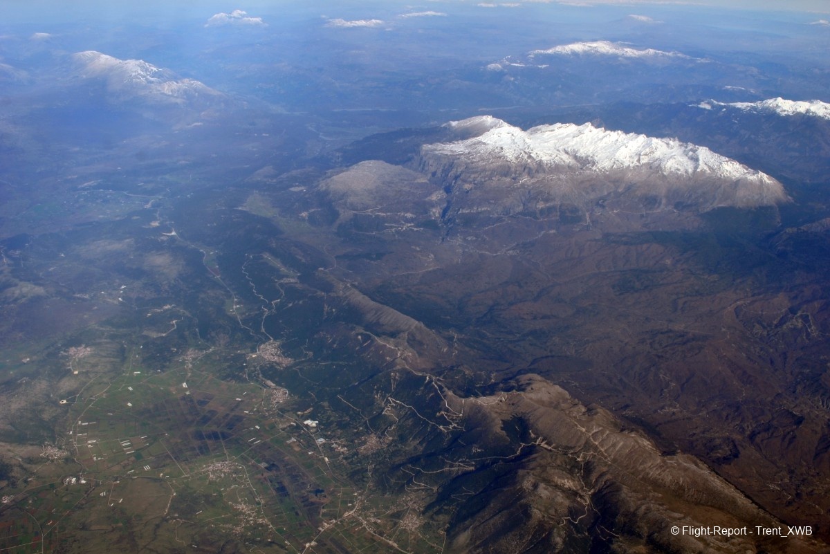 Flying over Greek coast. Kavala bay, Pangaion ridge, Falakro mountain and Pirin ridge in Bulgaria on the backdrop.