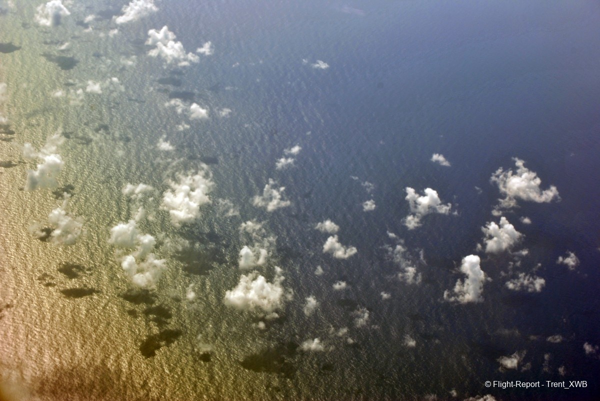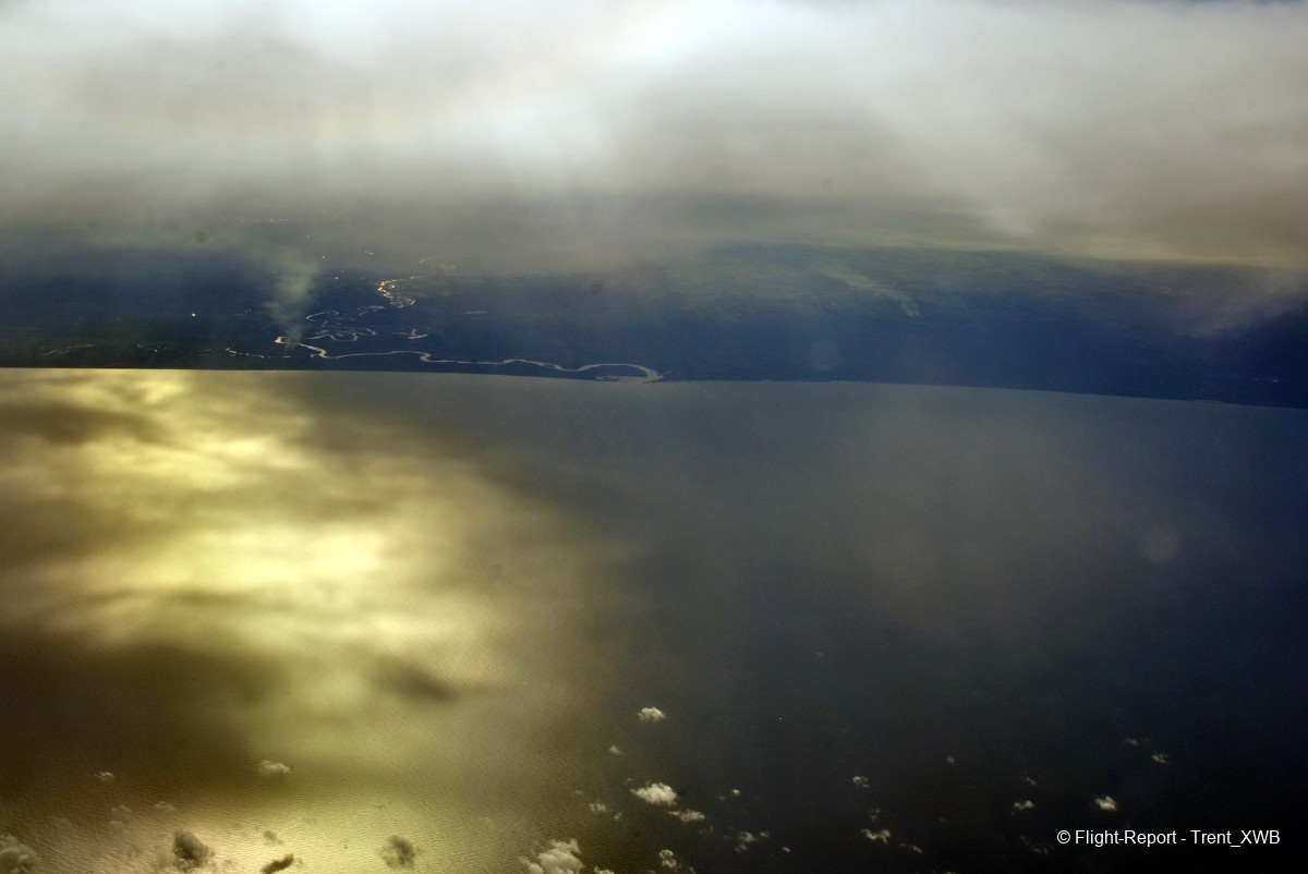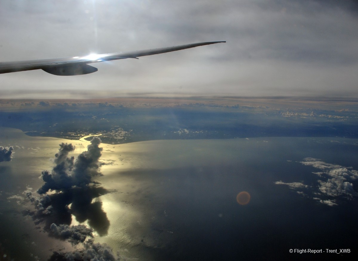 The historic moment for me: for the first time in my life I see the Americas - South America, to be precise. Between the flap track fairing and the sunlit ocean one can see a piece of northern Brazil.