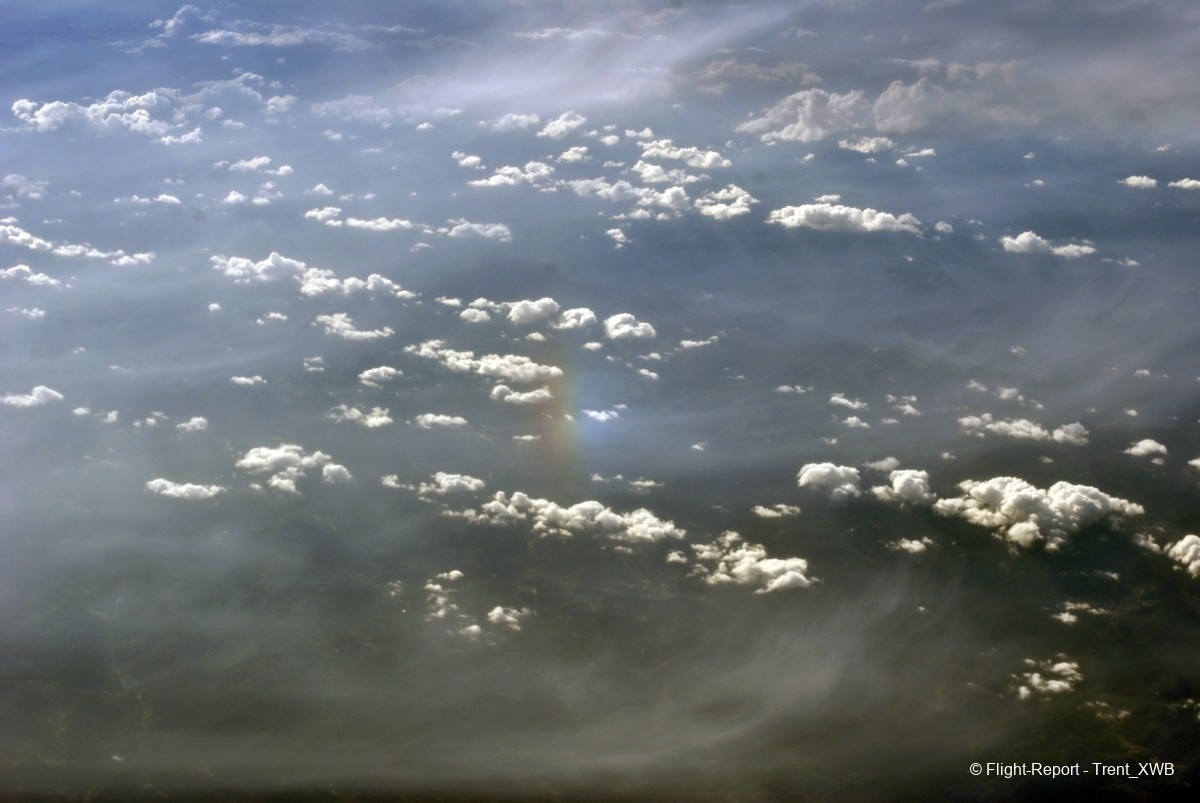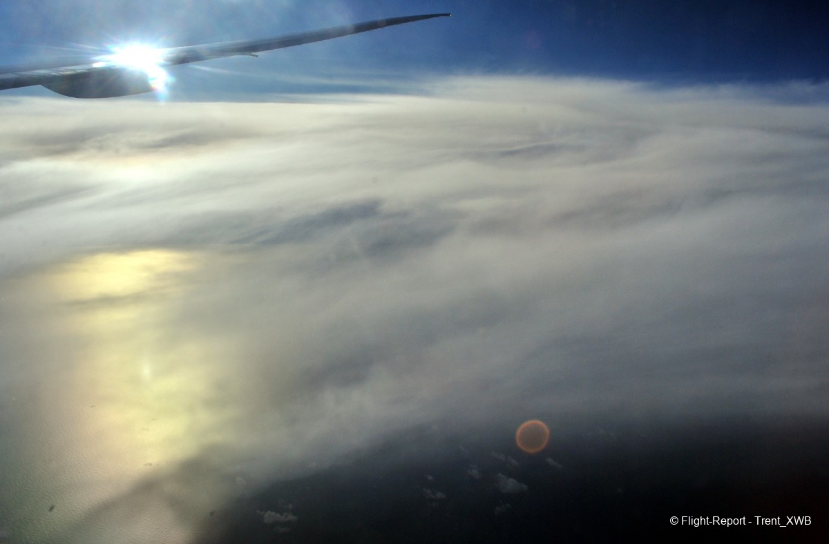 Flying over double veil of clouds. The sun creates a halo in the upper veil and a reflection (even with some rainbow) in the lower veil. Absolutely stunning!