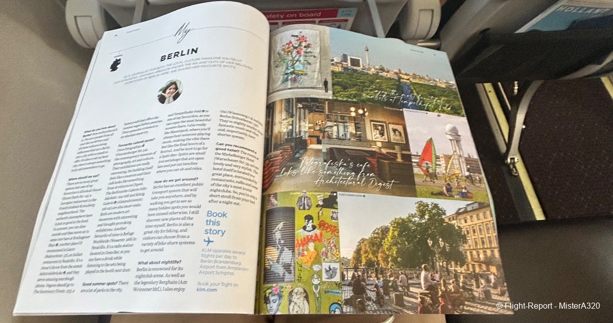 Let's have a look at the seatback pocket content with the safety card and the KLM paper onboard magazine displayed :