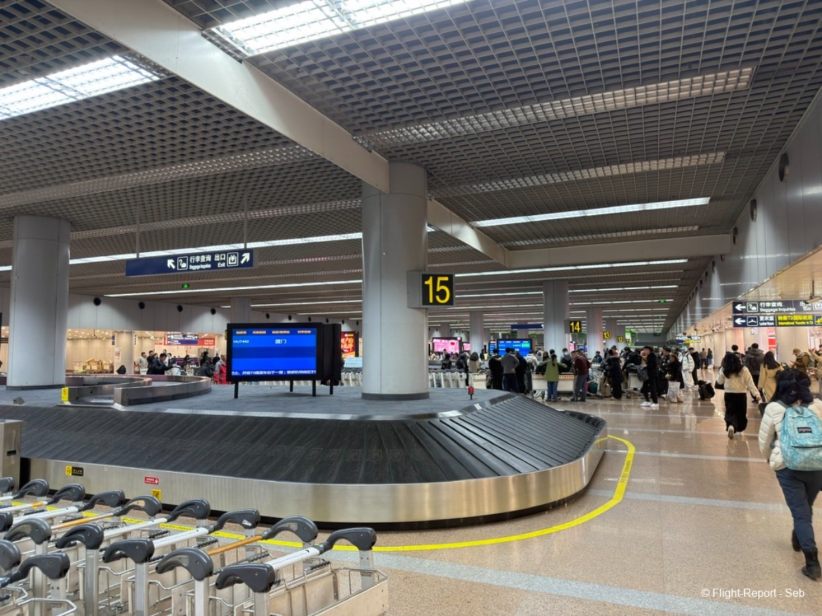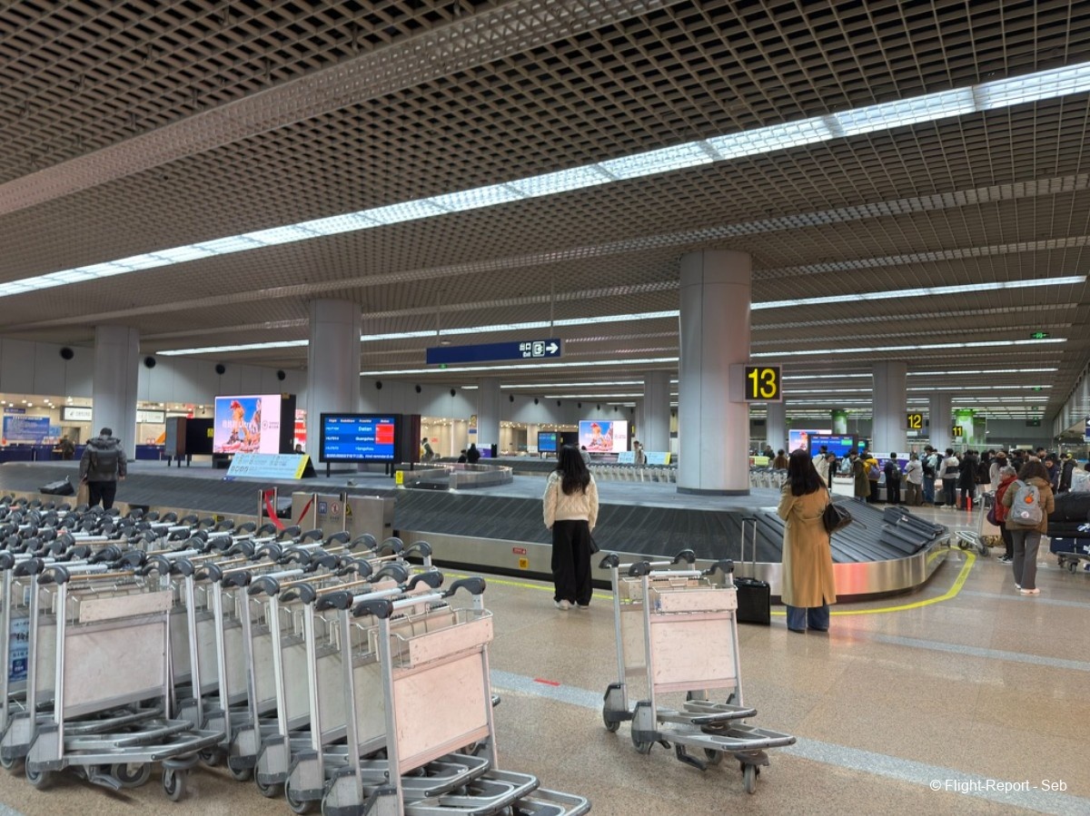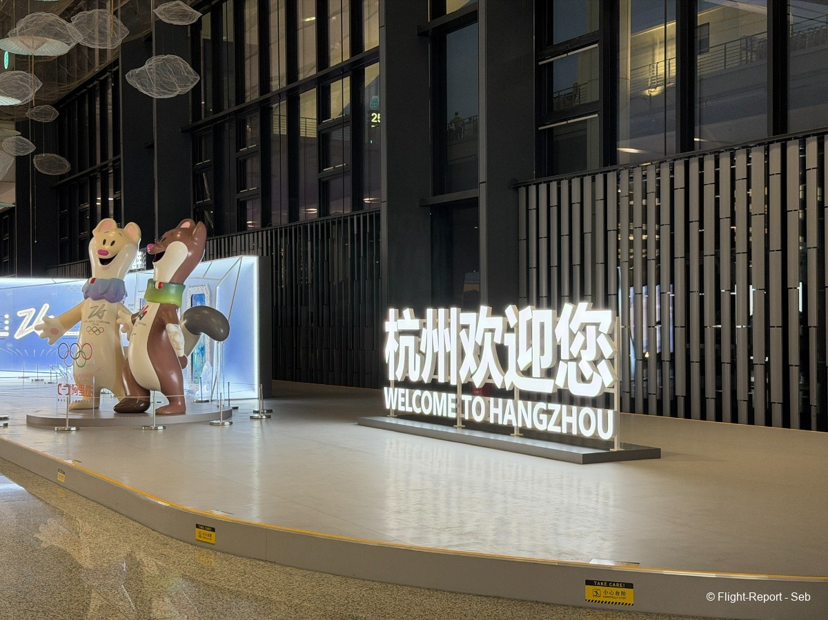 I hopped out of the COMAC C919 from my previous flight and headed straight to Arrivals so I could walk to terminal 3. HGH's terminal 4 is modern, spacious, clean, and had many shops and restaurants. It's one of my favorite airport terminals I have ever been to. Since I've already talked about the departure area (after security) of the terminal in my first flight report, I'll start from arrivals this time. At first, I went though a hallway that had a really tall ceiling. Right before the baggage claim area, there were beautiful Chinese-style umbrellas hanging from the ceiling as decoration, plus a huge screen showing all the airport’s destinations. I also noticed some displays about the 2026 Milan Winter Olympics beside the "Welcome to Hangzhou" sign. The baggage claim section of HGH's terminal 4 was big, modern, and was really bright compared to the baggage claim in PEK's terminal 3.