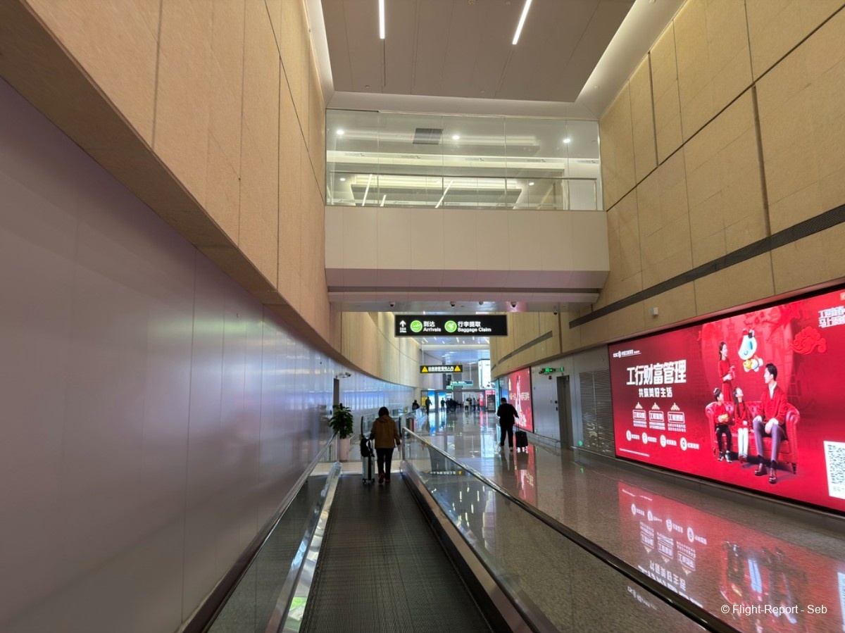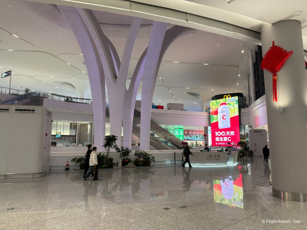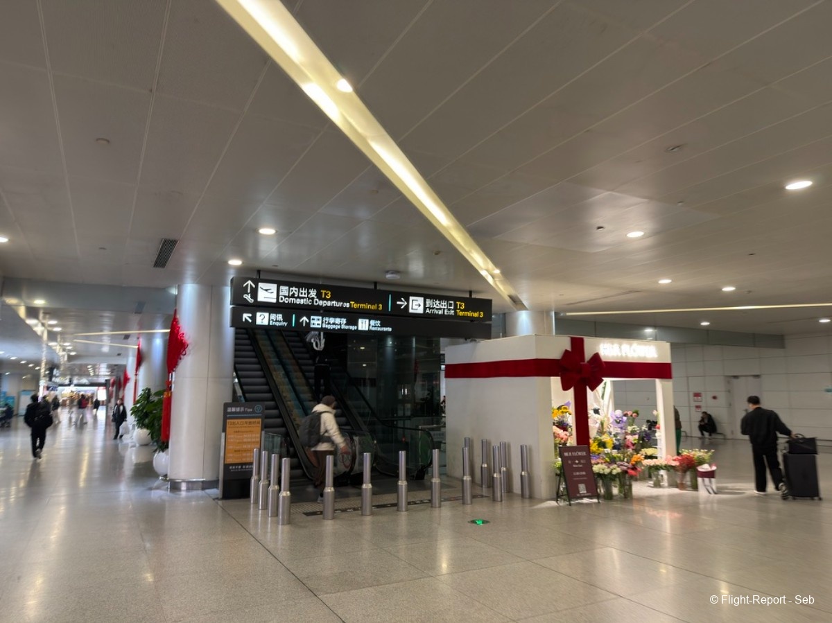 After getting out of baggage claim, I saw a good amount of shops and restaurants nearby. Even though there weren't as many shops and restaurants as in the departure area after security, there was still a good variety to choose from. There was also a huge, impressive atrium with a really tall, cool-looking structure in the center. The whole area felt modern and lively, with plenty of space and lots to look at. There were also Chinese New Year decorations everywhere, like Chinese knots and “Happy New Year” signs etc.