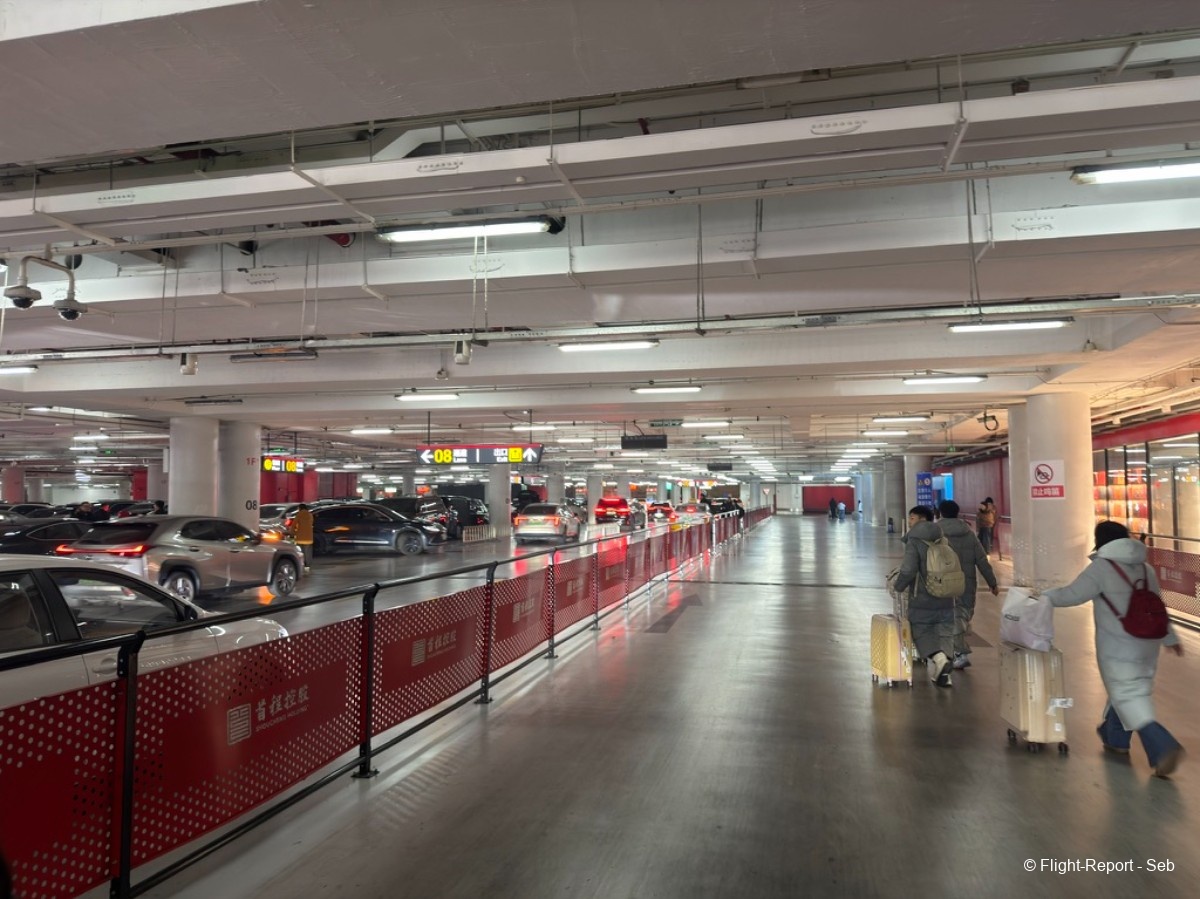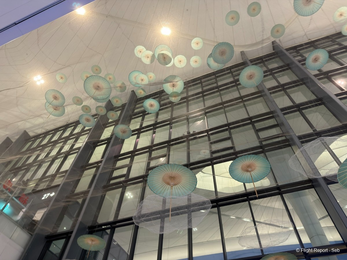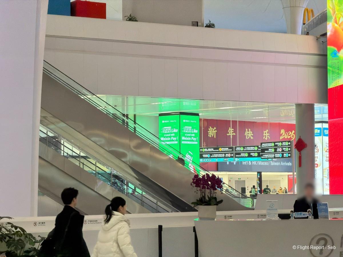 After getting out of baggage claim, I saw a good amount of shops and restaurants nearby. Even though there weren't as many shops and restaurants as in the departure area after security, there was still a good variety to choose from. There was also a huge, impressive atrium with a really tall, cool-looking structure in the center. The whole area felt modern and lively, with plenty of space and lots to look at. There were also Chinese New Year decorations everywhere, like Chinese knots and “Happy New Year” signs etc.
