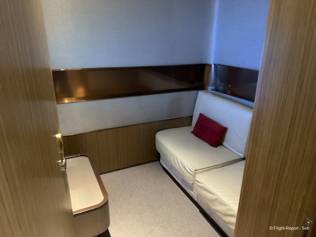 The seat has a lot of privacy and feels comfortable when you sit on it. The headrest is adjustable, and there’s also a convenient coat hook near the seat. It would be better if the armrest could be lowered so I could get more horizontal space during bed mode. The seats are slightly narrow for business class; there’s not even enough space to include a legrest, and storage is limited to just a small cabinet and a tiny space under the footrest.