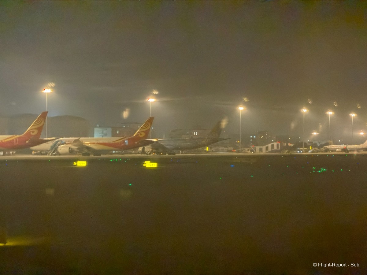 The pushback went smoothly and we began taxiing. We had a long waiting time because there was an Air China 737 landing. Once the runway was clear, we lined up and started our takeoff roll. The engines spooled up strongly, and we lifted off smoothly into the sky.