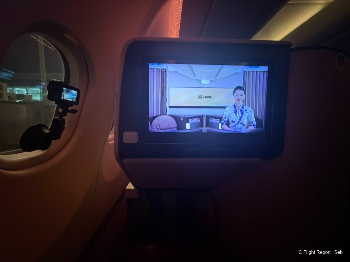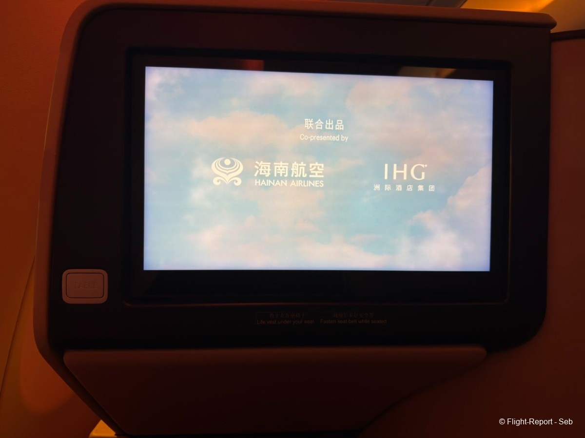 Once the plane doors were closed, the IFE began playing the safety video. It was a creative collaboration between Hainan Airlines and IHG. One thing I noticed, though, was that the business class cabin shown in the video looked more spacious than the one I was sitting in. This really made me want to try Hainan Airlines’ newest 787 business class cabin in the future.