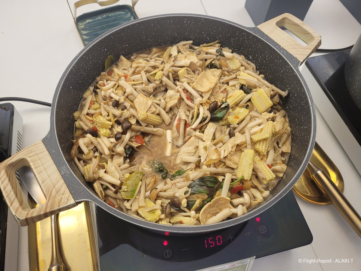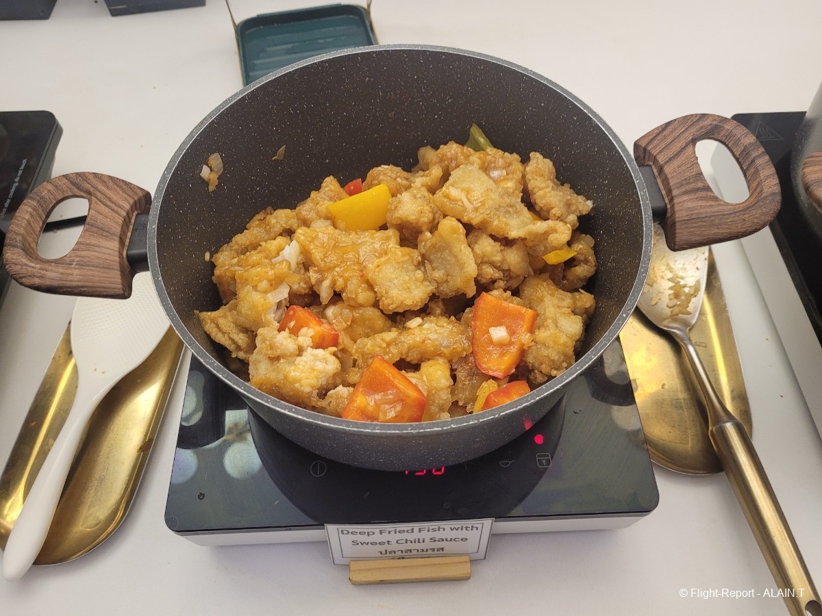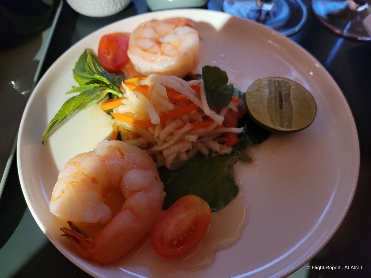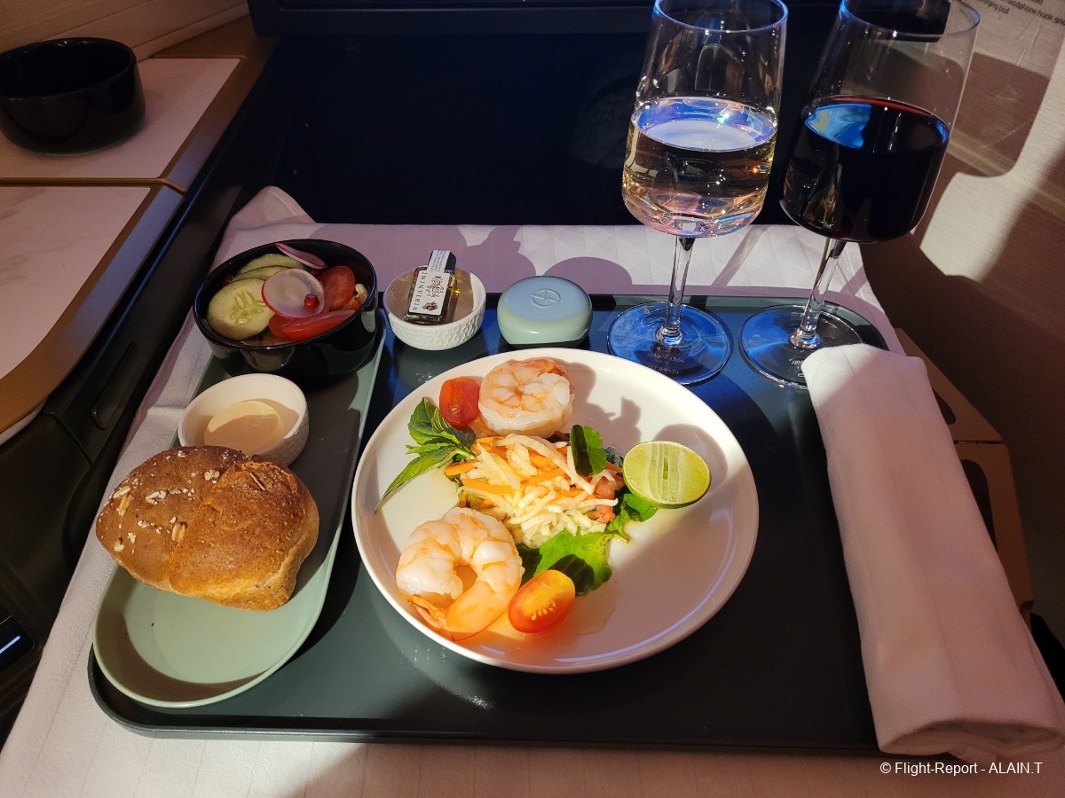 La nape est mise en place, et le plateau est distribué. mon choix: crevettes ou plutôt gambas Thai. Sur le plateau, le pain chaud, le beurre, la salade et sa sauce, sel, poivre et le vin. Etrange, mes deux choix de vin, blanc pour l'entrée et rouge pour le plat principal me sont remis en même temps ! Par ailleurs, la sauce annoncée pour ce plat ne m'a pas été donnée, j'ai du réclamer ! Et la réponse fut "la sauce est déjà dans l'assiette" sauf que mon voisin a lui reçu la sauce à côté. Elle me sera finalement apportée mais pas vraiment avec le sourire.