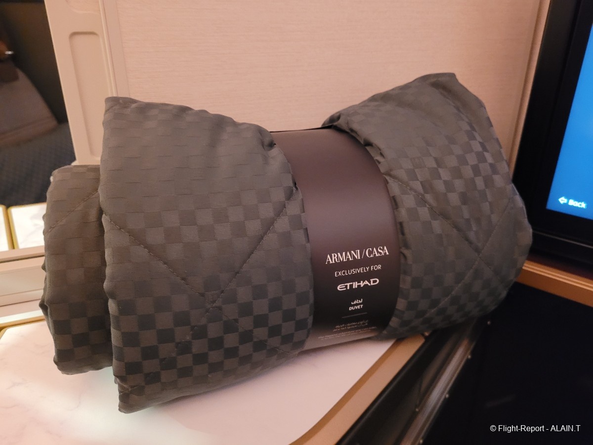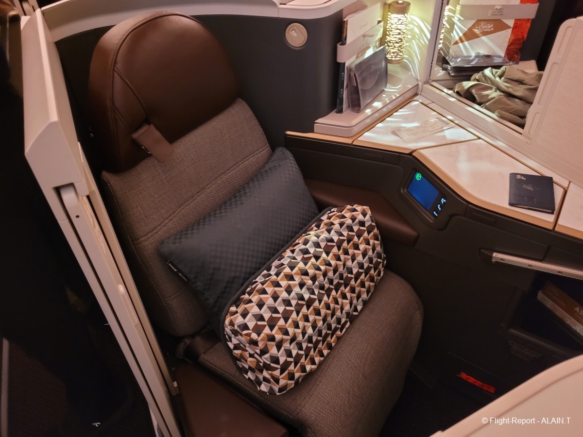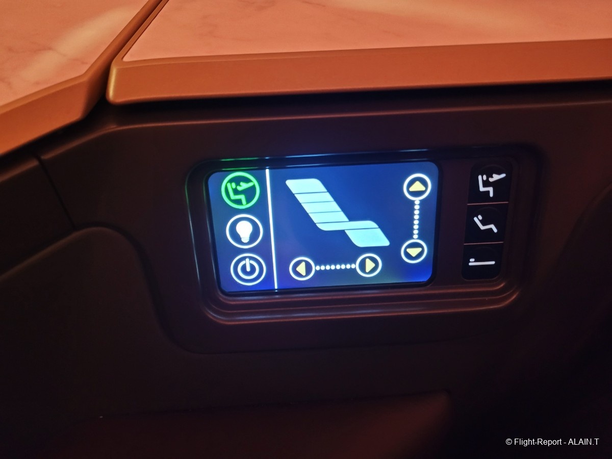 Ma place en Business ou ma petite cabine puisqu'il est possible de s'isoler du couloir. Sont mis à disposition la trousse confort, un oreiller, une couette, un surmatelas et le menu.