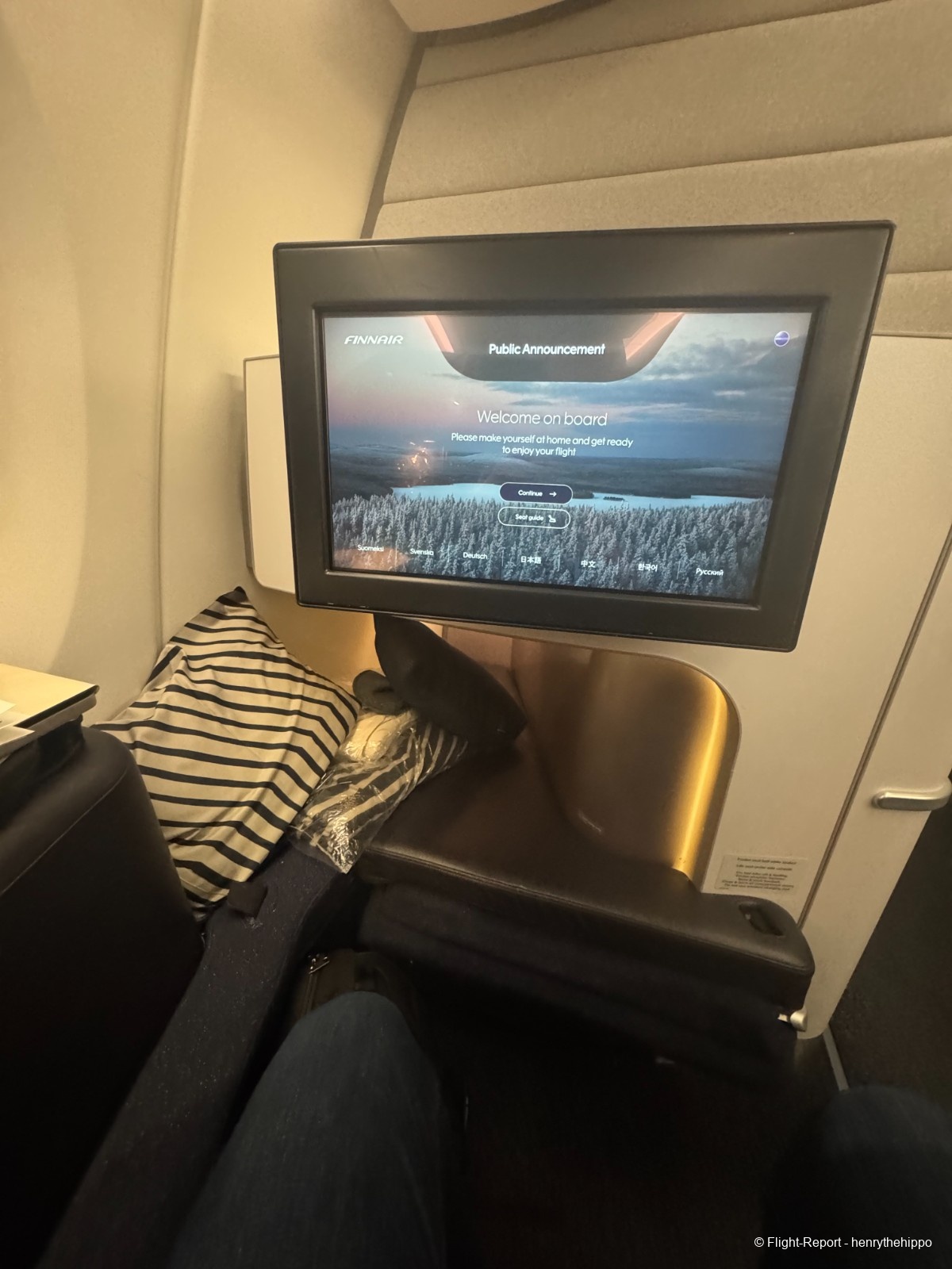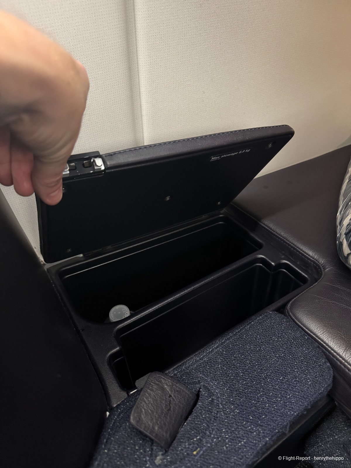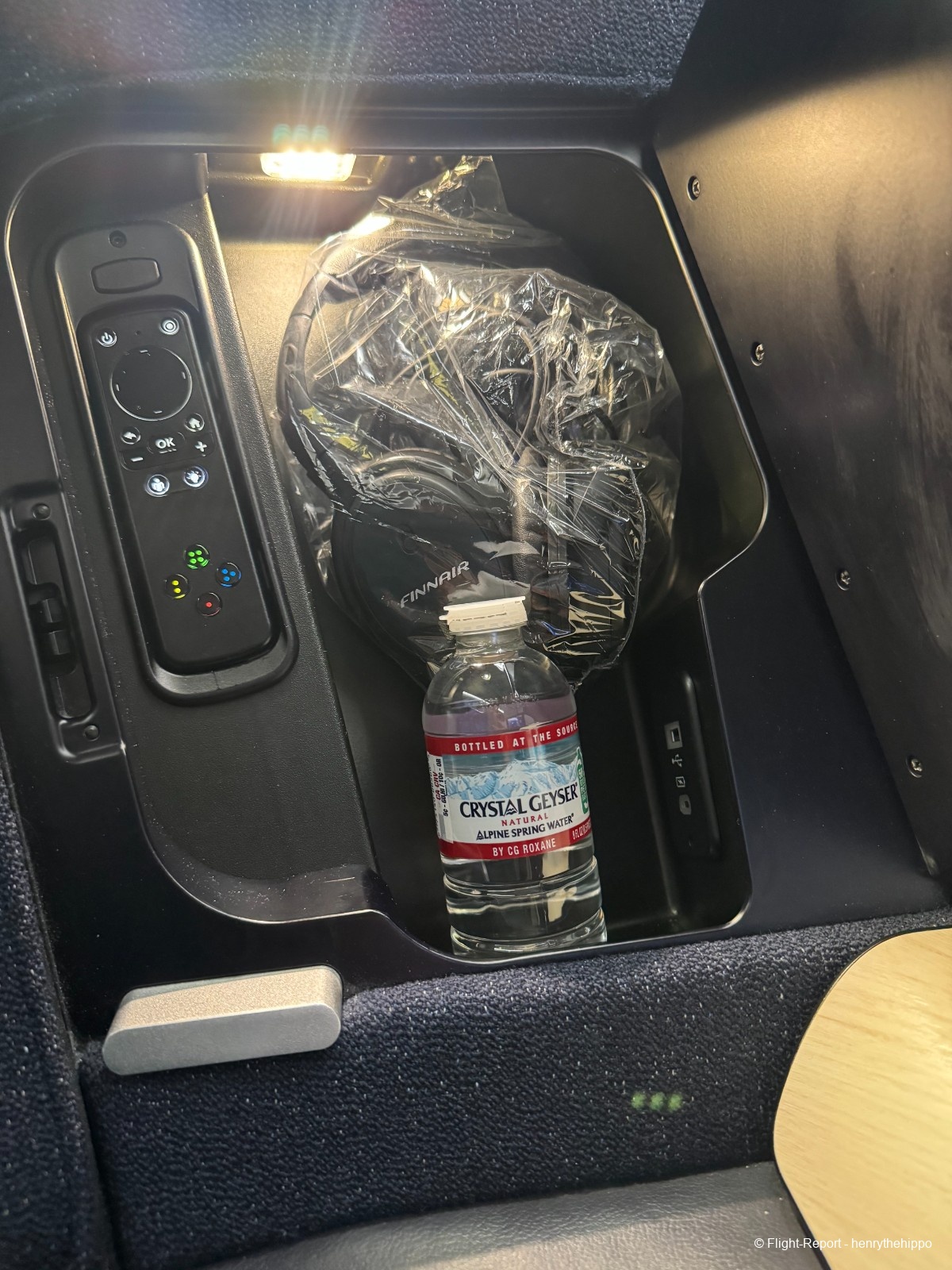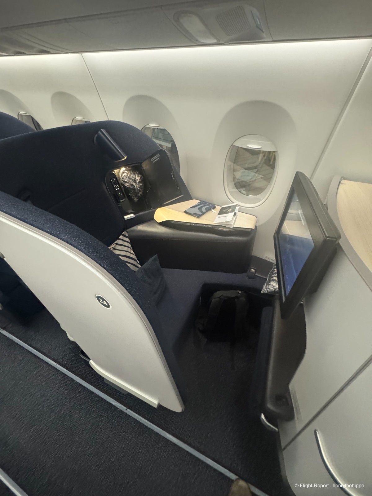 Boarded ahead of schedule and found my seat at the front of the front. First time with this seat and surprised there was no recline feature. The seat was welcomingly wide and had plenty of storage space in a little cubby, underneath the footwell and the footwell itself. Loved the cloth material. Amenity kit was underwhelming and probably the only "downside" of the whole journey