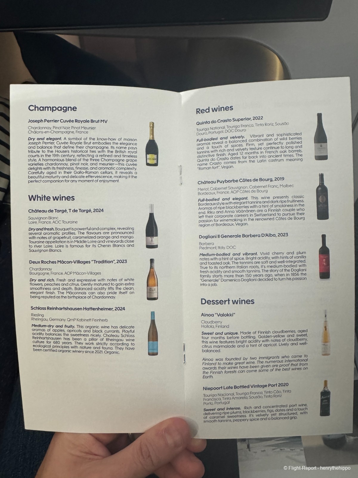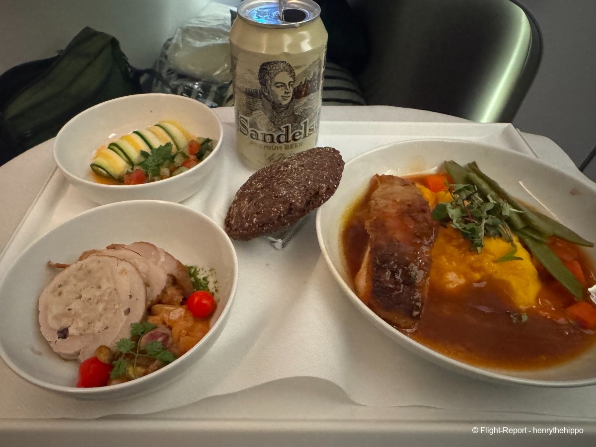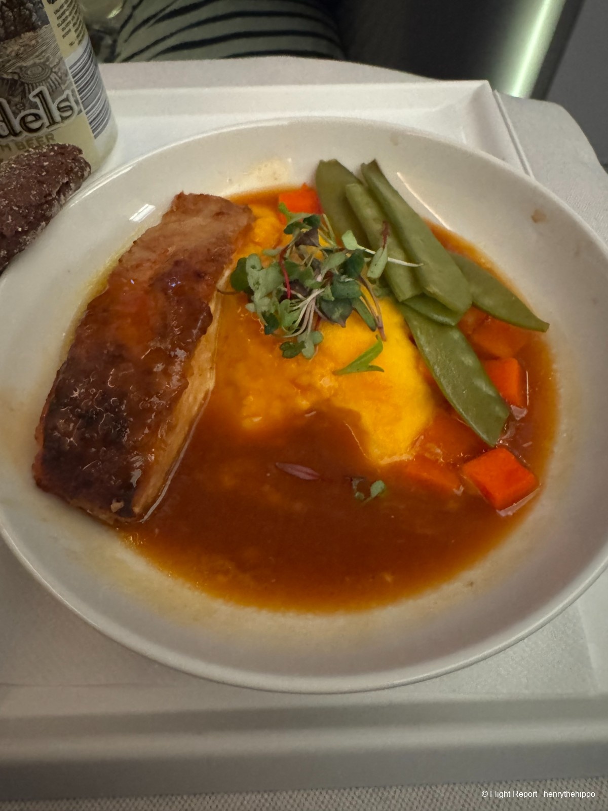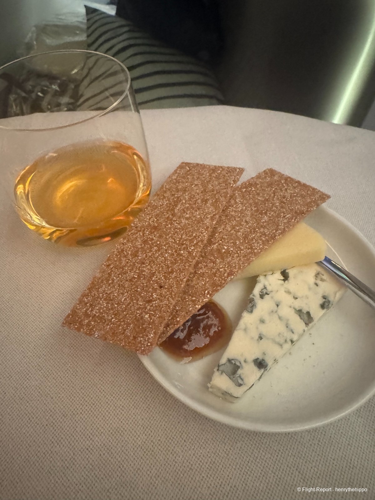 Service started almost immediately after we hit cruising altitude. Warmed nuts and their signature cocktail (canned in Denmark) was a nice welcome. Dinner was served all at once and while not the prettiest plating, everything was rich with flavor. I was surprised at the level of seasoning and how each ingredient carried it's own flavor. I thought it was quite nice and ate everything. For dessert, I opted for cheese and the Finnish Cloudberry Desert Wine which was a little on the sour side but enjoyable