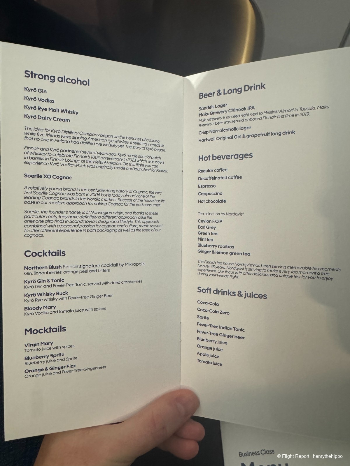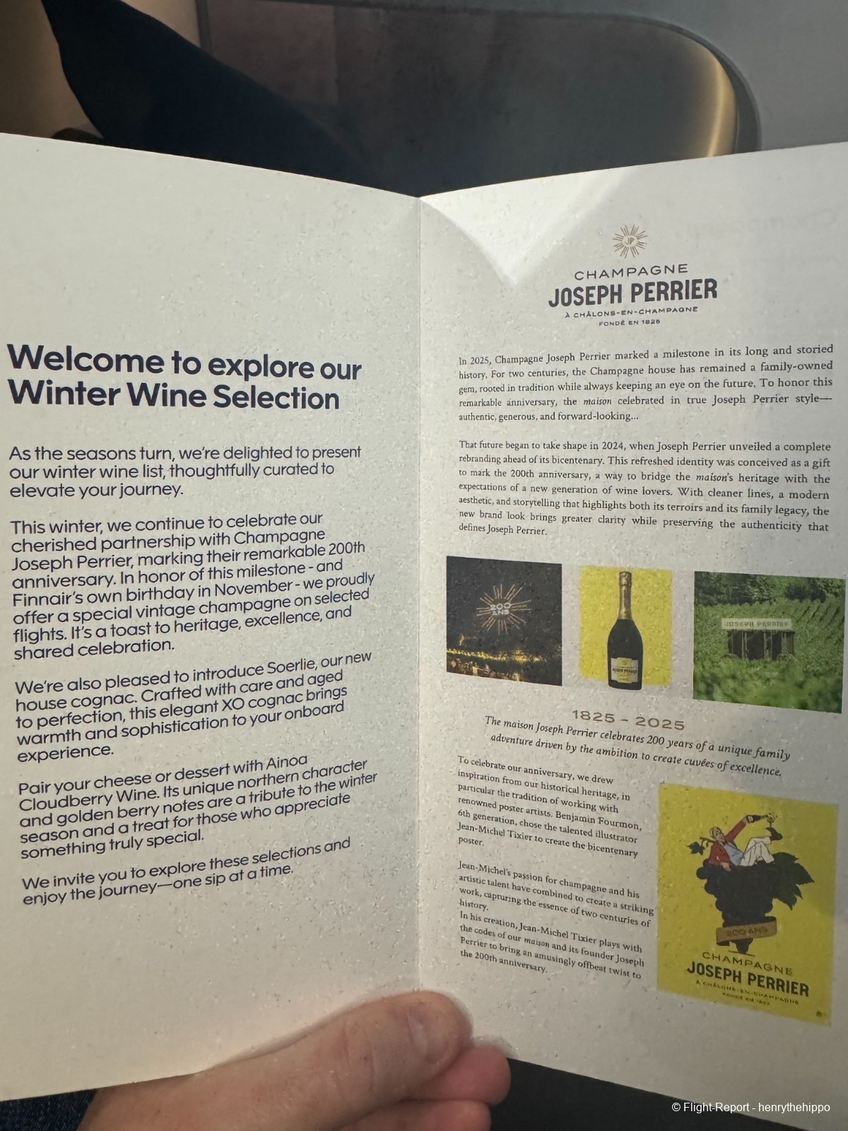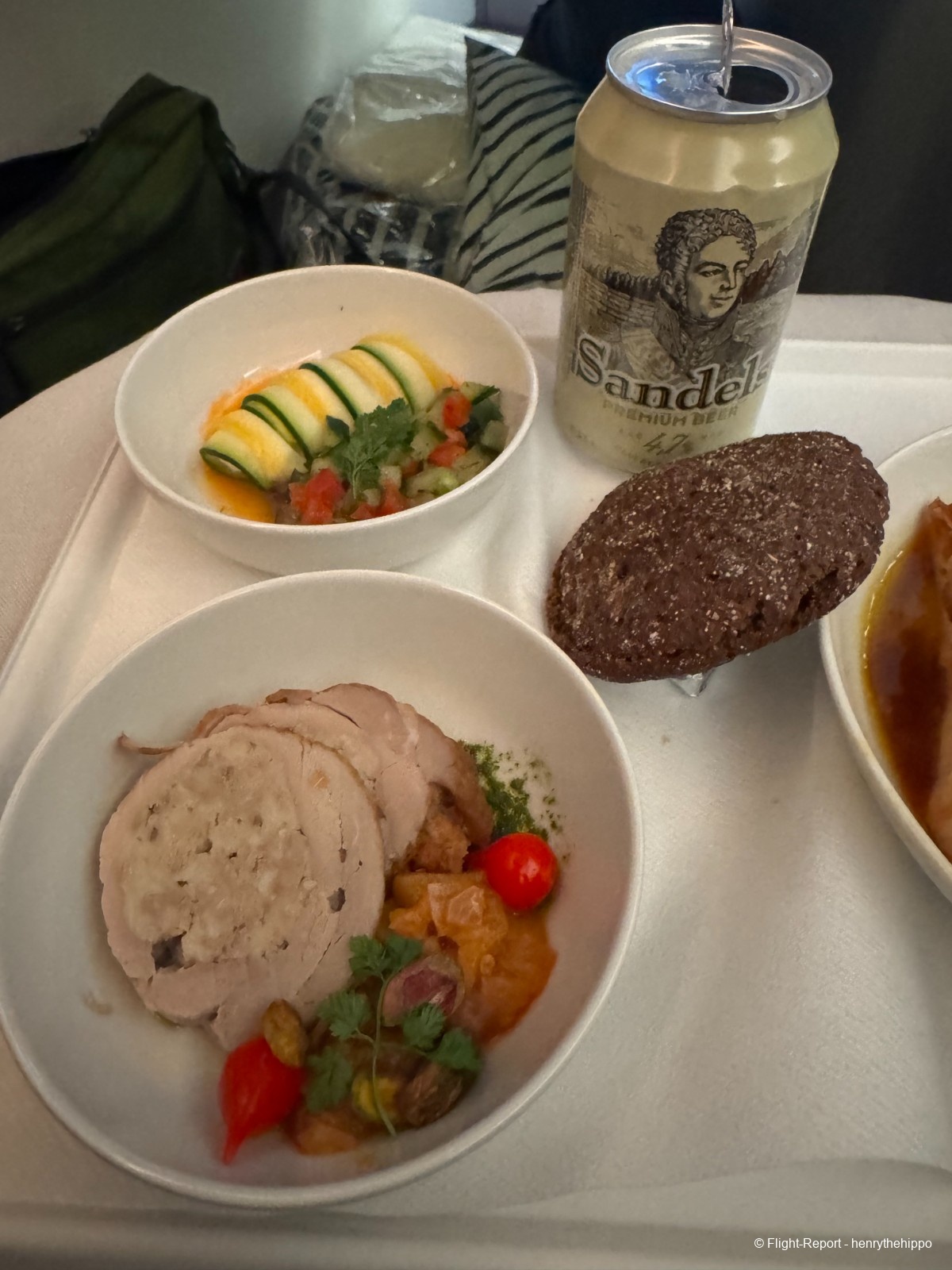 Service started almost immediately after we hit cruising altitude. Warmed nuts and their signature cocktail (canned in Denmark) was a nice welcome. Dinner was served all at once and while not the prettiest plating, everything was rich with flavor. I was surprised at the level of seasoning and how each ingredient carried it's own flavor. I thought it was quite nice and ate everything. For dessert, I opted for cheese and the Finnish Cloudberry Desert Wine which was a little on the sour side but enjoyable