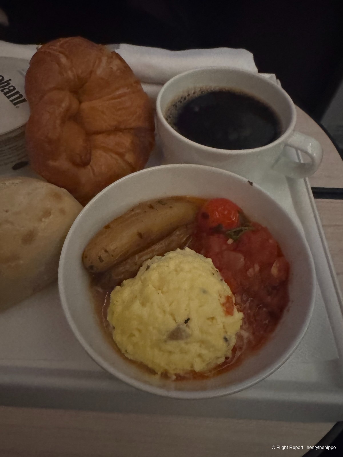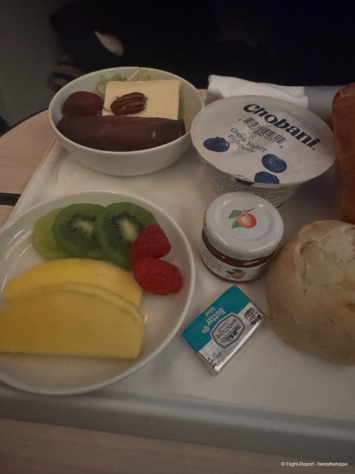 I woke up somewhere just past Greenland and was able to get a solid 6 hours of sleep which I've very rarely been able to do. We had some time before breakfast so I grabbed some snacks in the galley and chatted with the purser who was extremely personable and eager to get some coffee going. Breakfast was pretty bare bones for long haul business but fine.