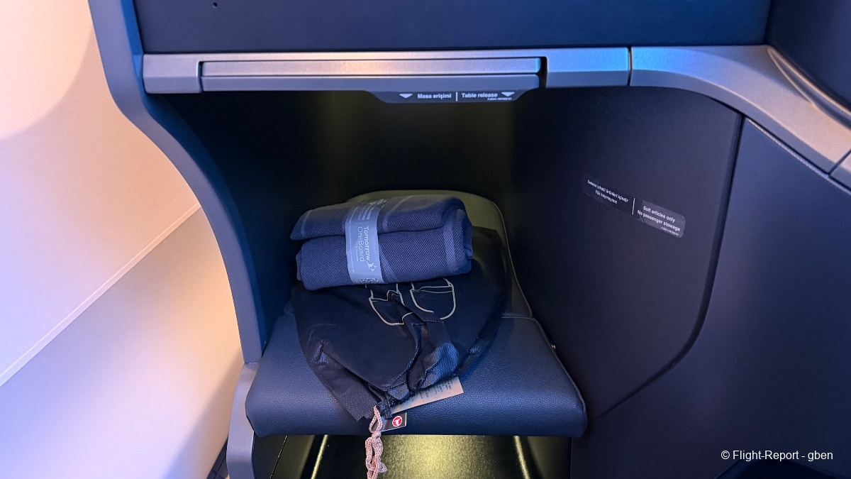 Armement classique avec couverture légère, coussin, chaussons ainsi que la trousse de confort.