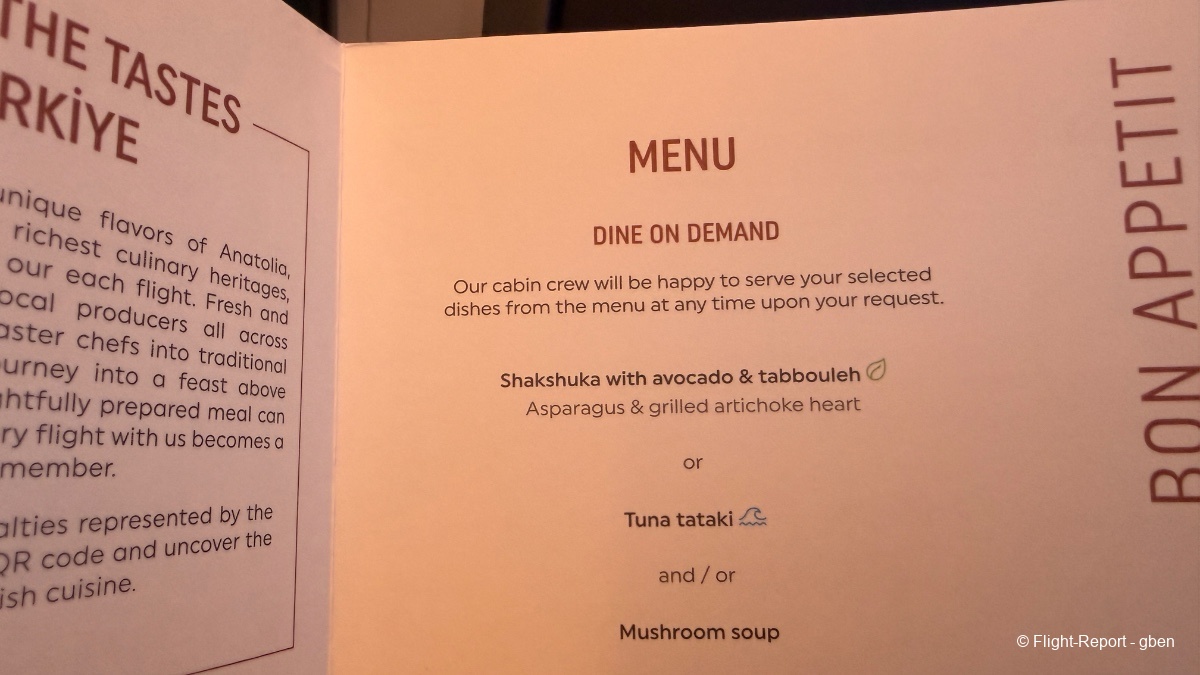 Voici le menu - dine on demand. ; bien que tous les pax prendront le diner après le décollage.