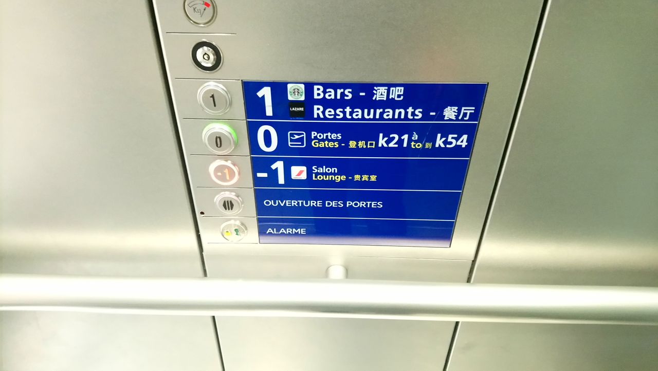 Je prends l'ascenseur pour le salon. Notons que les portes d'embarquement sont indiquées dans l'ascenseur avec un "k" minuscule, pas raccord avec la charte graphique qui met des majuscules aux noms de portes partout ailleurs dans l'aéroport.