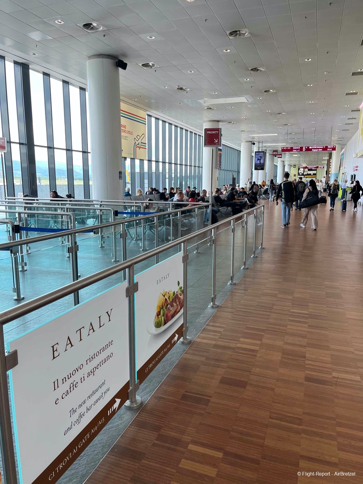 Un espace en forme de grand rectangle avec de belle baies vitrées, autant l’extérieur me laissait présager le pire (un BVA italien) et autant airside c’est digne d’un grand aéroport.