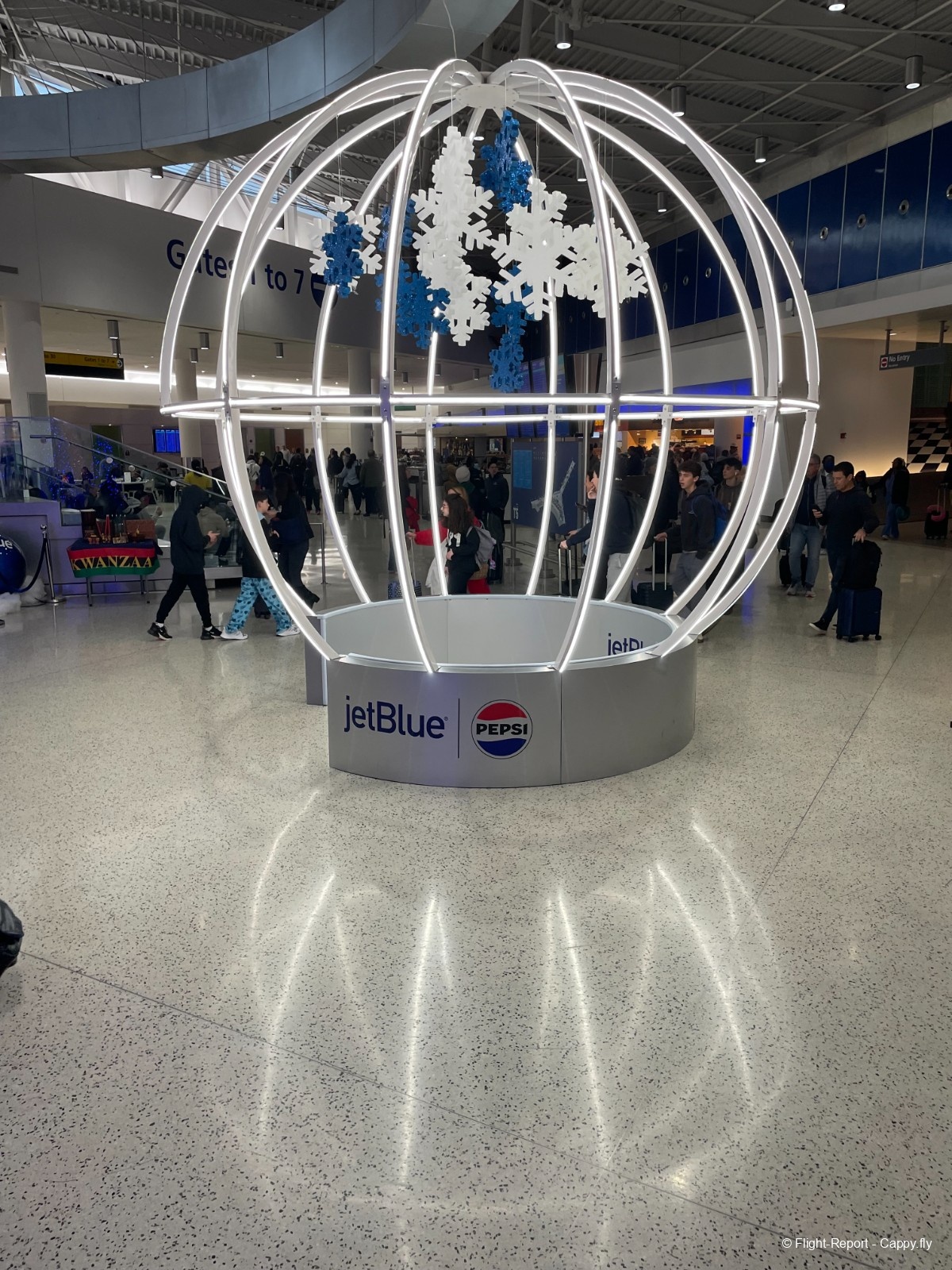 L'aéroport a beaucoup de décoration de Noël, direction ma porte d'embarquement indiquée malgré le retard. En chemin j'aperçois une belle vue sur les pistes de New York JFK.