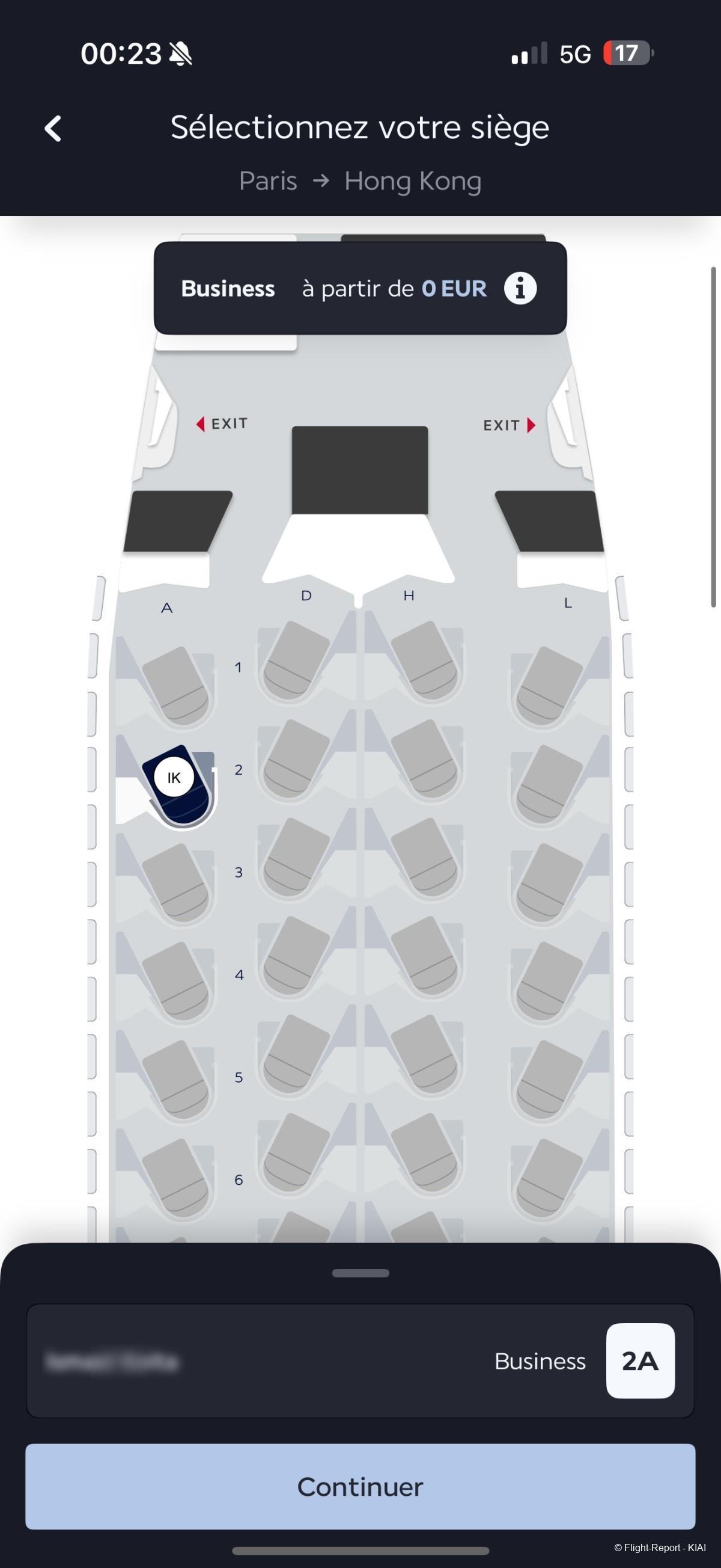 Un plan de cabine montre la place 16A que j’ai préalablement sélectionnée, ainsi que la réservation mise à jour en 2A, après avoir déboursé 1K pour un sur-classement sans enchère via la ligne téléphonique dédiée au membres premium.