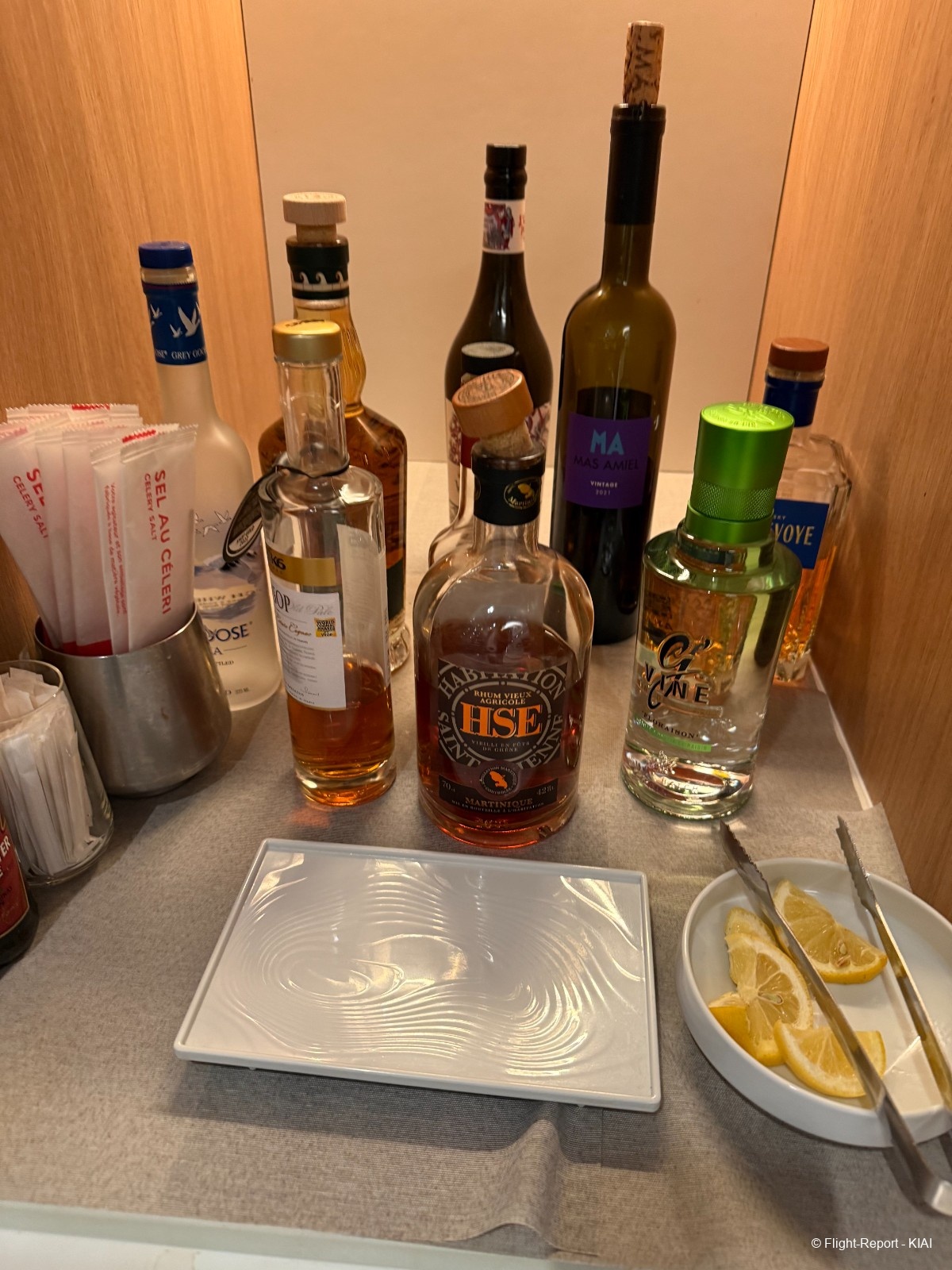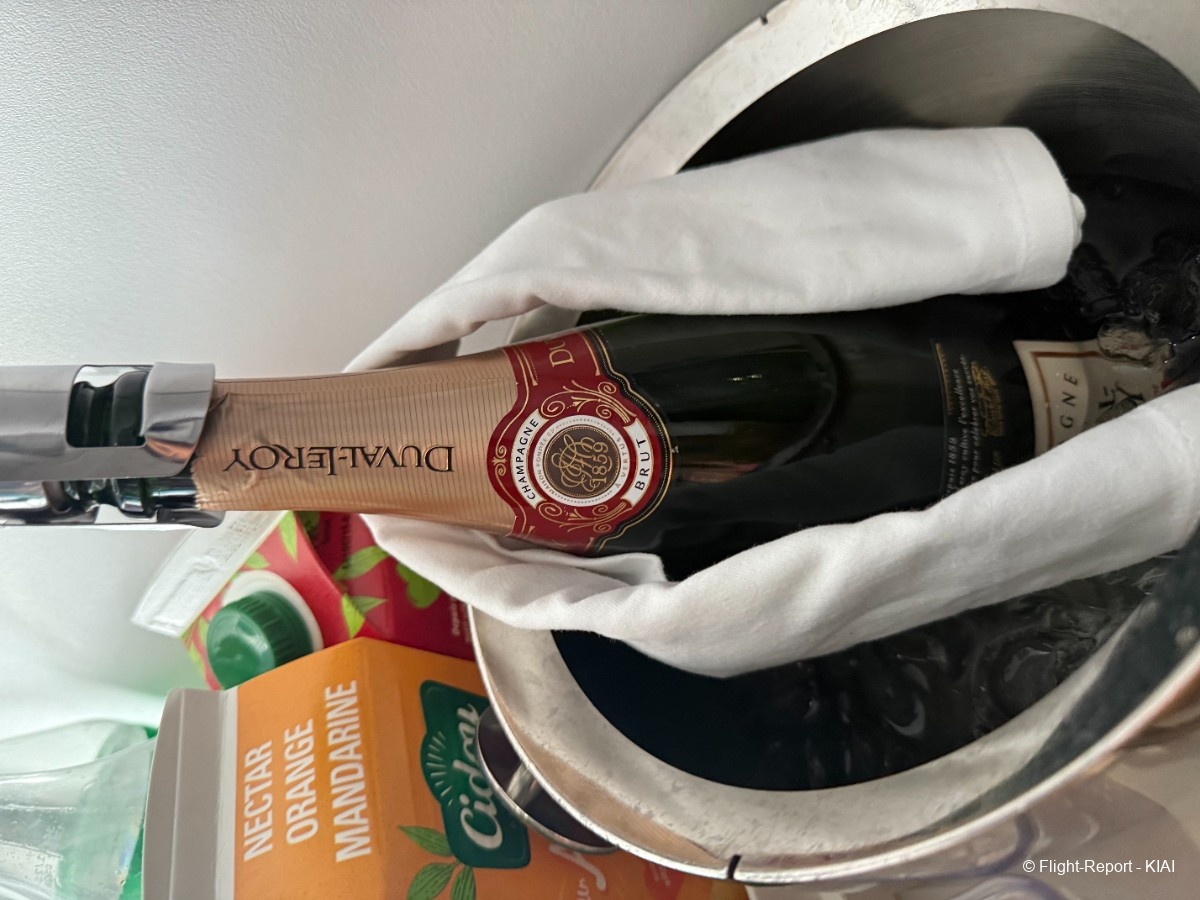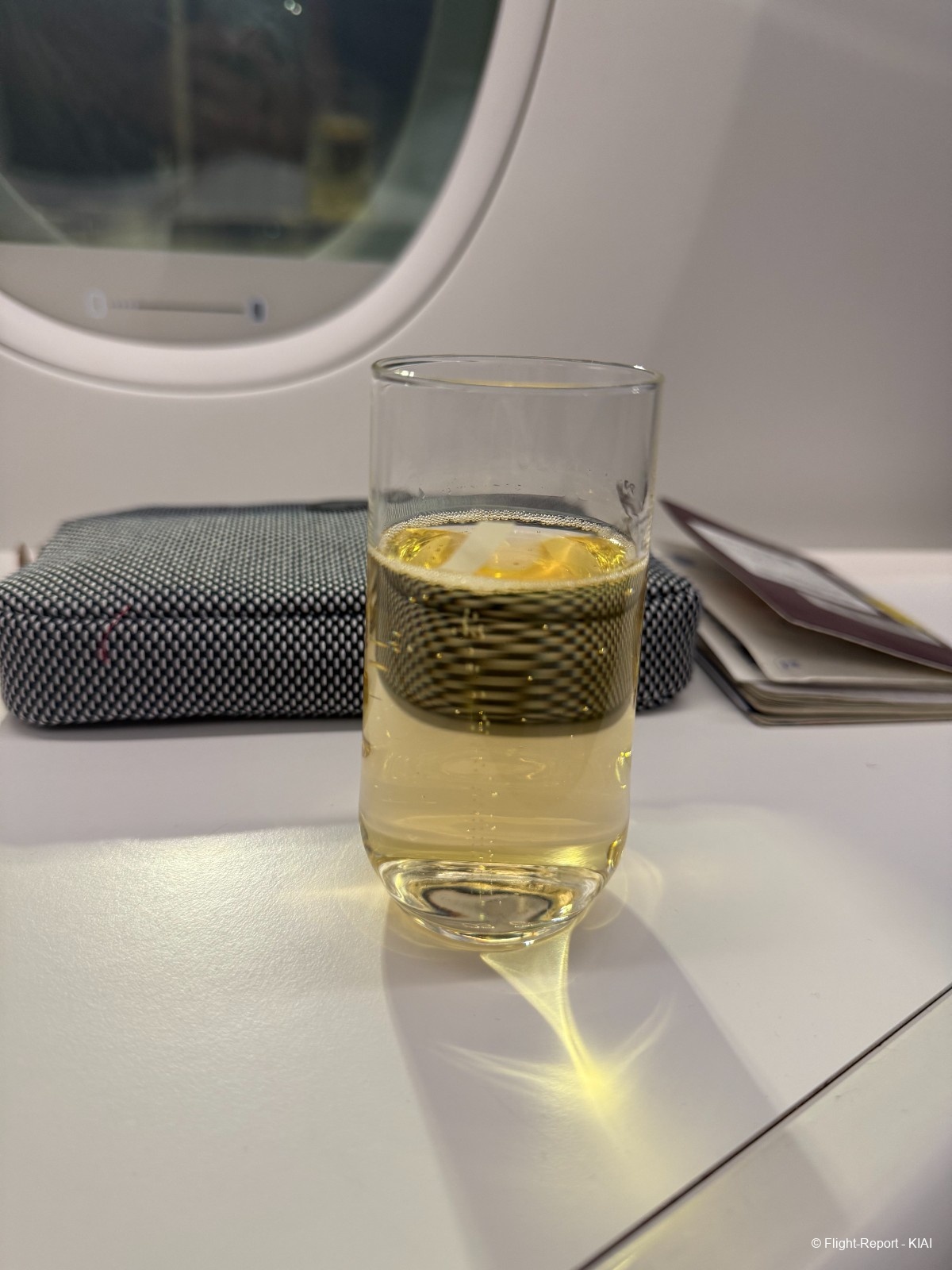 Quelques instants plus tard, je suis servi d’un verre de bienvenue et reçois une trousse de voyage qui commence à dater…