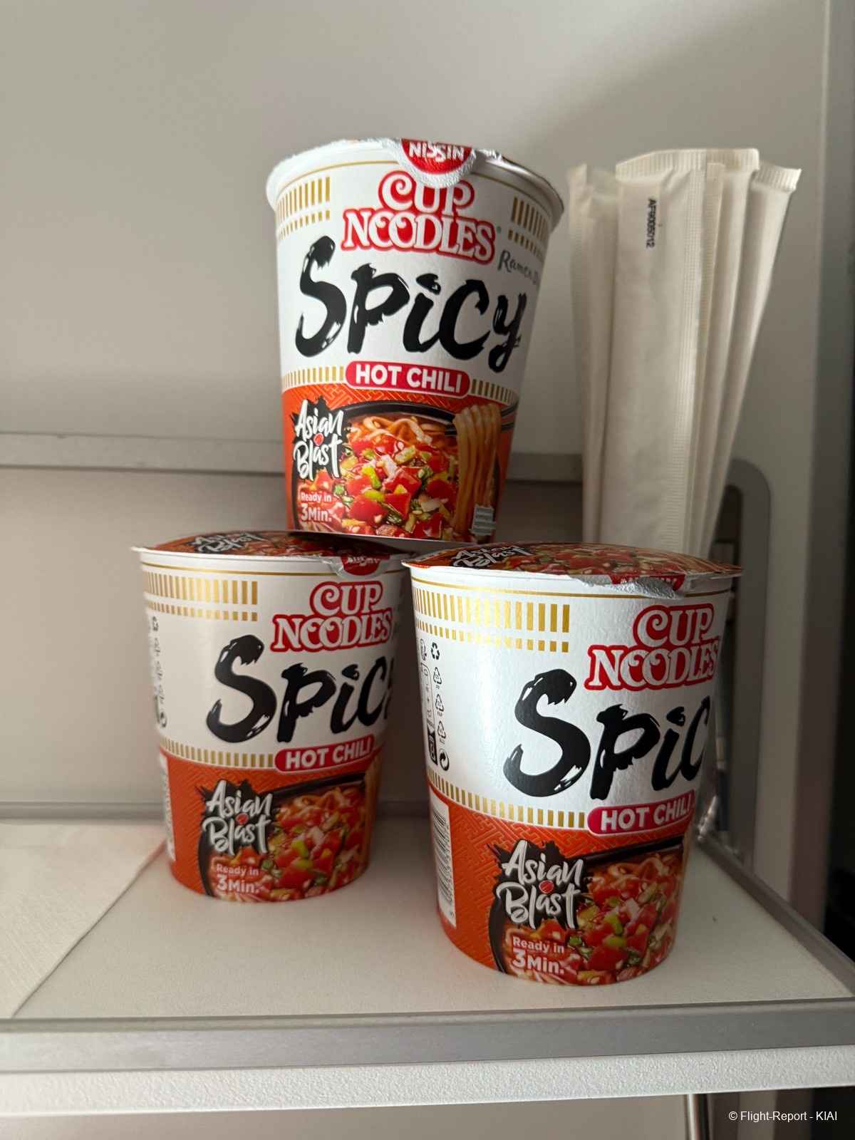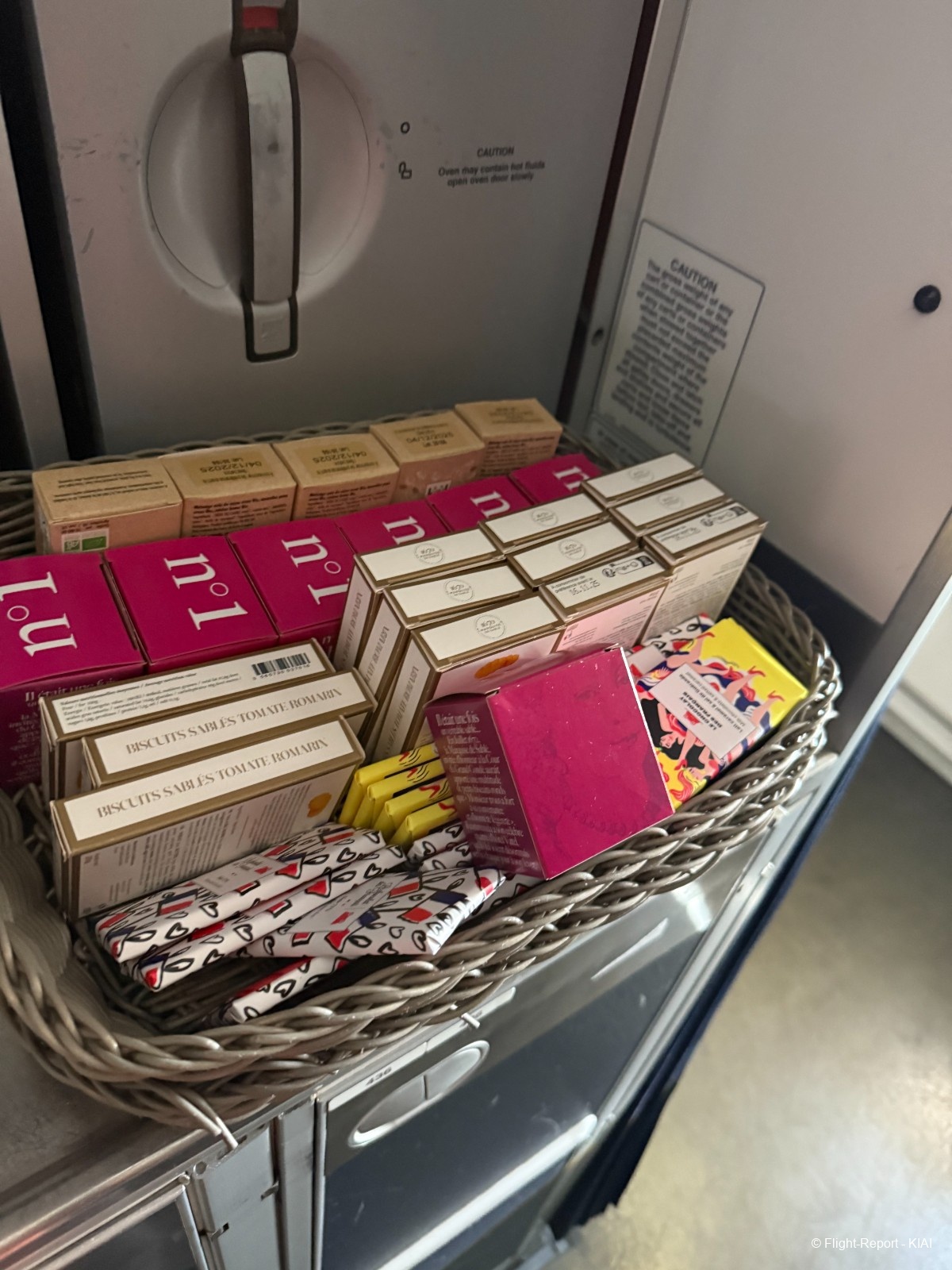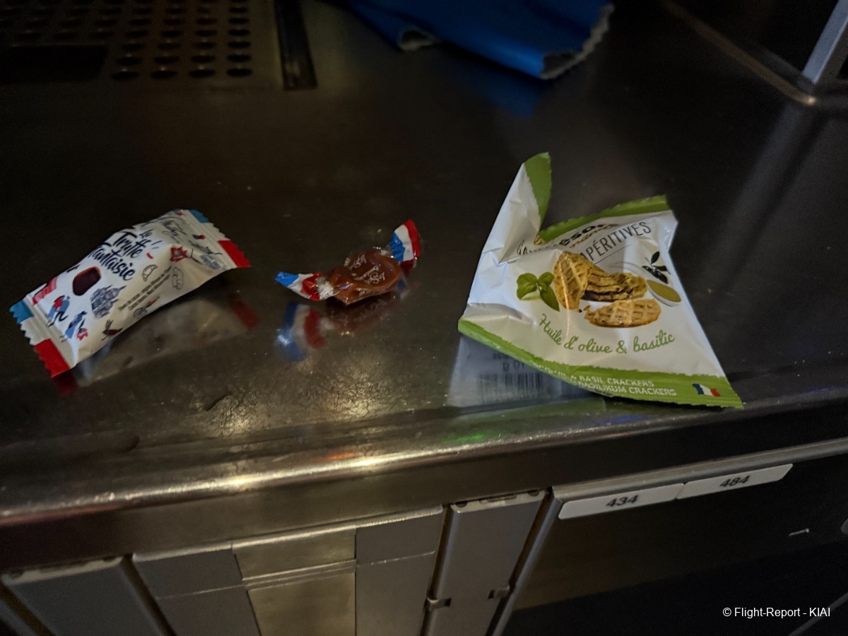 Je repasse ulterieurement en cabine et nous voici avec des nouilles épicées, des collations dont le gaspacho et du Duval-Leroy en brut et des collations dont la barre chocolaté et sablé pur beurre.