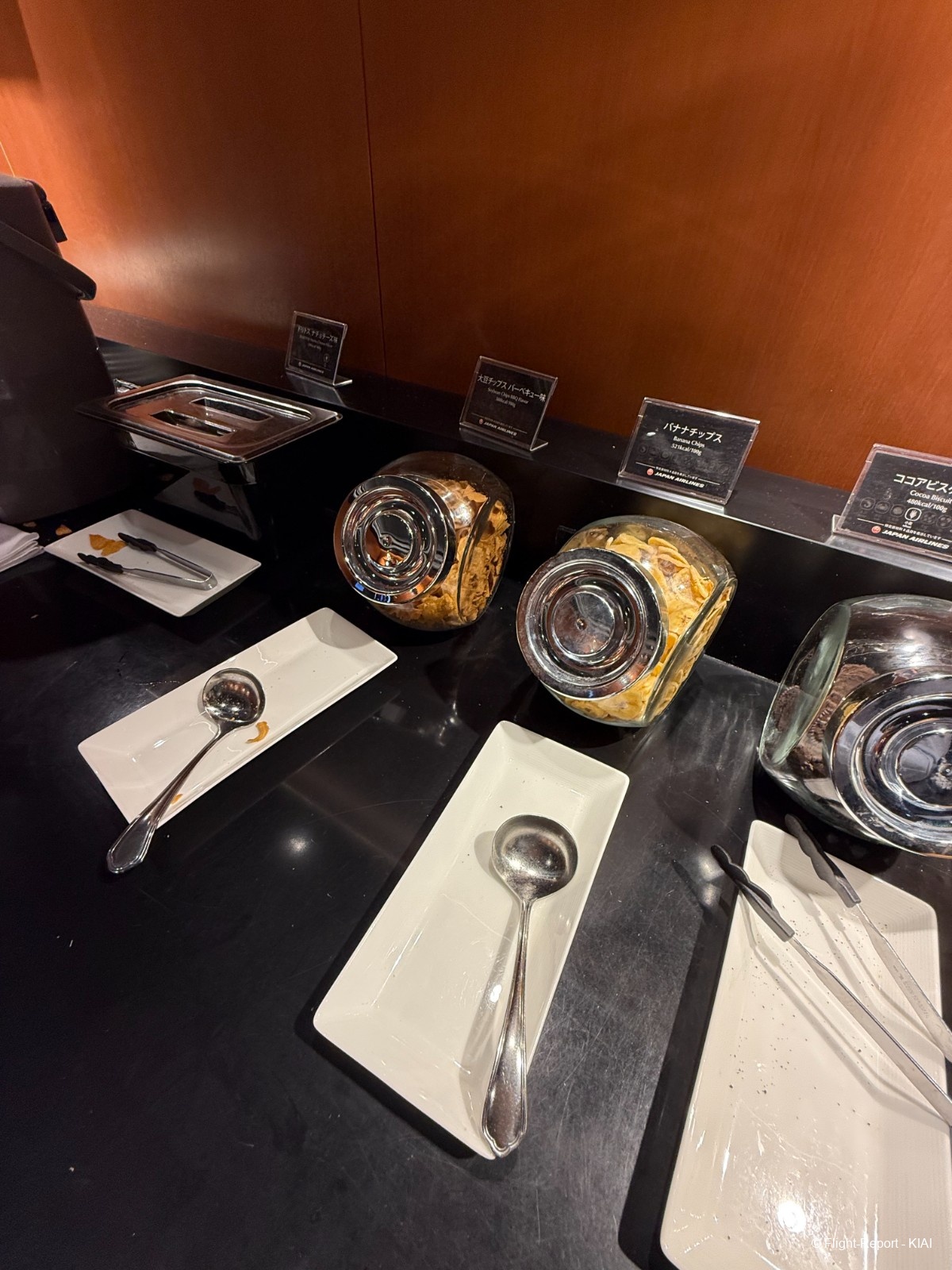 Dans le salon JAL, vous pouvez savourer une sélection de whiskys japonais, comme le Suntory Tomat ou le Johnnie Walker Double Black, ainsi que des cocktails préparés à la machine Samixir. Pour grignoter, des snacks tels que des banana chips et des chips de maïs sont à votre disposition pour compléter l'expérience.