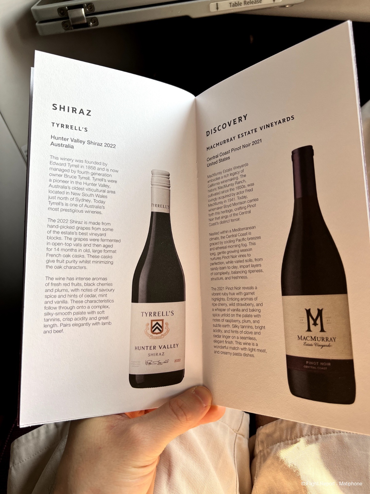 Je goûte le "Shiraz" australien qui est également très bon. La sélection de fromage est honorable pour une compagnie non-française.