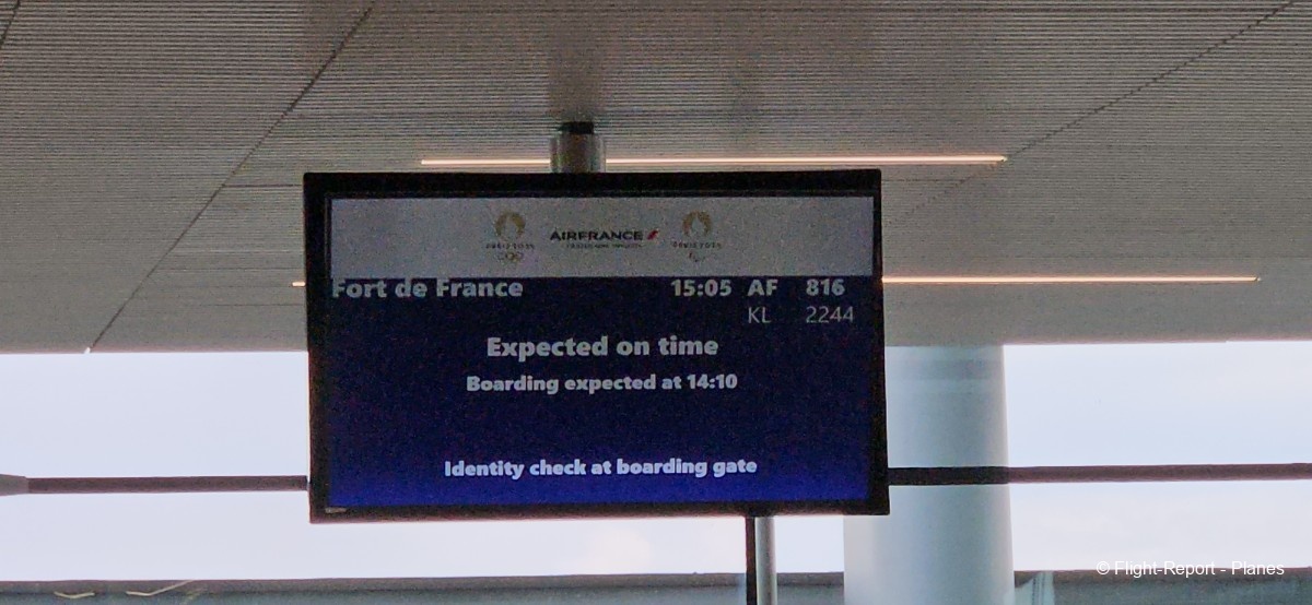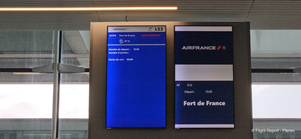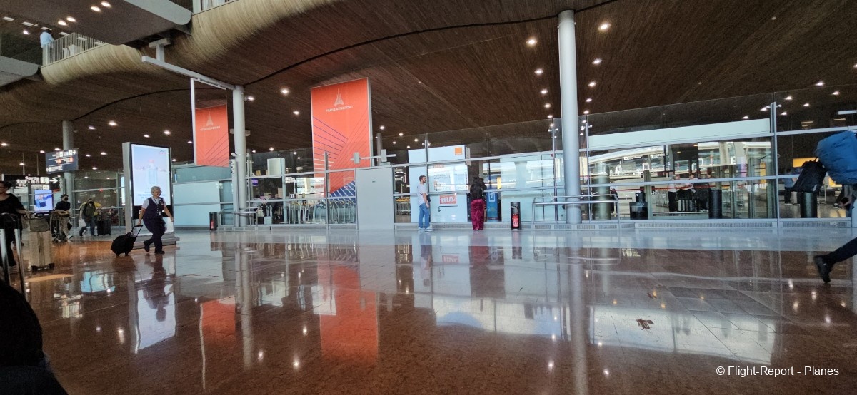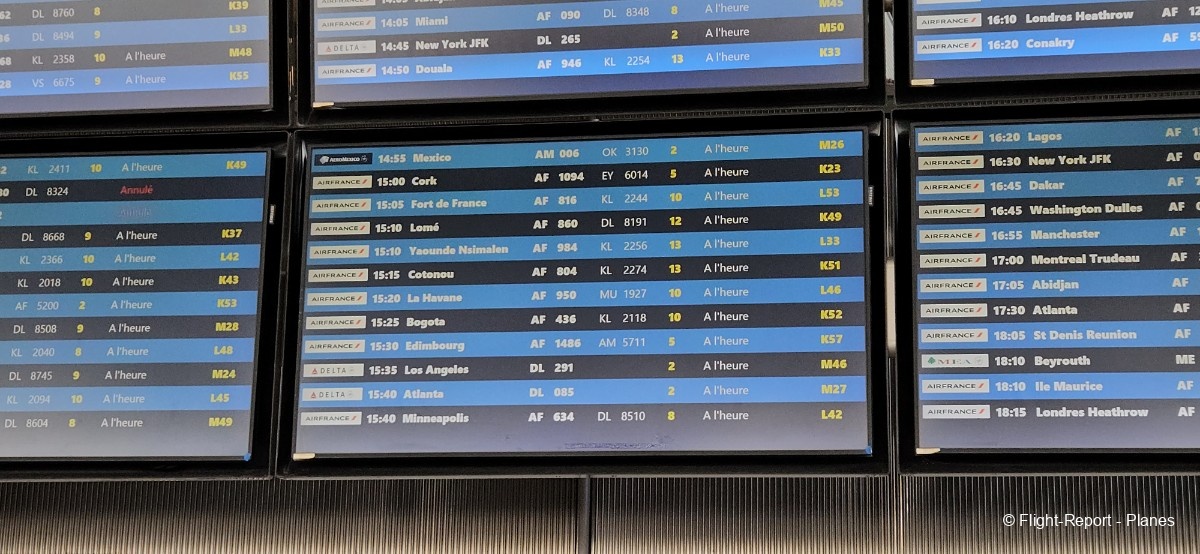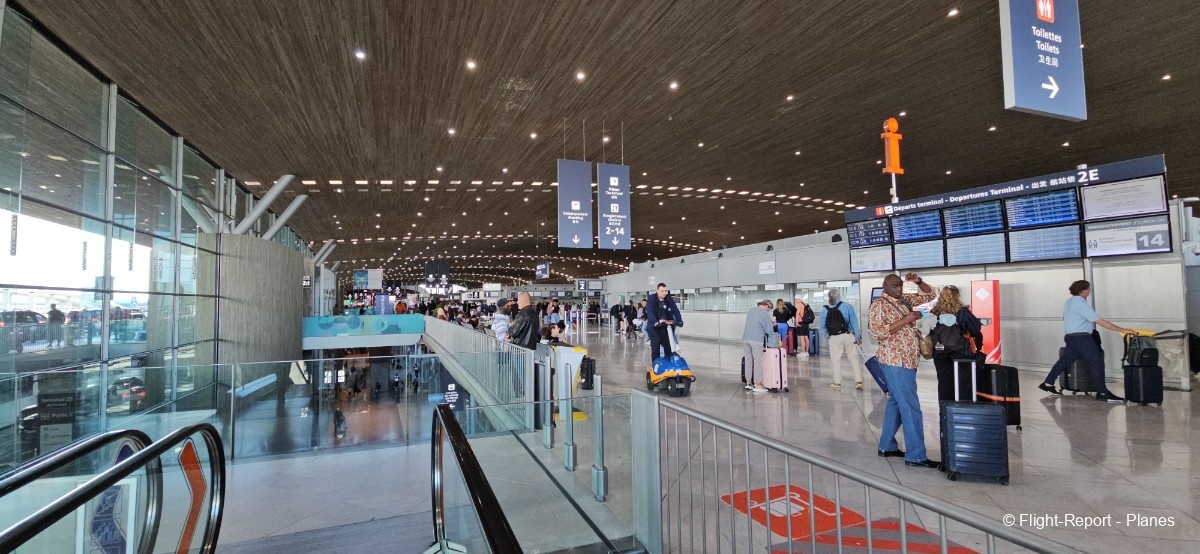 Arrivés à l'aéroport Charles de Gaulle par le RER B, nous atteignons le Terminal 2 vers 12h. Nous commençons par imprimer nos étiquettes bagages sur une borne automatique avant de traverser le terminal en direction du check-in n°10. Notre vol est prévu à 15h05, avec un embarquement programmé à 14h10.