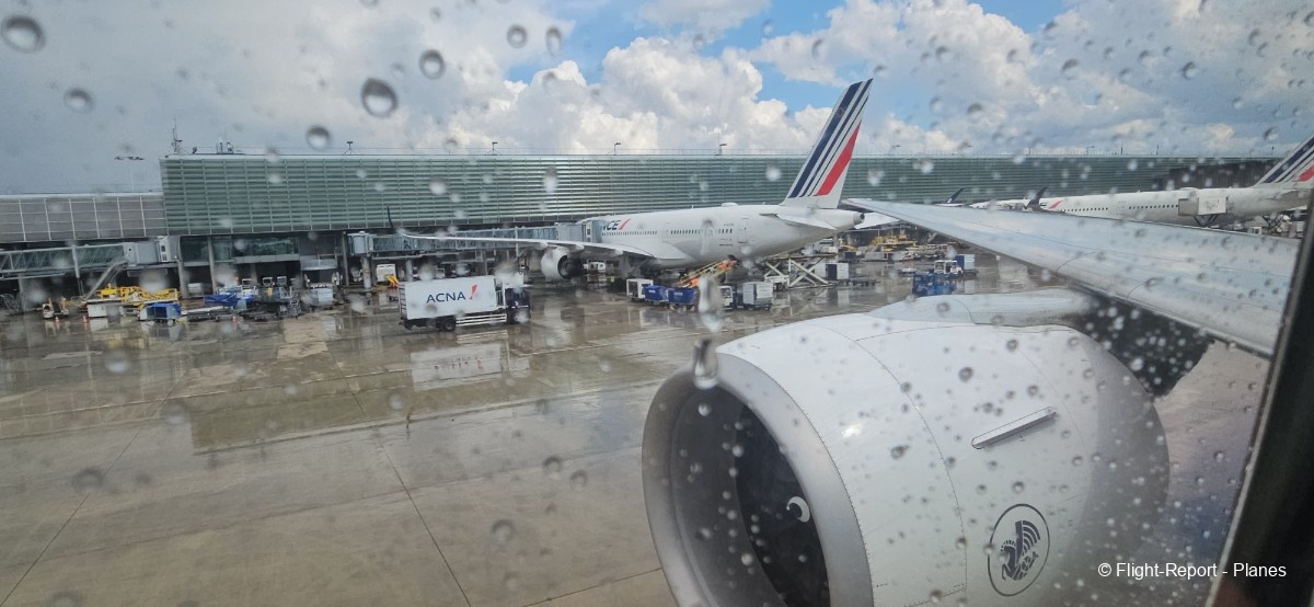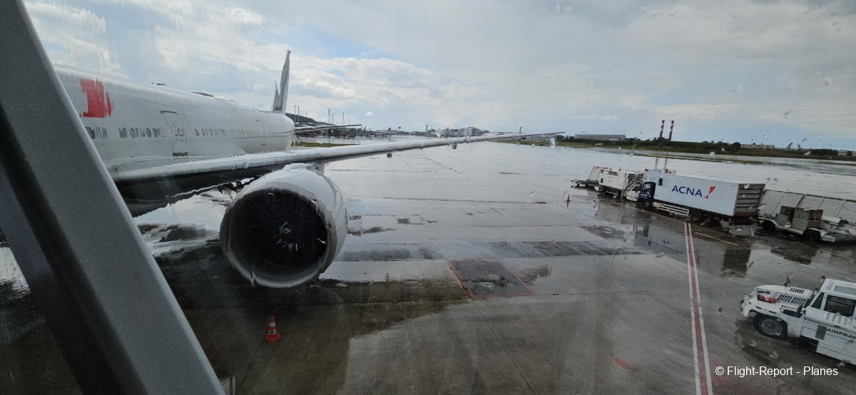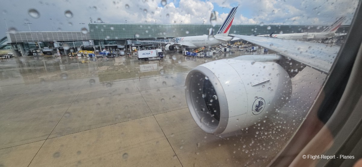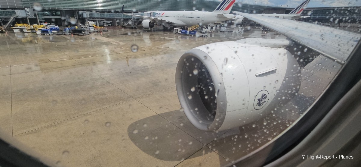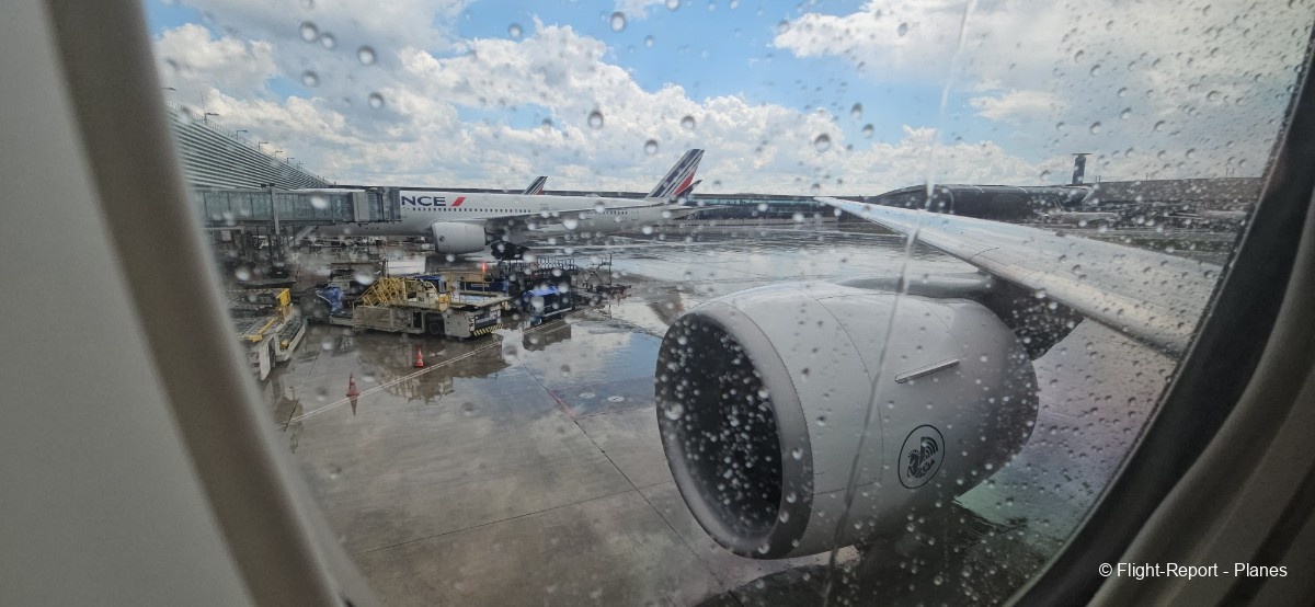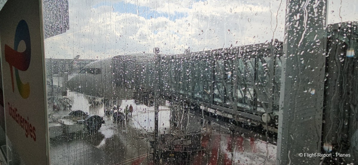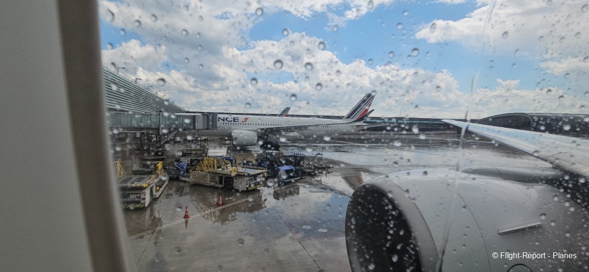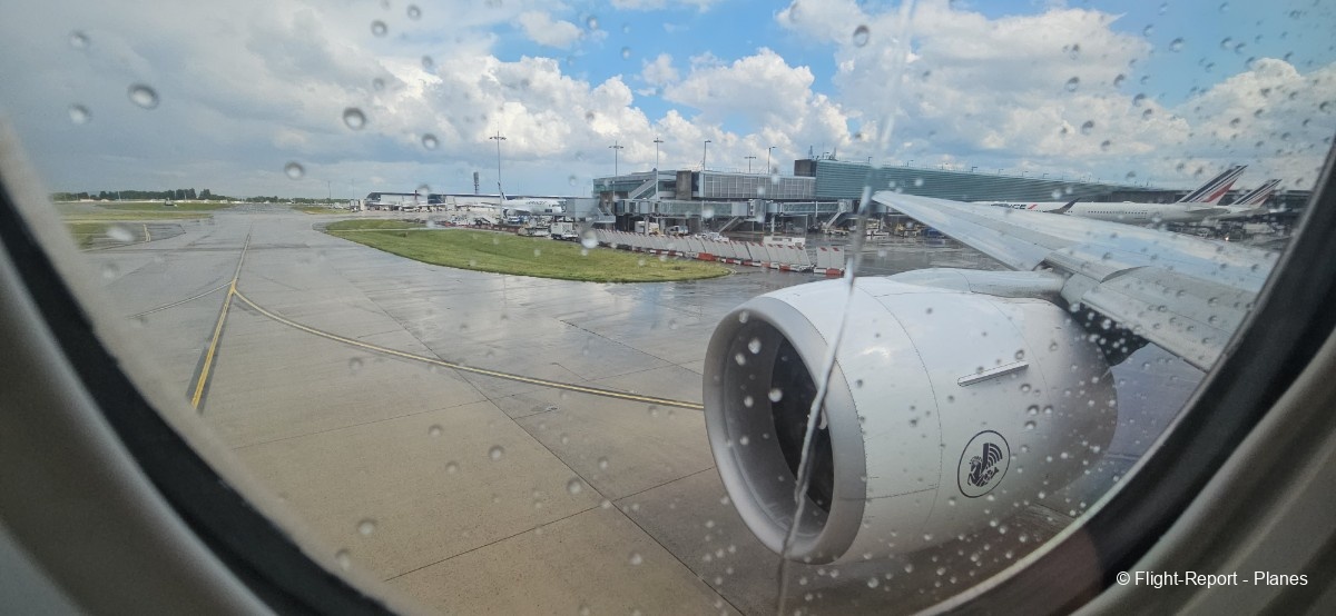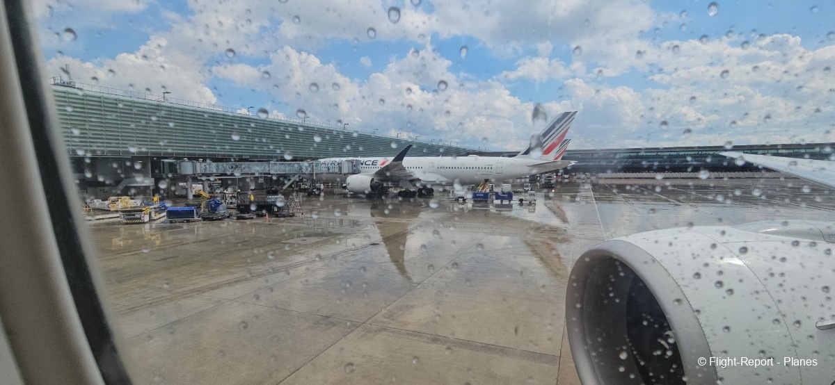 L’embarquement à la porte L53 commence à 15h19, avec un retard d’environ 1h09. La passerelle est longue et offre à nouveau une belle vue sur le tarmac, où l’on peut notamment apercevoir un A350-900 d’Air France en partance pour Atlanta. Nous patientons un peu dans la passerelle avant de monter à bord. Le temps est pluvieux, typique d’une journée parisienne en ce mois de juillet.