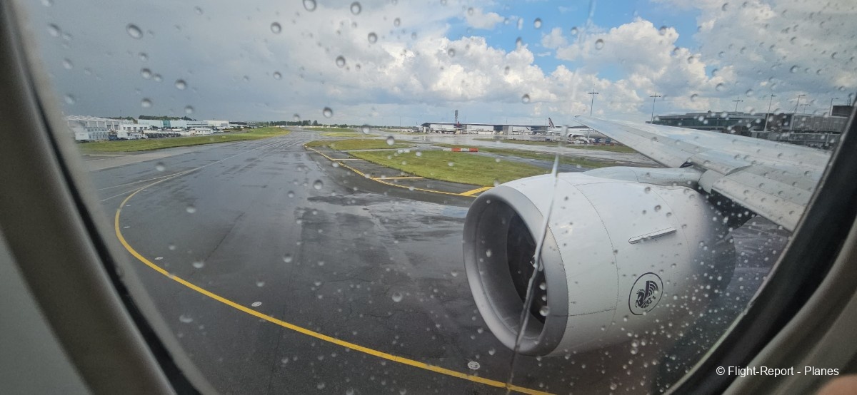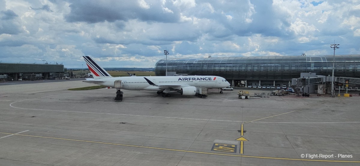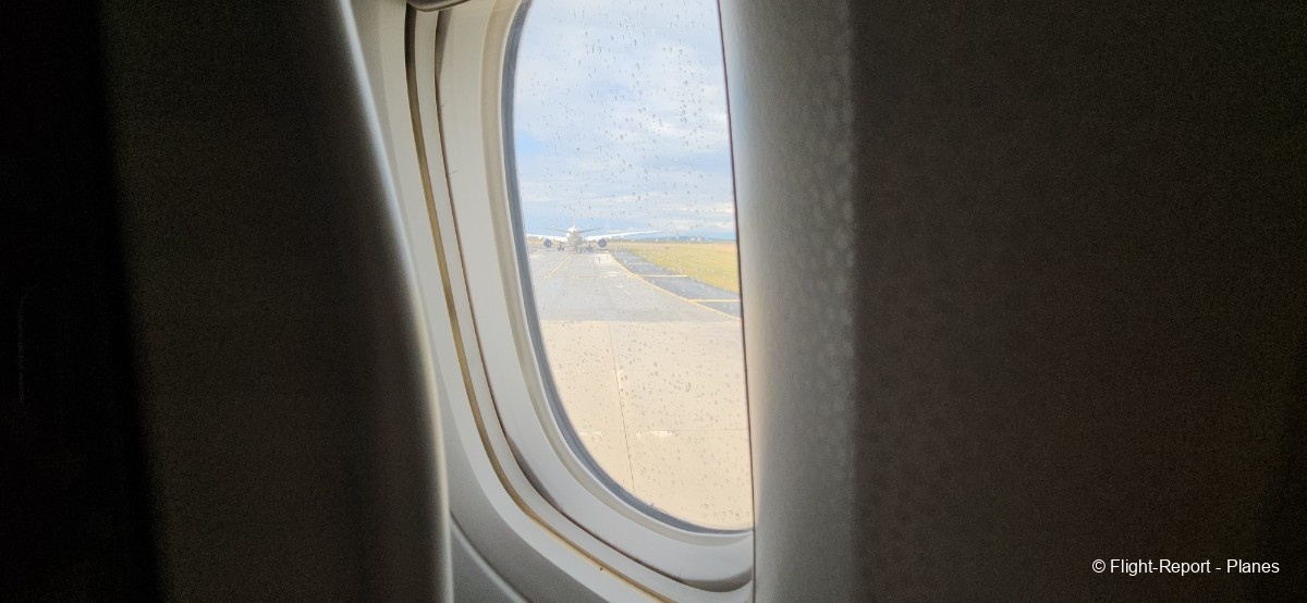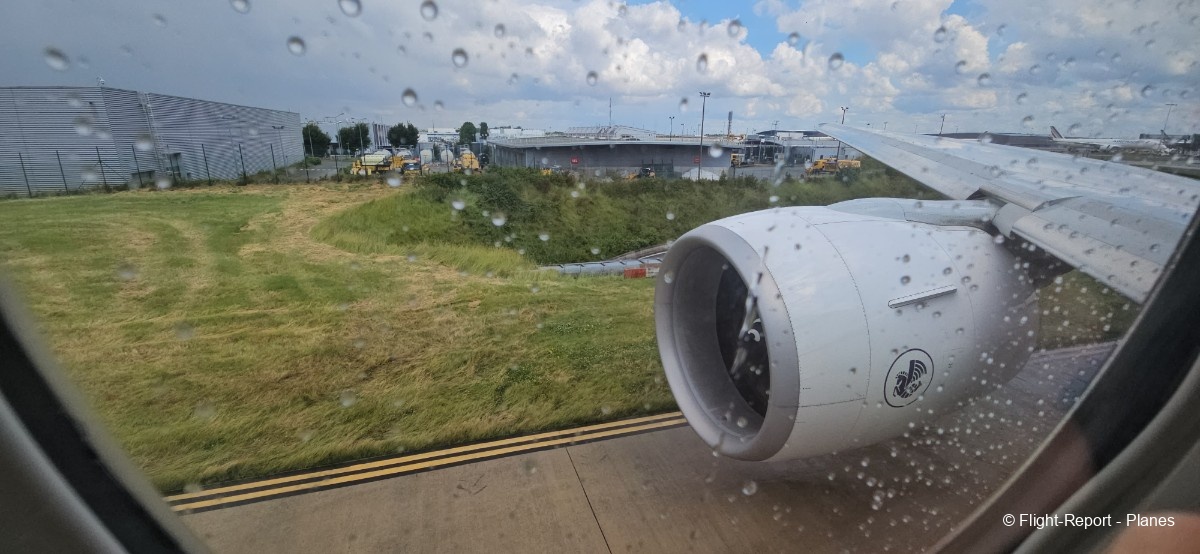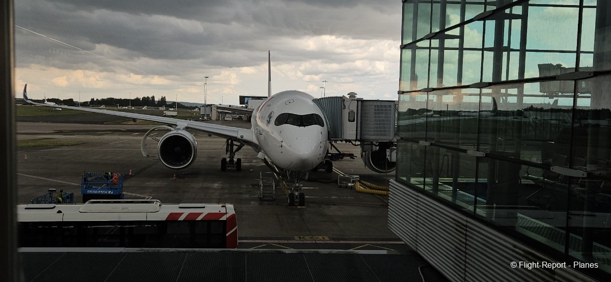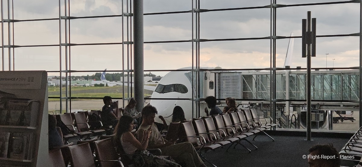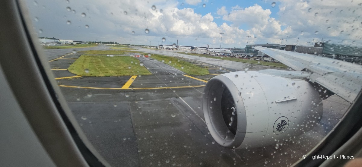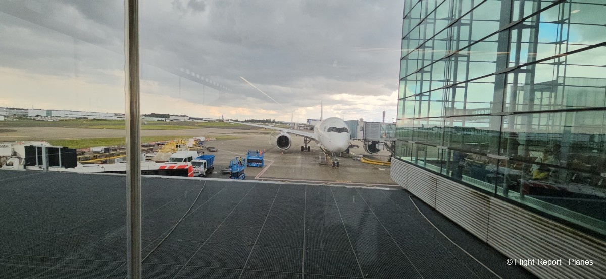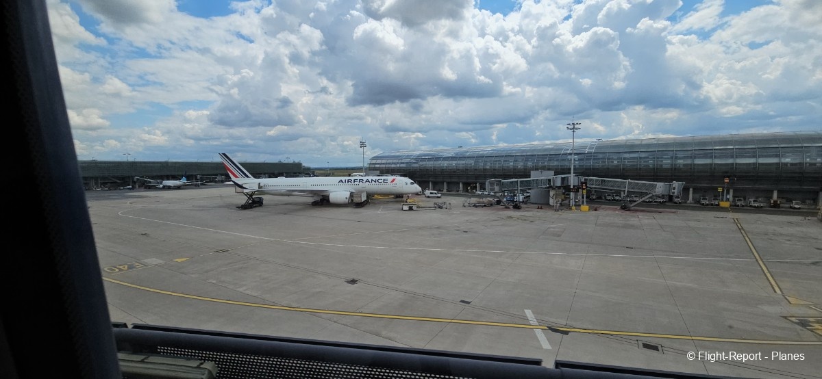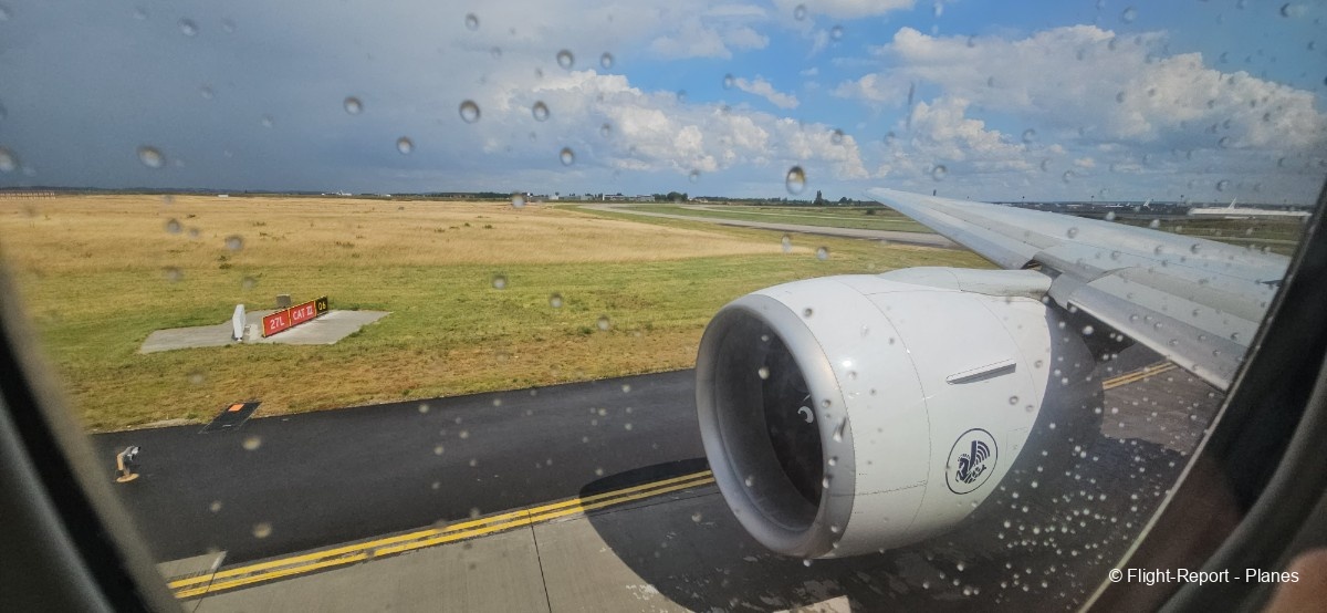 L’embarquement à la porte L53 commence à 15h19, avec un retard d’environ 1h09. La passerelle est longue et offre à nouveau une belle vue sur le tarmac, où l’on peut notamment apercevoir un A350-900 d’Air France en partance pour Atlanta. Nous patientons un peu dans la passerelle avant de monter à bord. Le temps est pluvieux, typique d’une journée parisienne en ce mois de juillet.