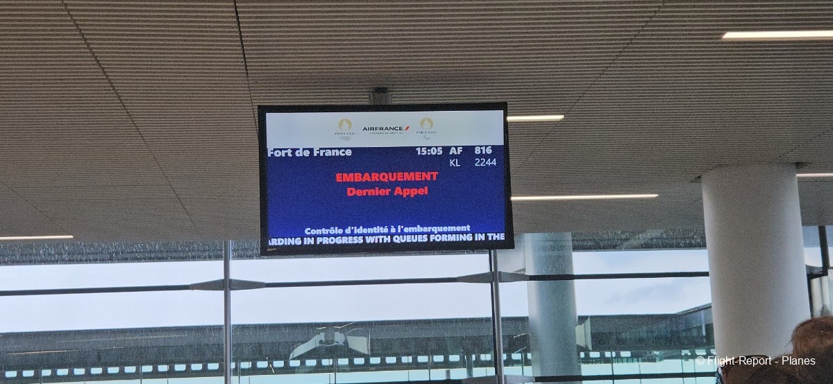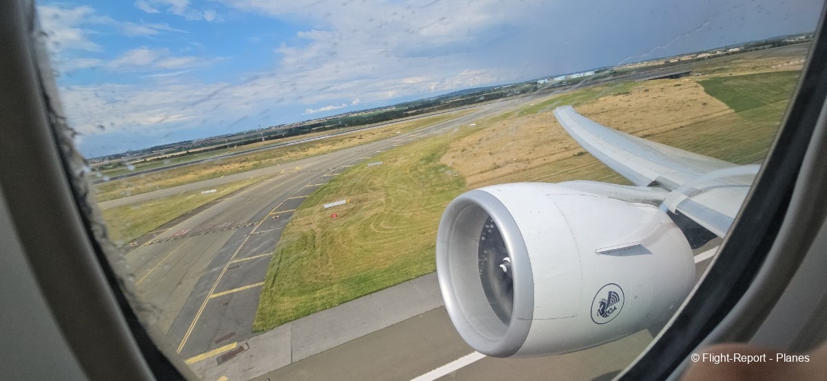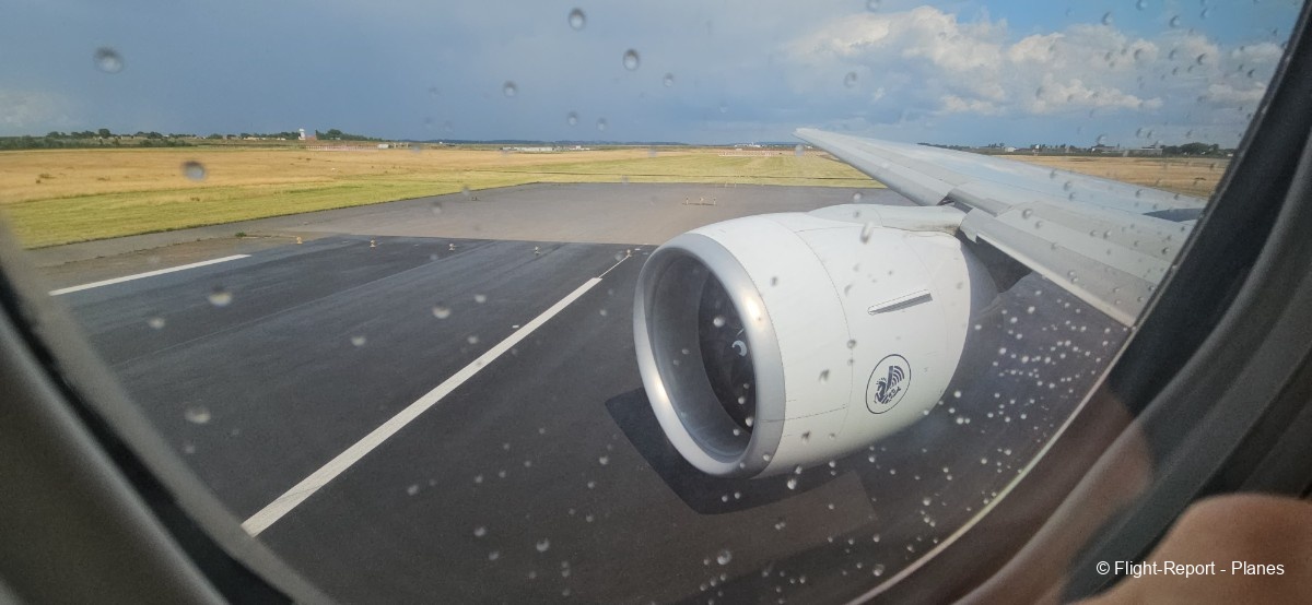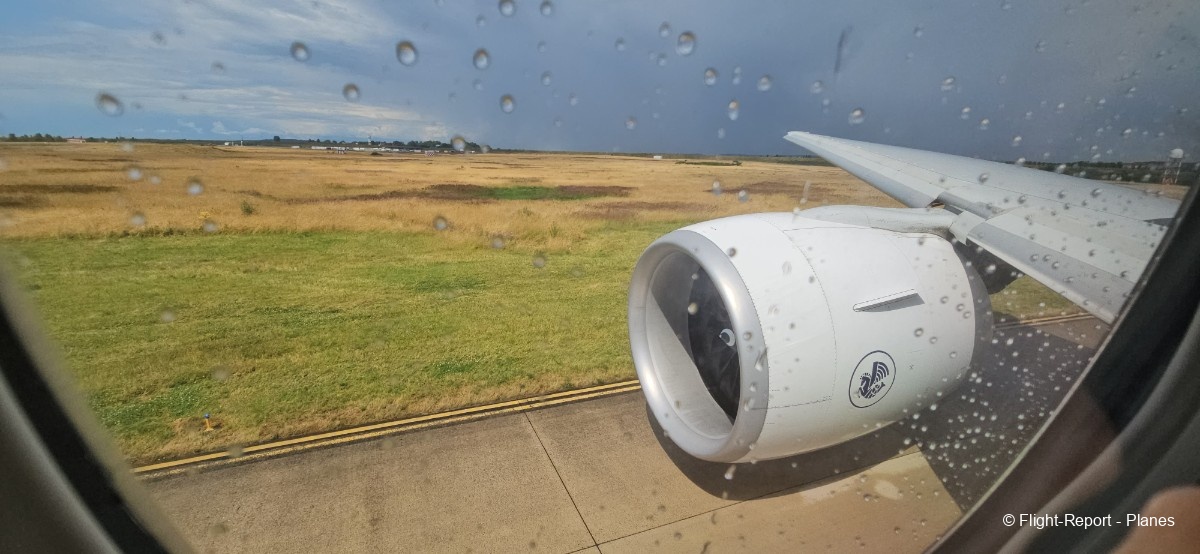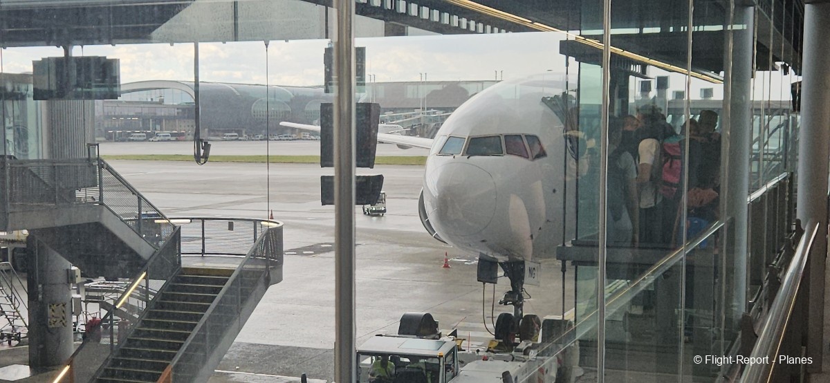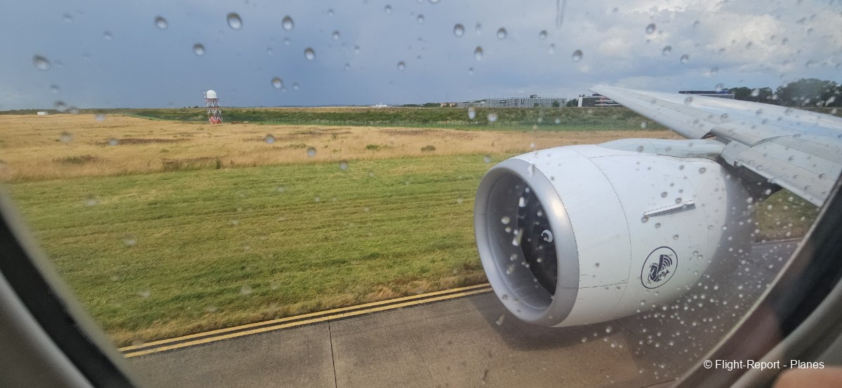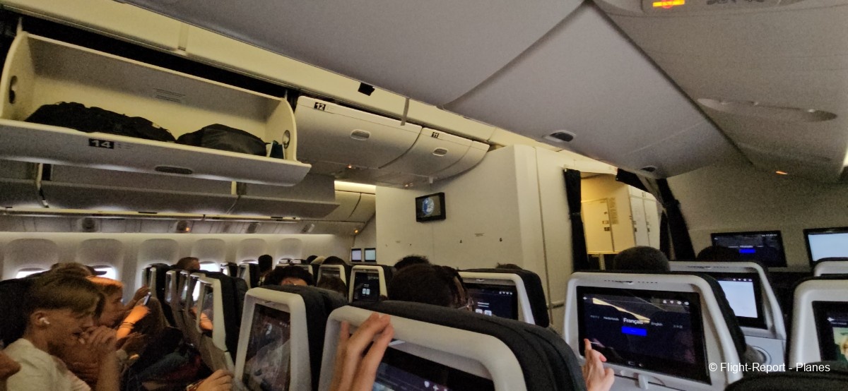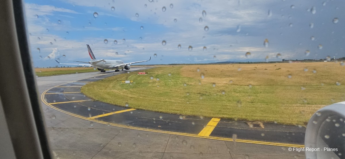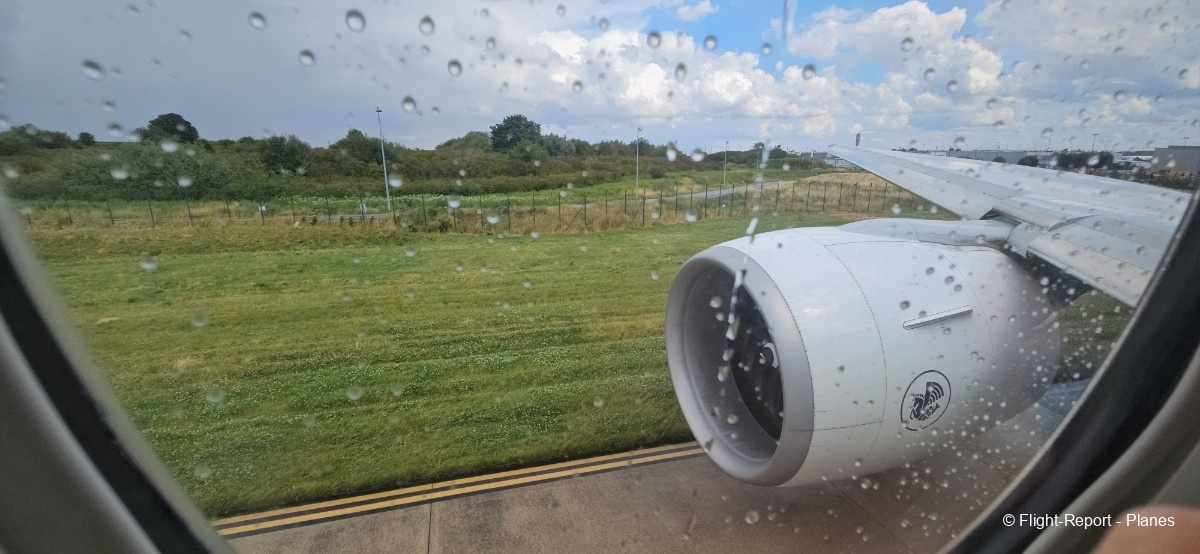 L’embarquement à la porte L53 commence à 15h19, avec un retard d’environ 1h09. La passerelle est longue et offre à nouveau une belle vue sur le tarmac, où l’on peut notamment apercevoir un A350-900 d’Air France en partance pour Atlanta. Nous patientons un peu dans la passerelle avant de monter à bord. Le temps est pluvieux, typique d’une journée parisienne en ce mois de juillet.