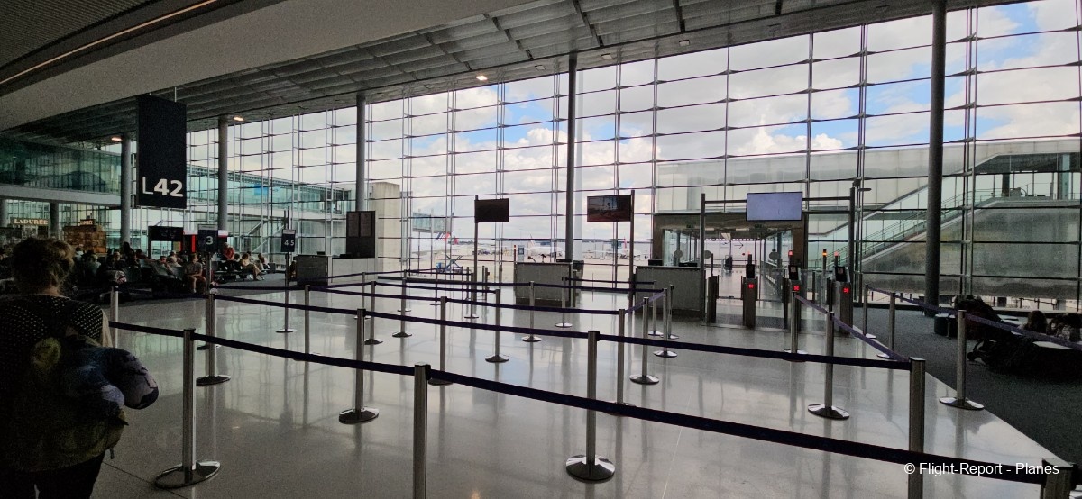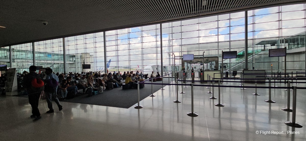 Arrivés au terminal, nous passons les contrôles de sécurité et nous installons dans la salle d’embarquement vers 14h. Nous profitons d’un passage rapide par les duty-free avant de rejoindre notre porte, la L53. Depuis cet emplacement, nous avons une superbe vue sur les avions aux autres portes ainsi que sur le taxiway G, où l’on peut observer les appareils se diriger vers la piste 27L.