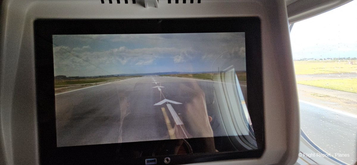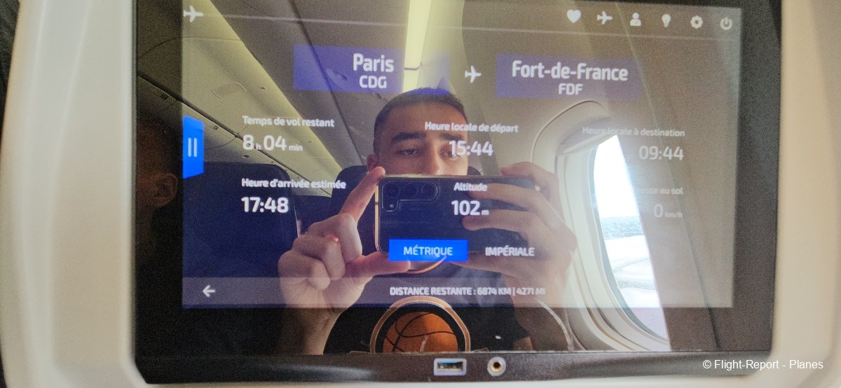 À 16h07, le push-back est effectué avec 1h02 de retard sur l’horaire initial. La durée de vol prévue est de 8h06 pour parcourir 6 876 km. Nous repoussons sur E4. Le démarrage des moteurs GE90 débute, avec ce son à la fois puissant et doux, toujours impressionnant à entendre. Pendant ce temps, la vidéo de sécurité Air France est diffusée en cabine.