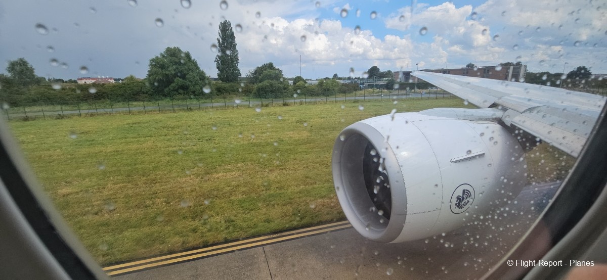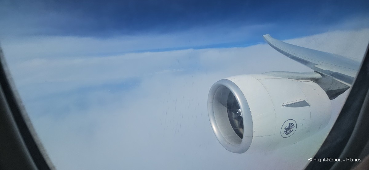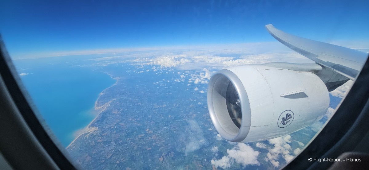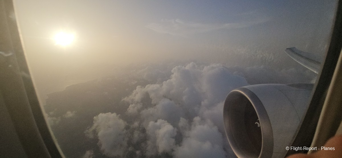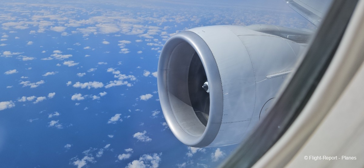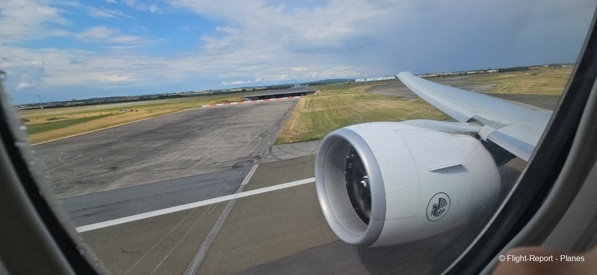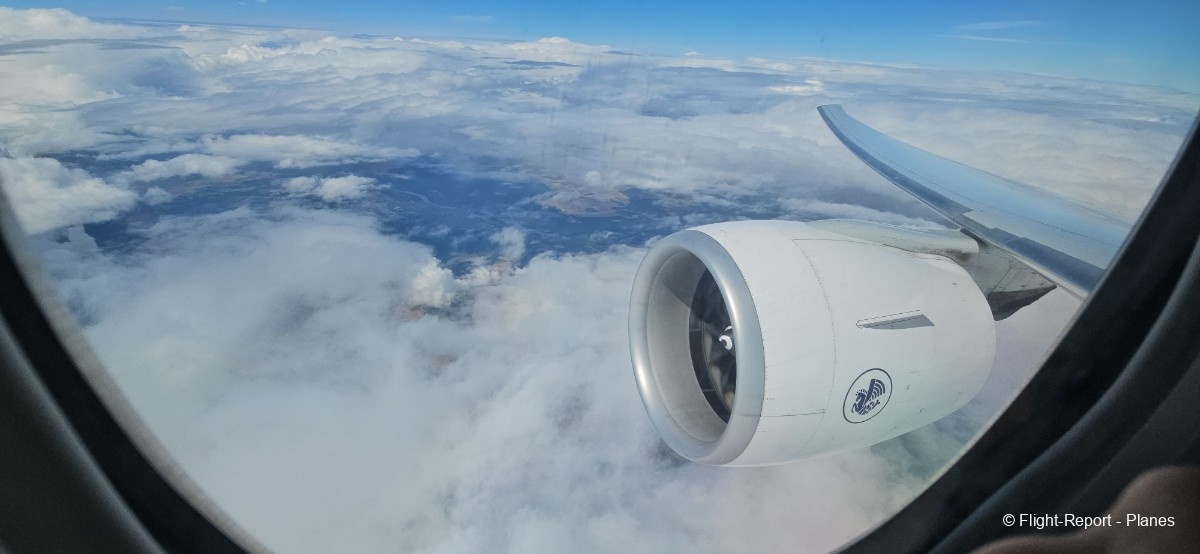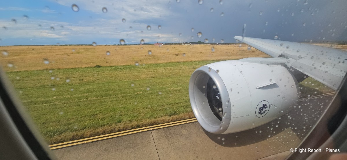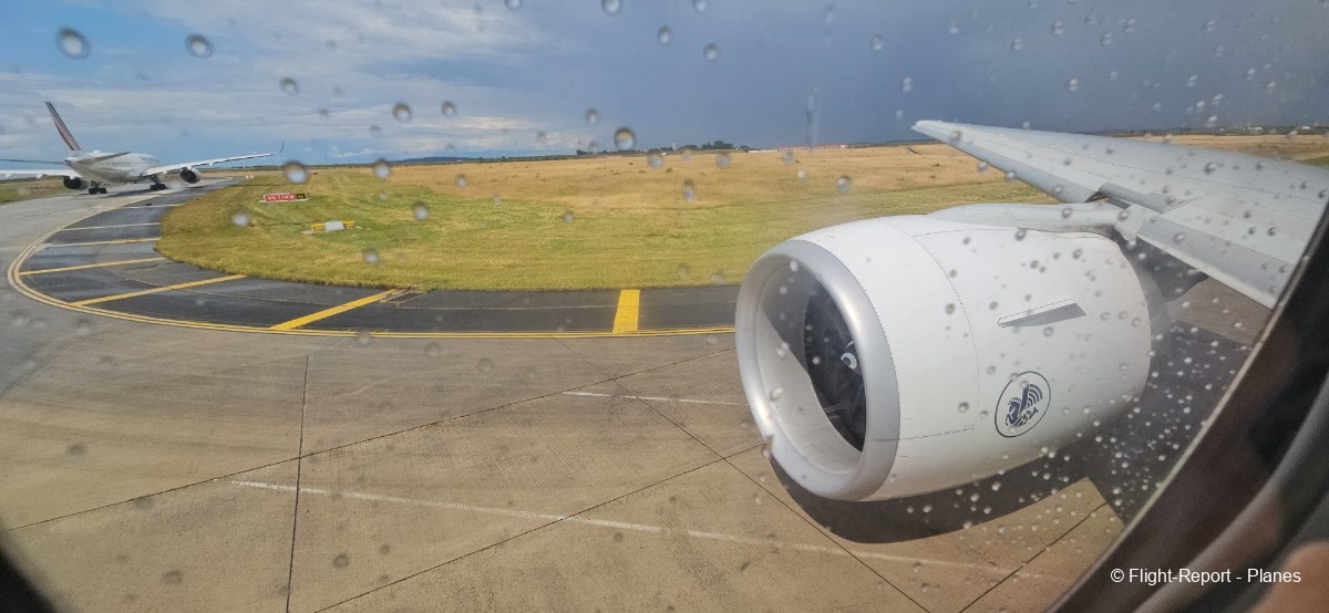 À 15h41, je prends place au siège 14L, offrant une vue exceptionnelle sur les moteurs GE90. Par chance, le ciel commence à se dégager. Le commandant de bord nous informe que le retard est dû à des difficultés d’approvisionnement du catering et à un point technique sur un siège.