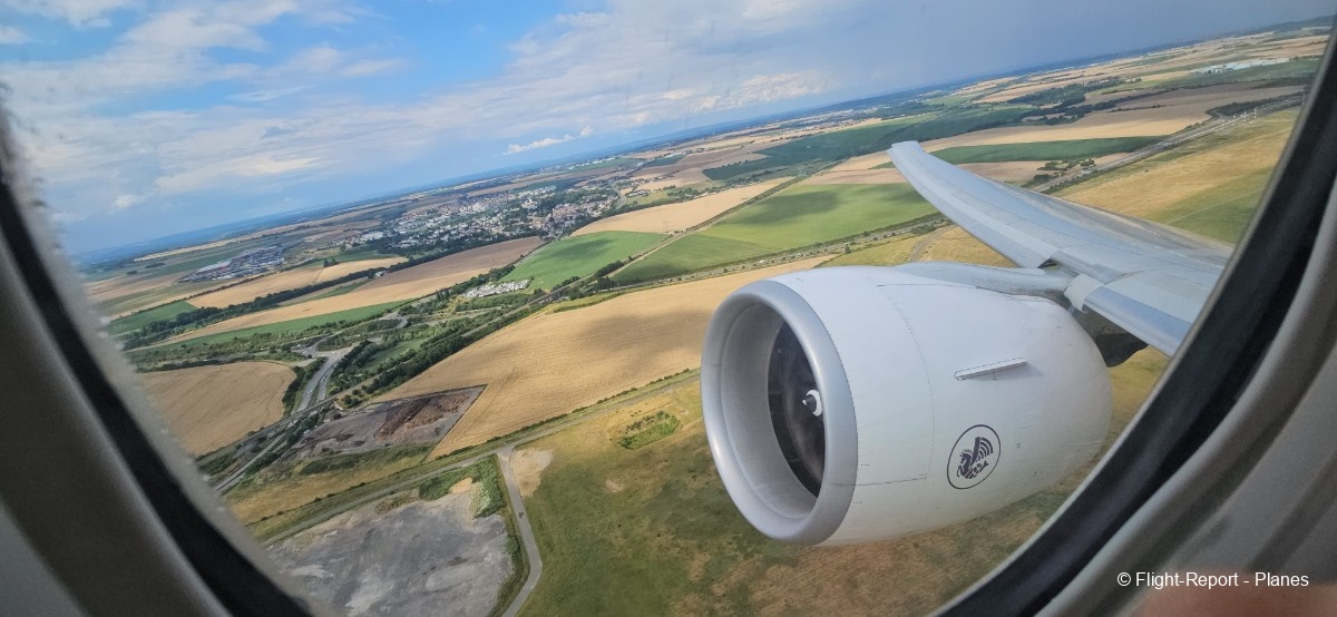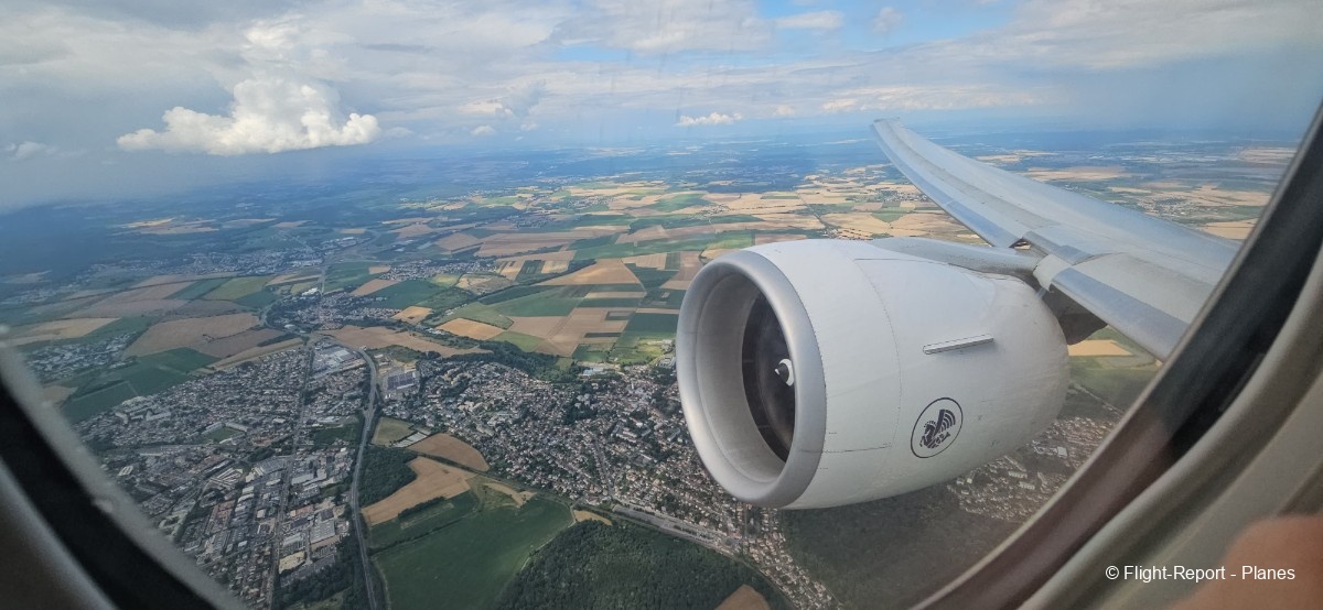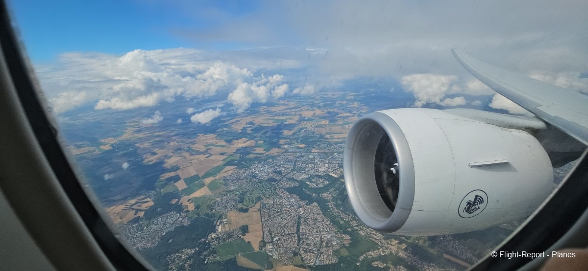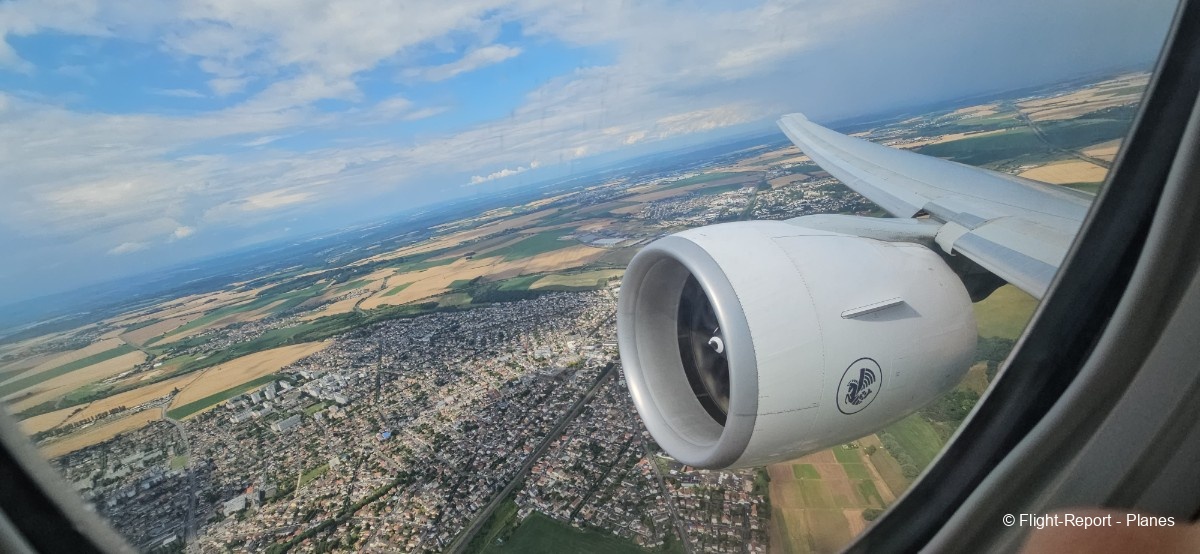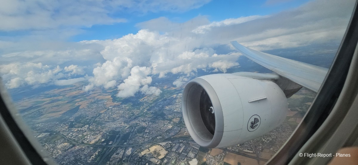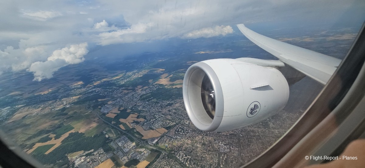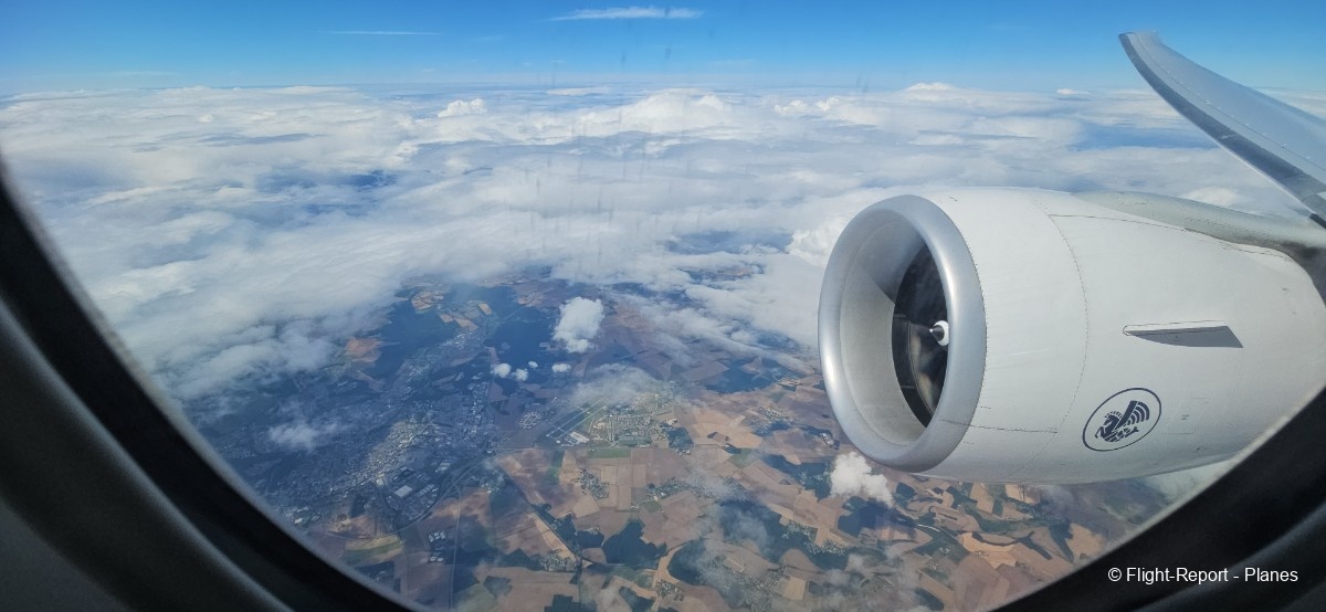 Depuis mon hublot, j’aperçois Goussainville quelques instants après. Les flaps et slats se rentrent progressivement, et au-dessus de Cergy, nous traversons la couche nuageuse en pssant les 10 000 pieds.